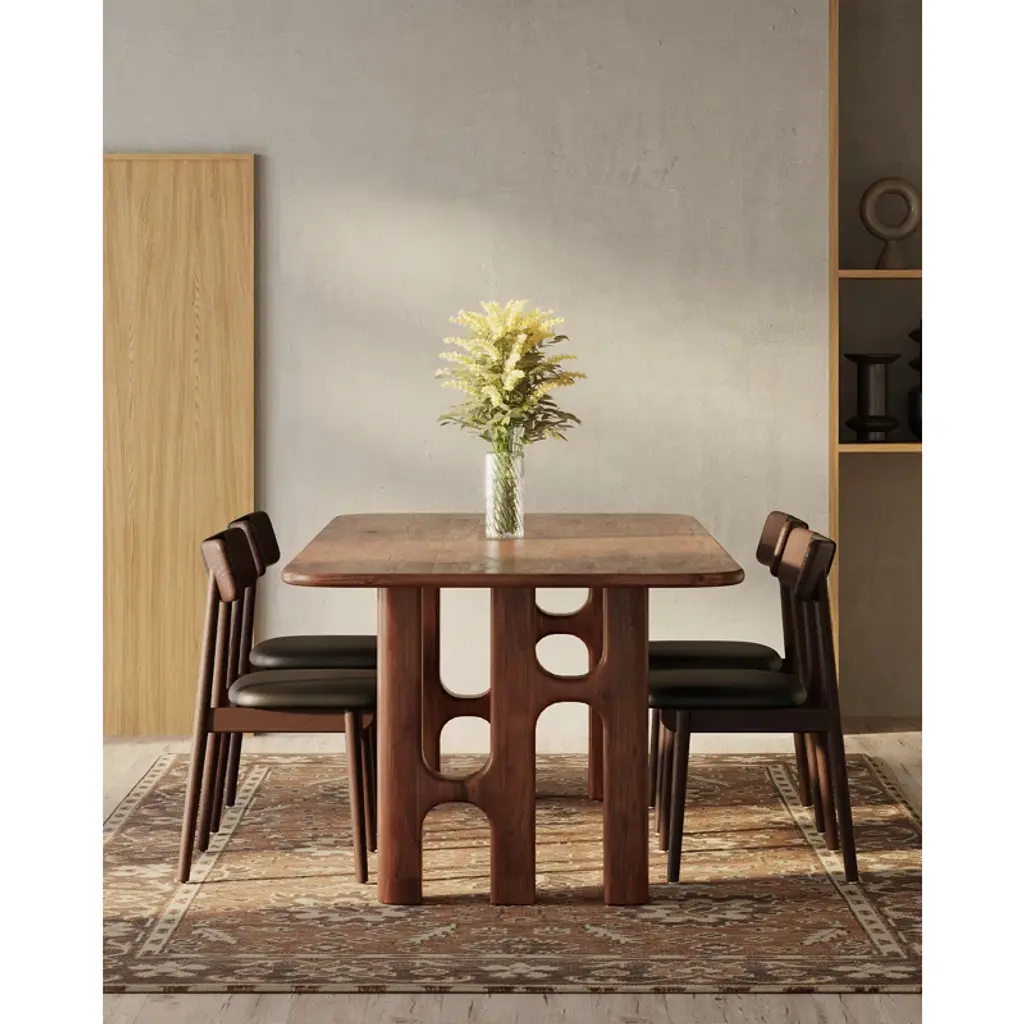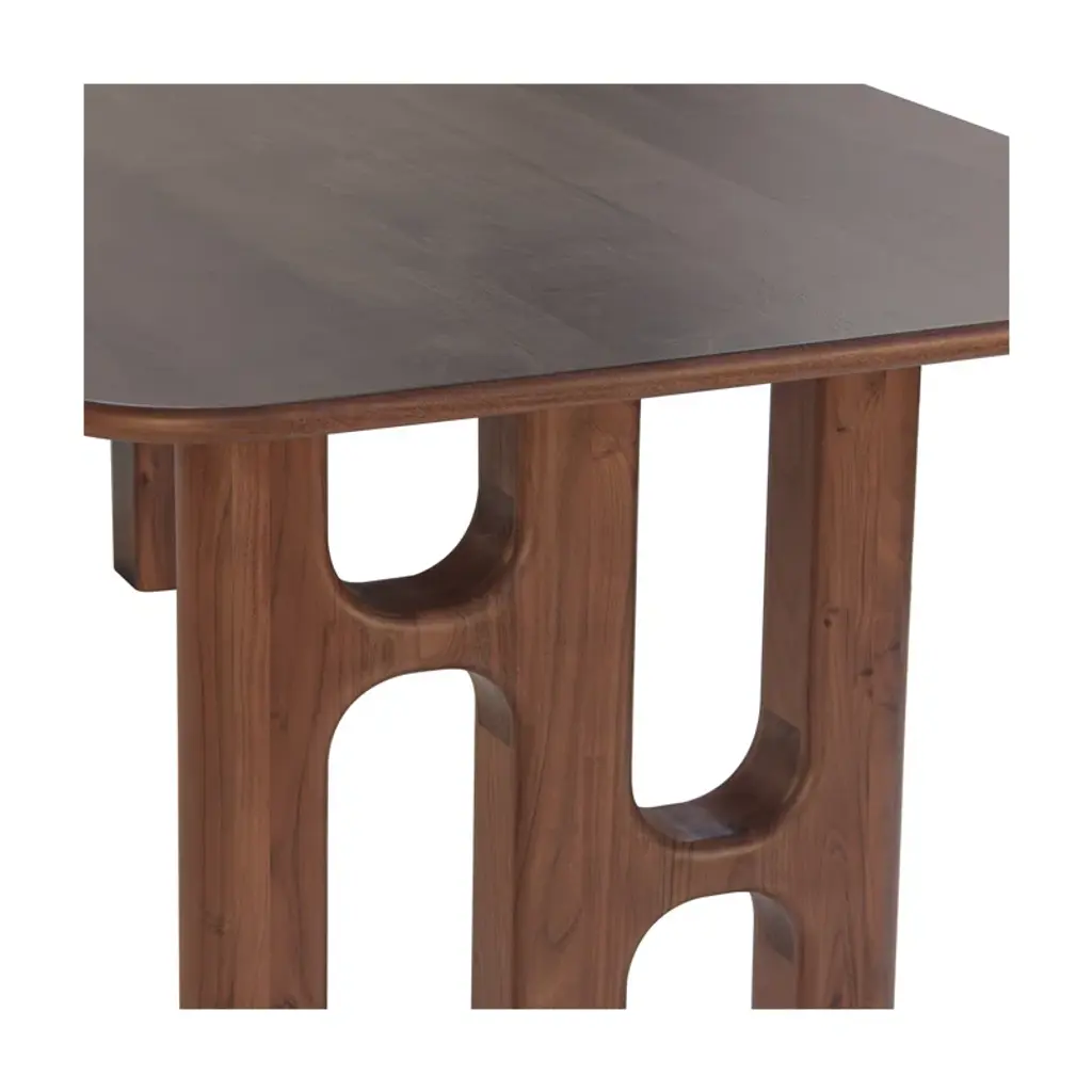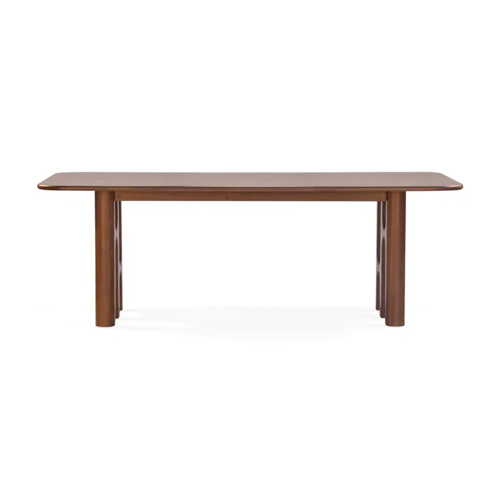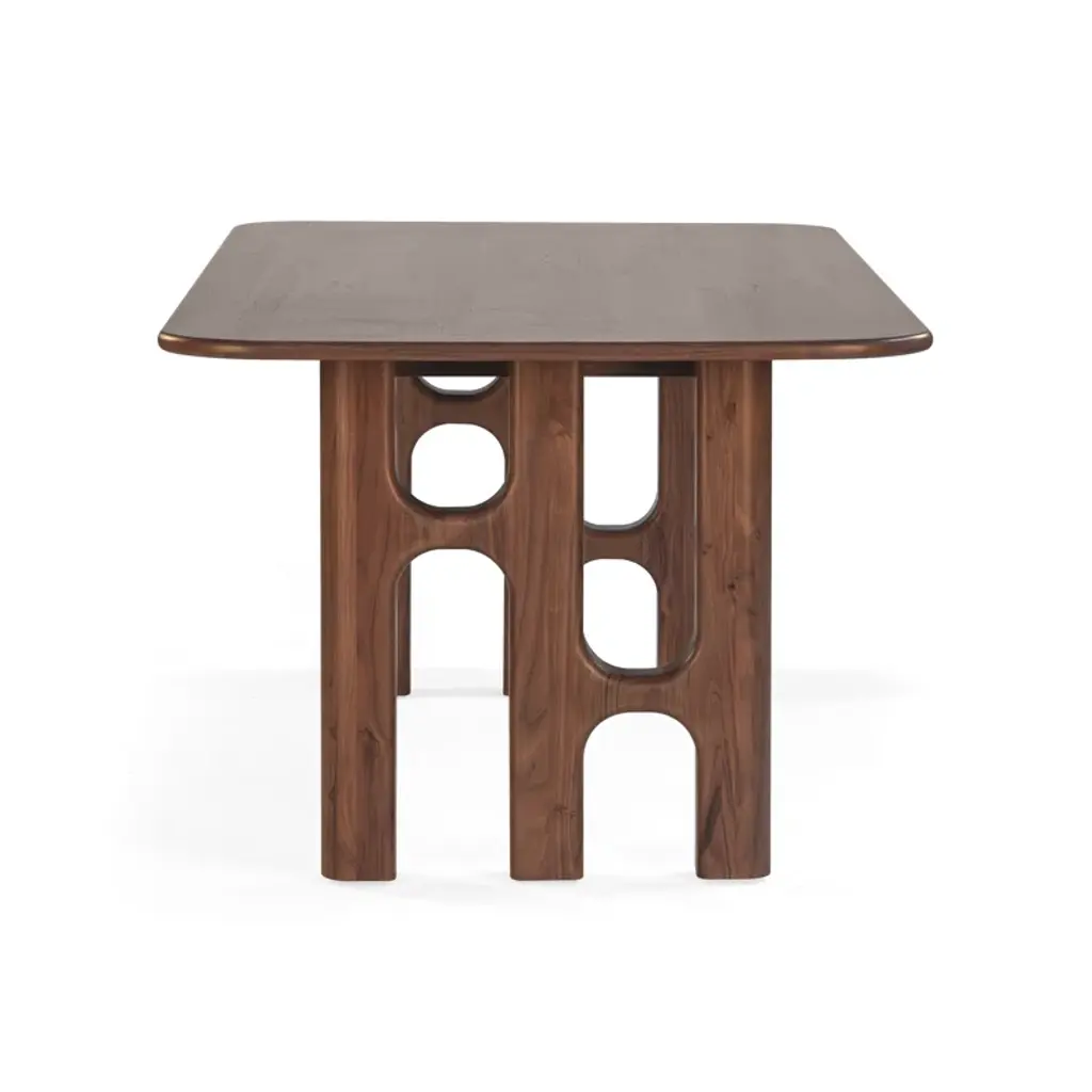 Inspired by the coastal rock formations of southern Italy, the Kicki dining table adds a sculptural element to any dining space. Two carved, solid wood leg pedestals support a softly profiled wood top, finished in a warm, walnut stain.