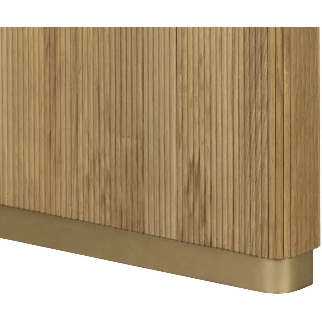 The Kalla Dining Table brings form and function to life. Crafted with a rustic oak veneer table top with a chamfered edge. Vertical reeding on a solid oak wood base with brushed gold steel detailing at the bottom finishes the look. As wood is an organic, porous material, these pieces will contain natural variation of texture and may also exhibit fine indentations and cracks. Wood pieces will also display a disparity of colour and grain, and visible knots and burls that add to the character of each piece.