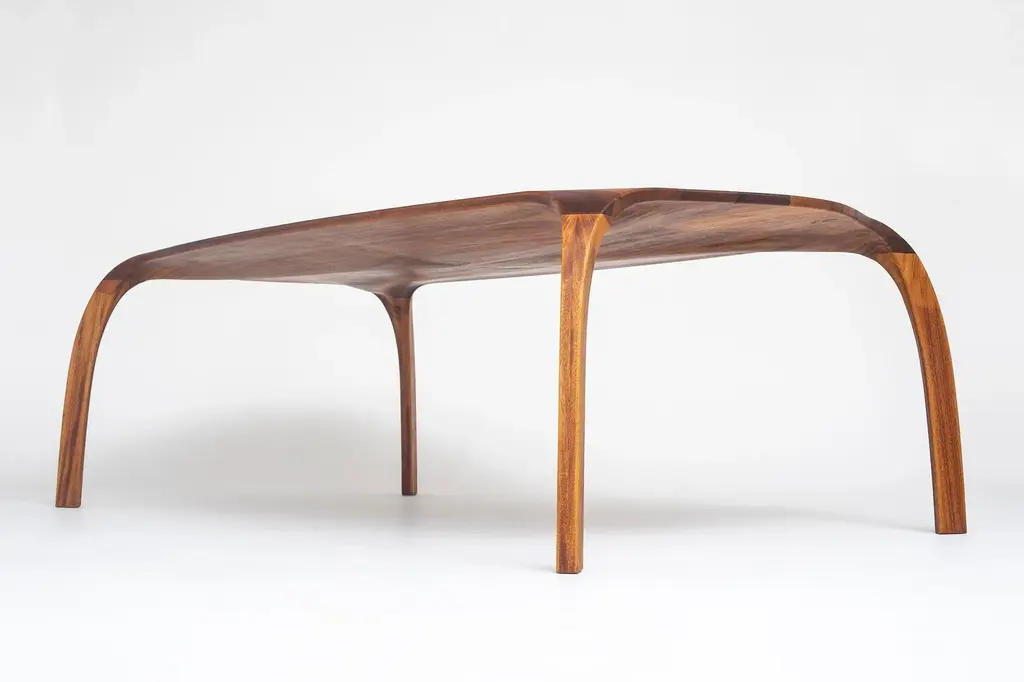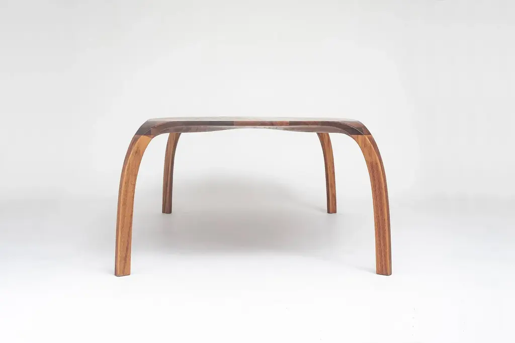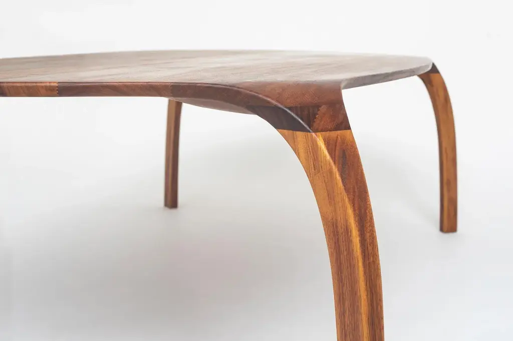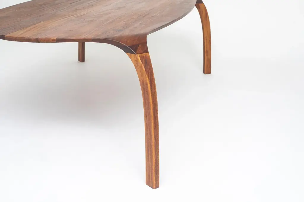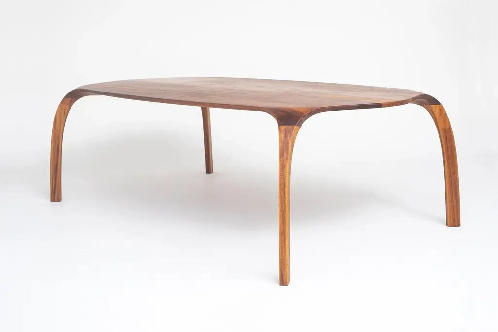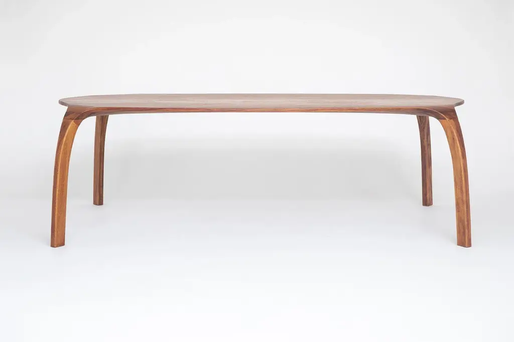 Kaona dining table by Henka Lab Limited Edition Dimensions: H 75 x W 122 x L 240 cm Materials: solid Iroko wood, oil, natural wax finish Weight: 80 Kg Series limited to 100 signed and numbered copies. Kaona table arises as an investigation of circular and elliptical geometries through a very simple conceptual sequence of stretching transformations. An ellipse is obtained enlarging a circle, creating a bigger functional surface. By stretching four points of this new geometry four legs start to grow, becoming a new living object. By doing so, the dining area is conveniently lifted from the floor, solving it's structural and functional requirements.