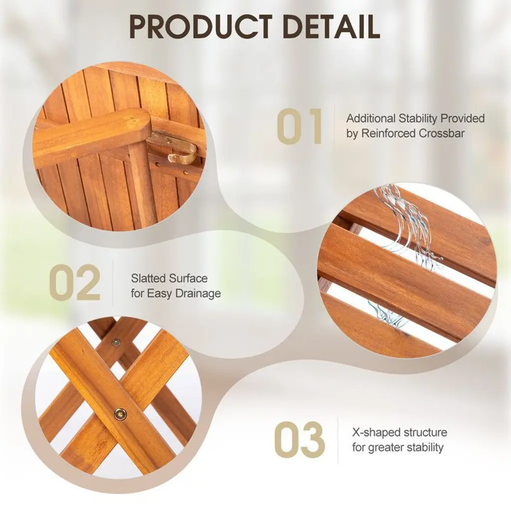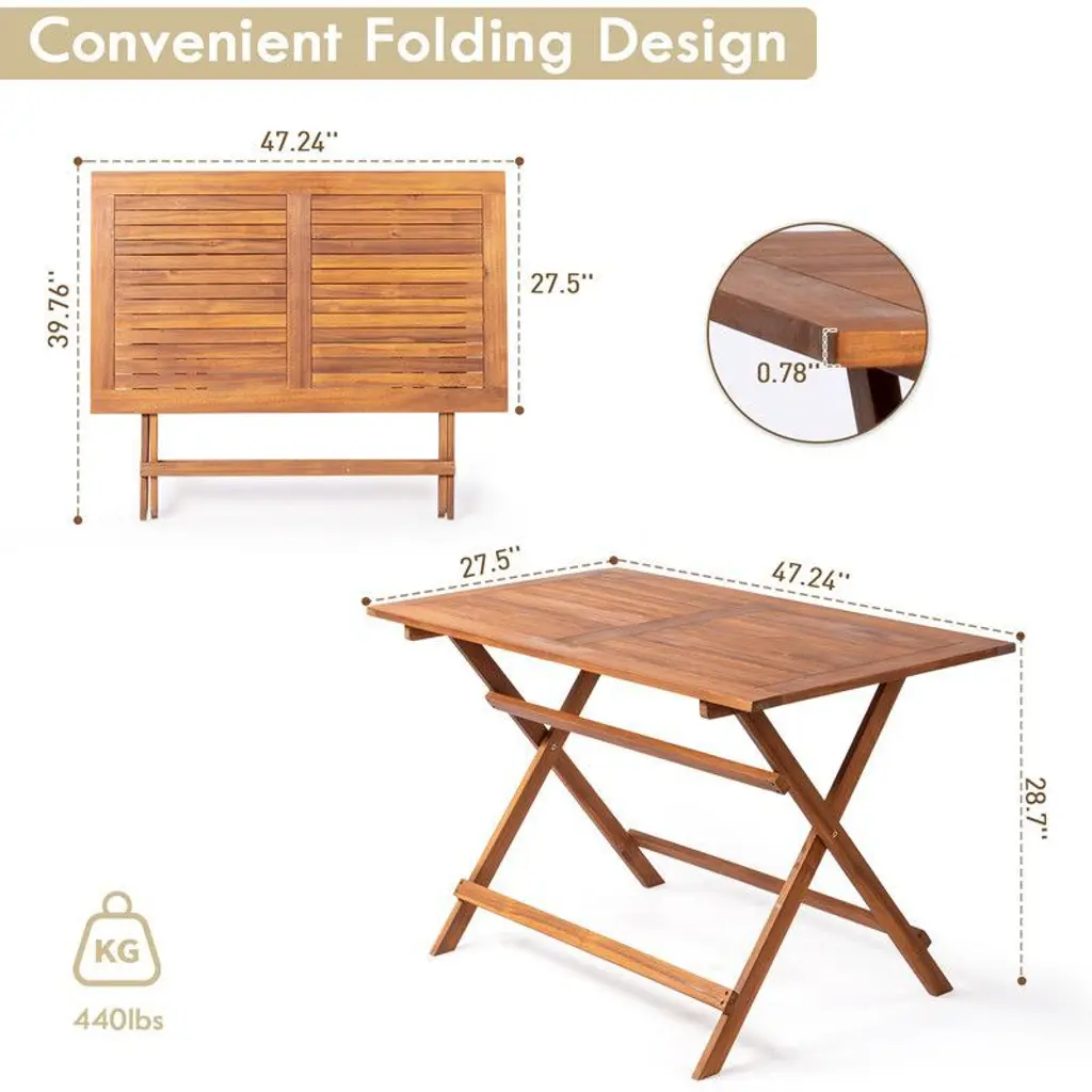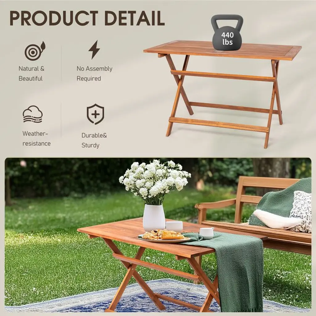 The table is crafted with solid acacia wood, a tropical hardwood that resists extreme weather conditions, ensuring year-round durability and longevity.Thoughtfully designed with a folding feature allowing you to easily pack and store away the table, offering both convenience and saving valuable space