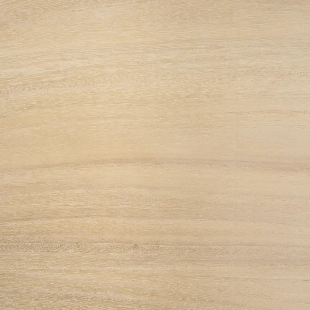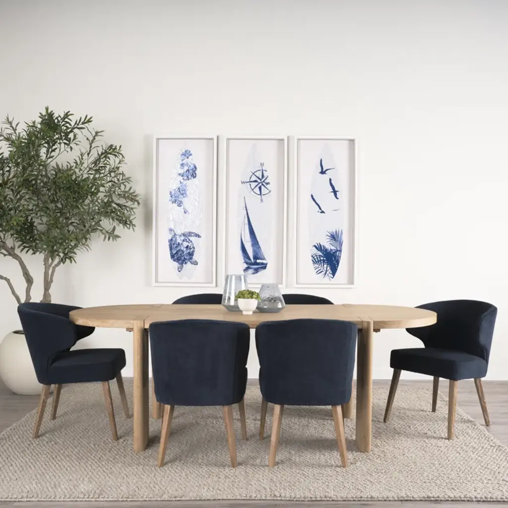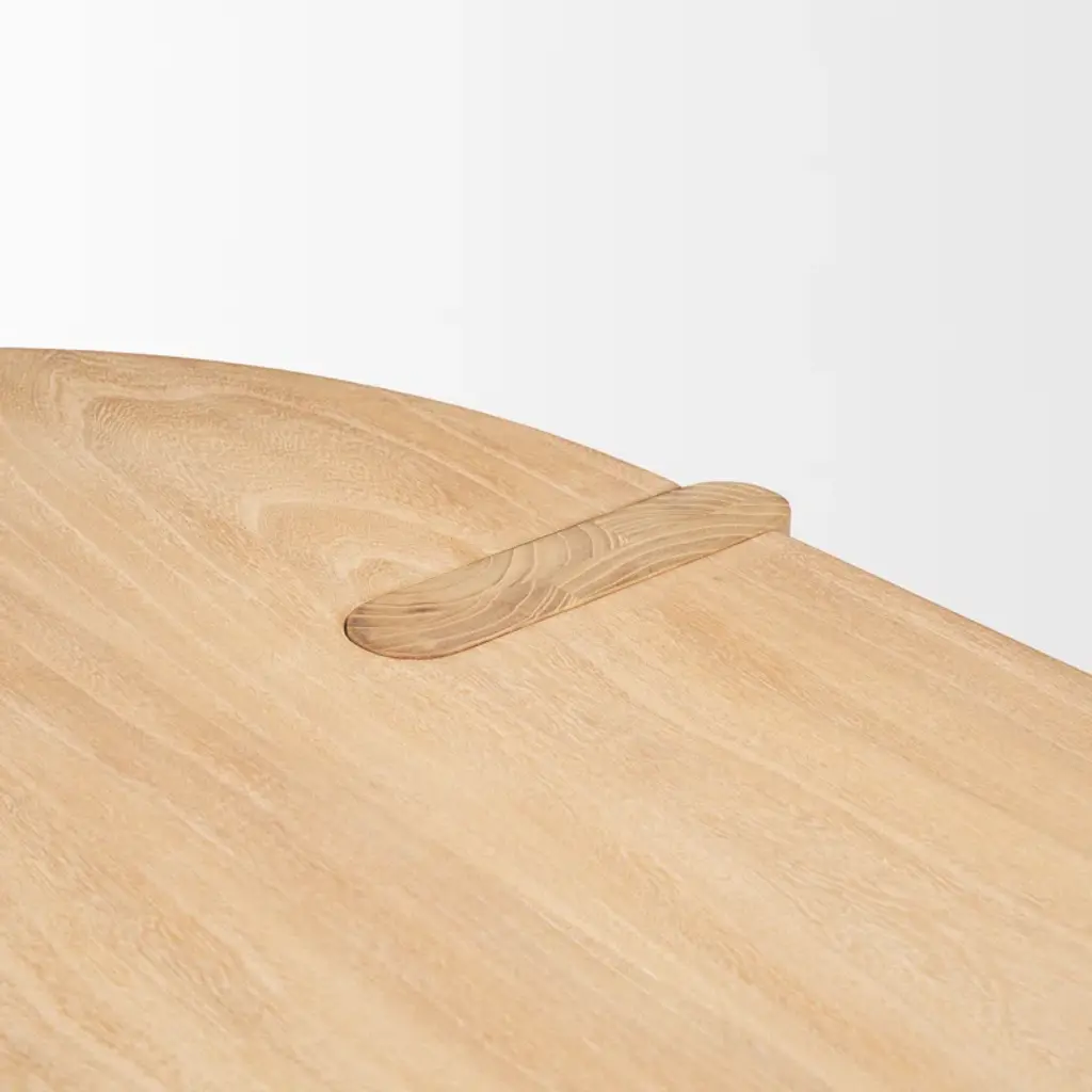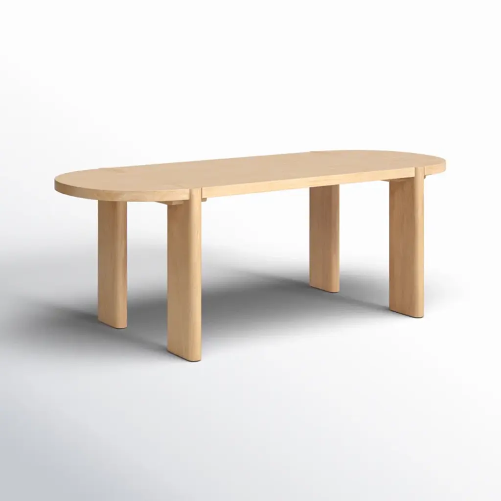 This dining table features an oval table top and is constructed from solid elm wood that is finished with a natural, light brown stain.