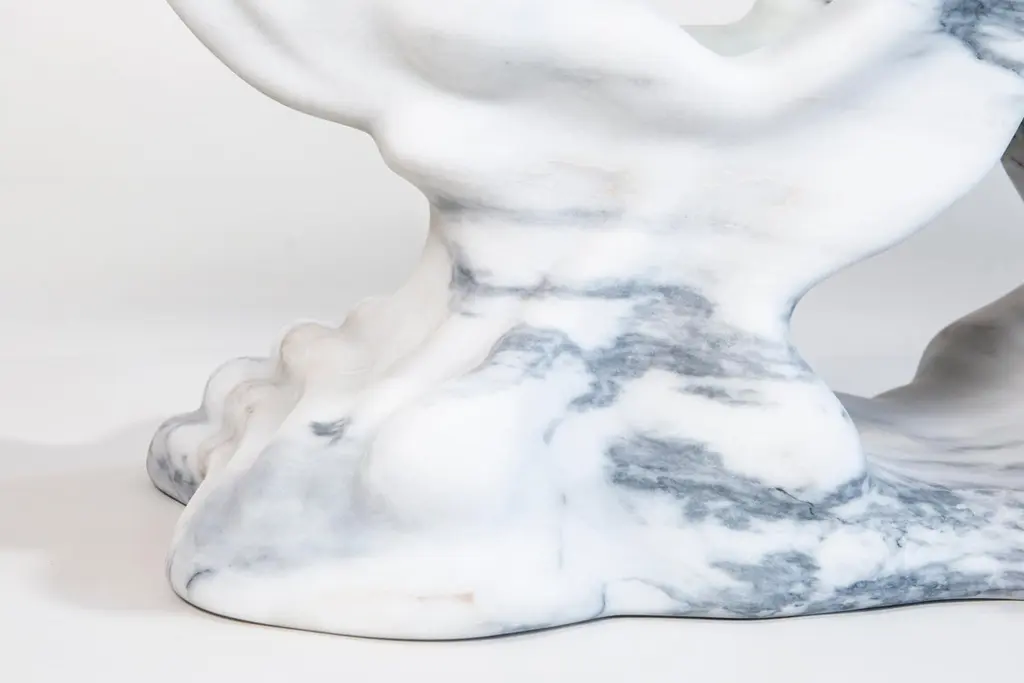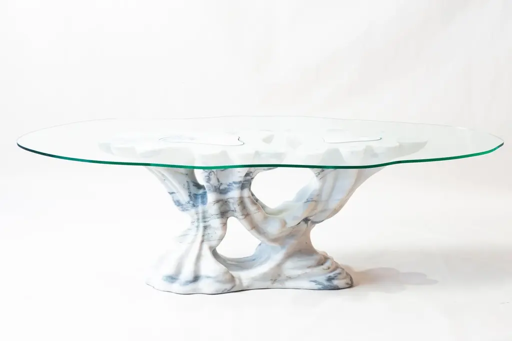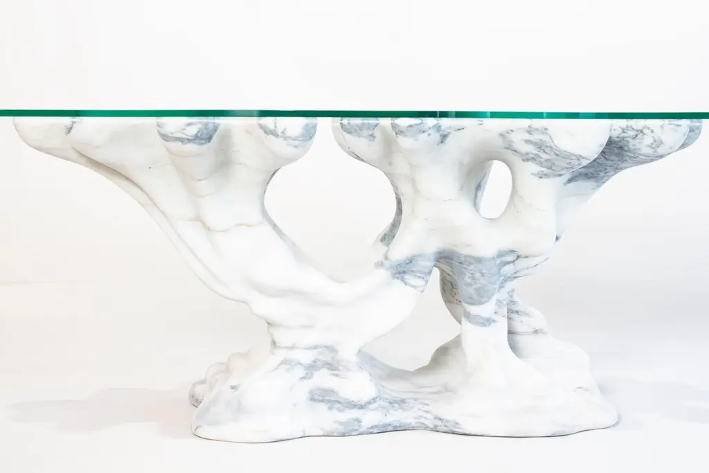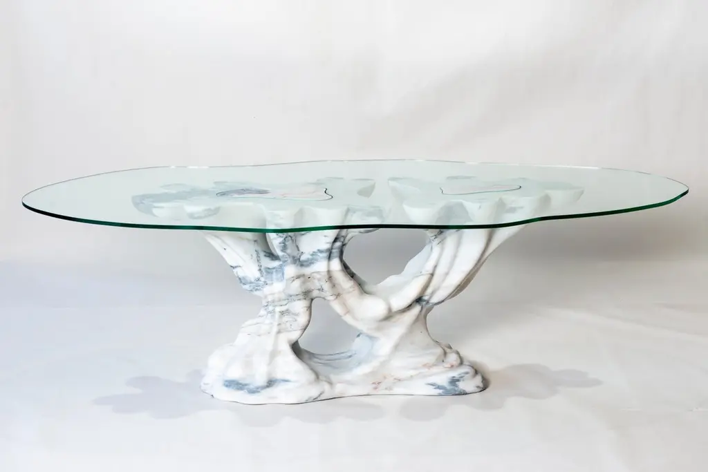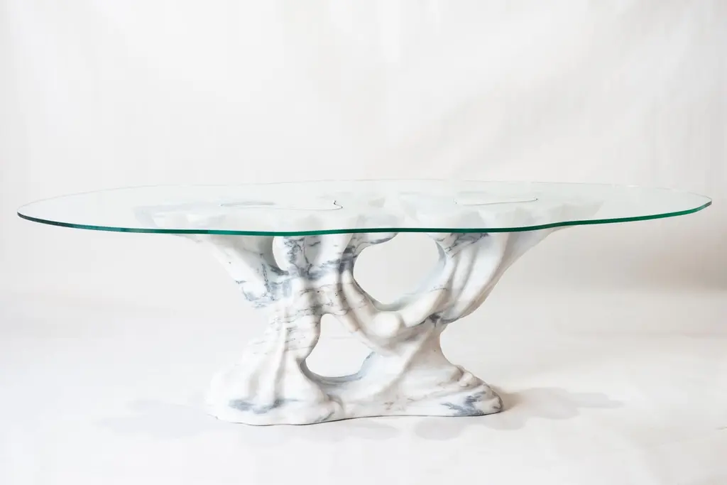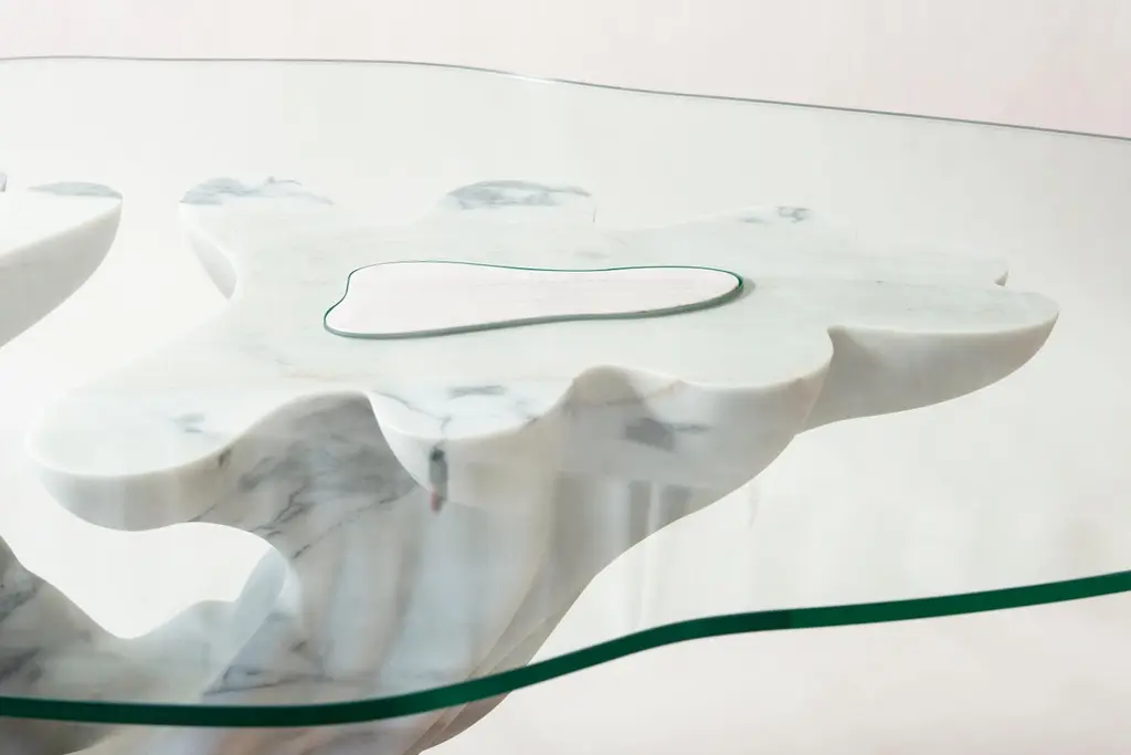 Kavachi Dining Table in White Marble & Glass by MANTA Handmade Stone DesignLimited Edition of 6 Pieces.Dimensions: D 133 x W 258 x H 93 cm. Marble base: D 64 x W 177 x H 78 cm.Glass top: D 133 x W 258 x H 15 cm.Materials: Marble and glass.Weight: 567 kg.MANTA is the design brand of Gargula Gótica, based in Portugal.Anchored in over 25 years of masterful craftsmanship, it combines the expertise of international stonemasons and sculptors with the vision of renowned designers and architects, which results in extraordinary art objects and distinctive pieces of furniture that transcend function.MANTA follows a consistently curated design philosophy - sensual, timeless, and deeply connected to the power of nature.Organic forms, curved lines, and an exceptional material aesthetic mergeinto sculptural, unique compositions that not only furnish a space but transform it, lending every room a subtle tension between refined sensuality and playful lightness.MANTA understands furniture as poetry made of stone, as silent protagonists in the interplay of light, structure, and emotion.Between sculpture and function, an aesthetic emerges that touches - subtle, elegant, and full of meaning.The collections have been presented at international exhibitions, design fairs, and galleries, and have received numerous awards for their sustainable choice of materials, precise craftsmanship, and the harmonious interplay of lightness, depth, and texture.MANTA - the power of natural processes, transformed into sculptural design.