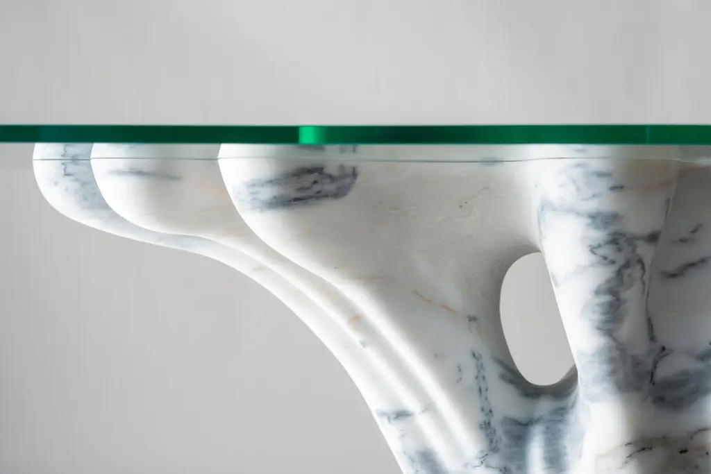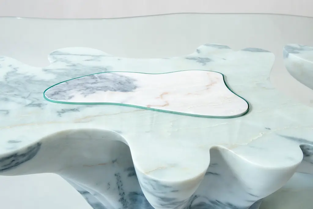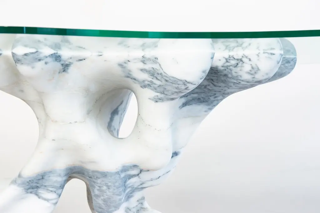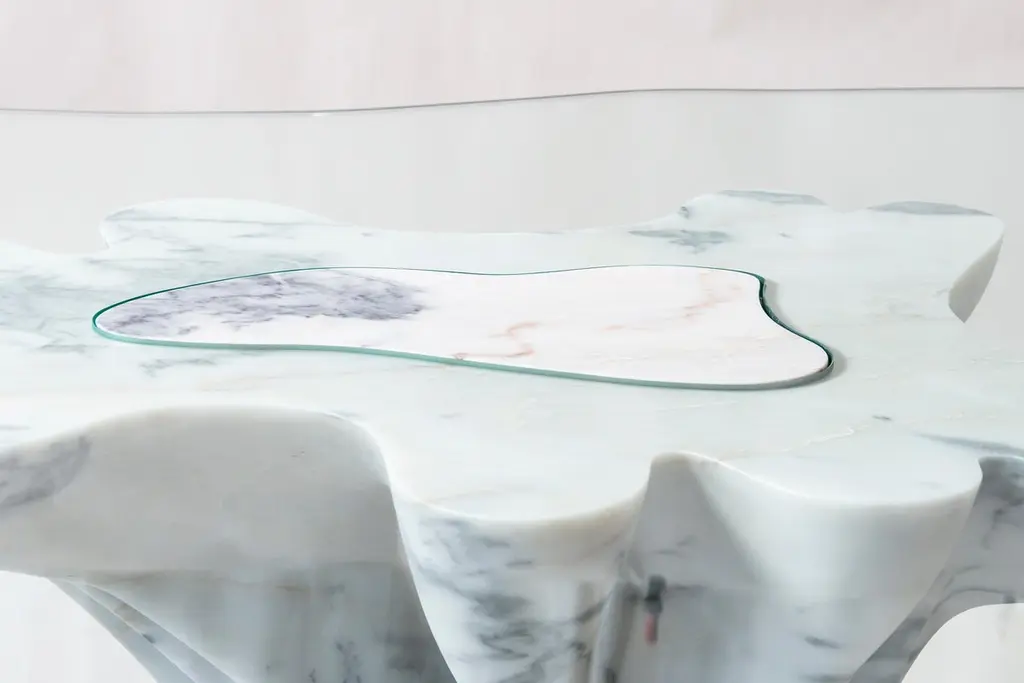 Kavachi Dining Table In White Marble & Glass By Manta Handmade Stone Design