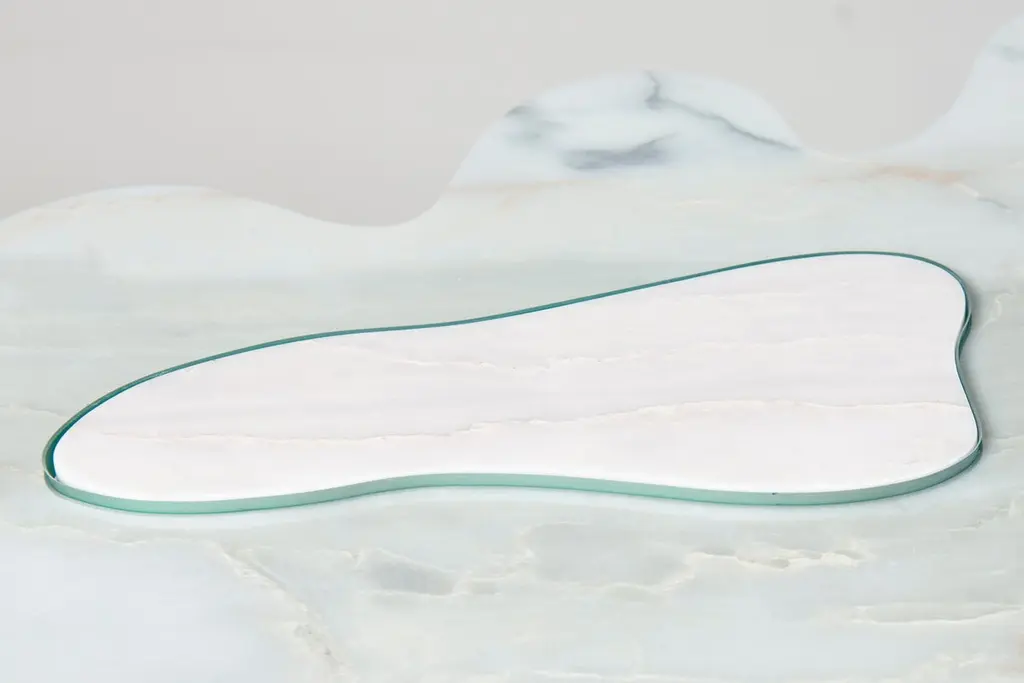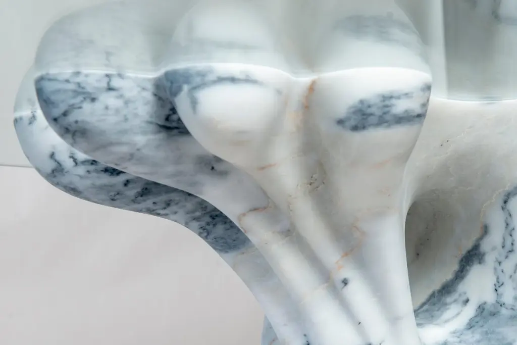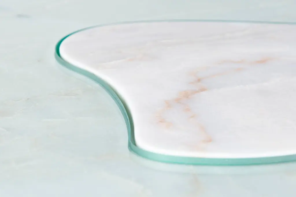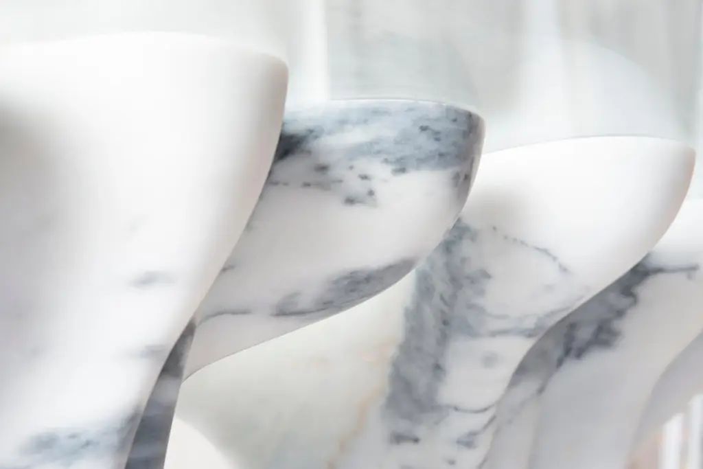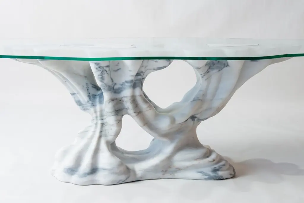 Kavachi Dining Table In White Marble & Glass By Manta Handmade Stone Design