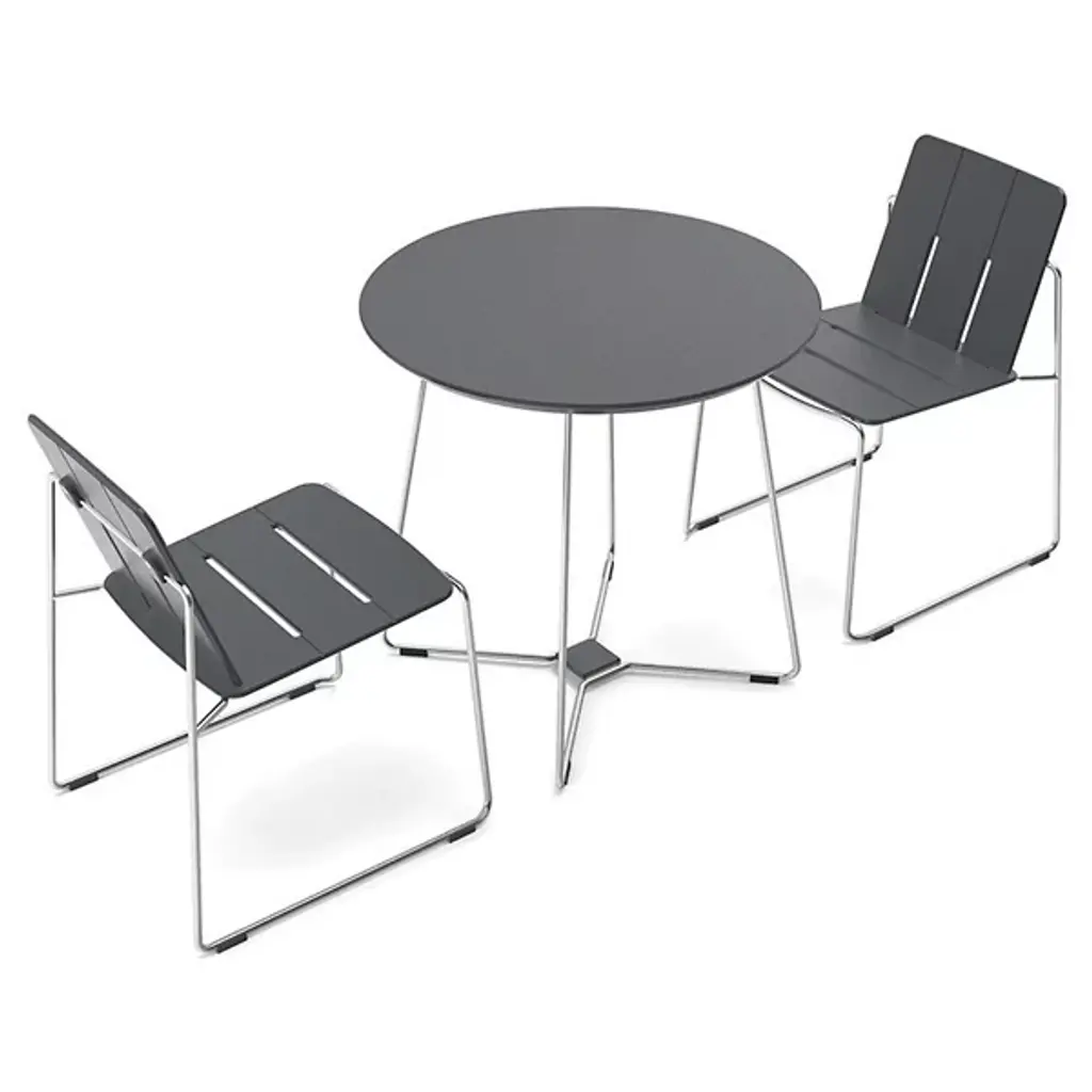 The Keene Outdoor Dining Table from Loll Designs brings bistro dining to your backyard with its round top and slender, stainless steel structure. Resting on four small glides that protect the surface below, slim steel struts extend from a square center and angle up and inward to elevate a beveled top of Recycled High-Density Polyethylene (HDPE). Made in the USA, the assembly process uses recycled post-consumer milk jugs due to their lack of pigmentation. At the same time, a square accent in the base color coordinates with the top for a bit of consistency, able to endure rain, wind, and sun.