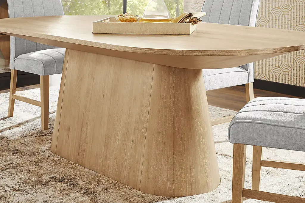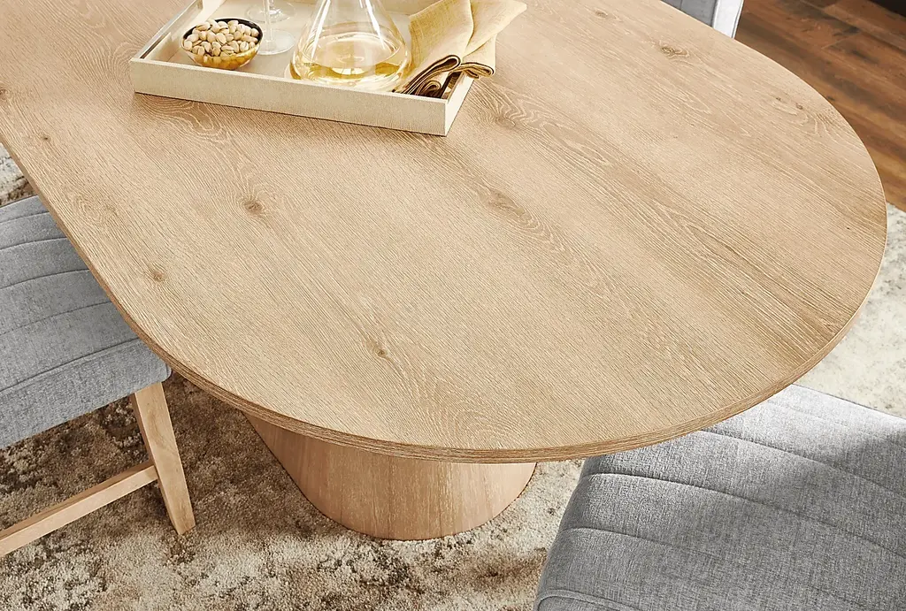 You've got a reservation for the hottest dining experience in town, and the Kendall collection is serving it family-style. This contemporary dining table features an oval-shaped tabletop and flared pedestal base crafted of oak veneers in a natural finish.
