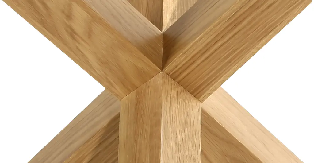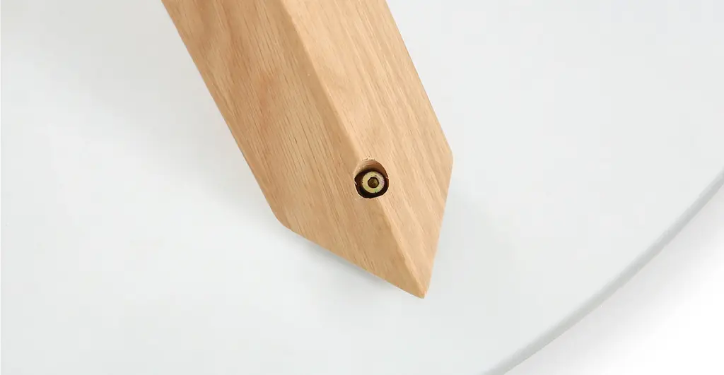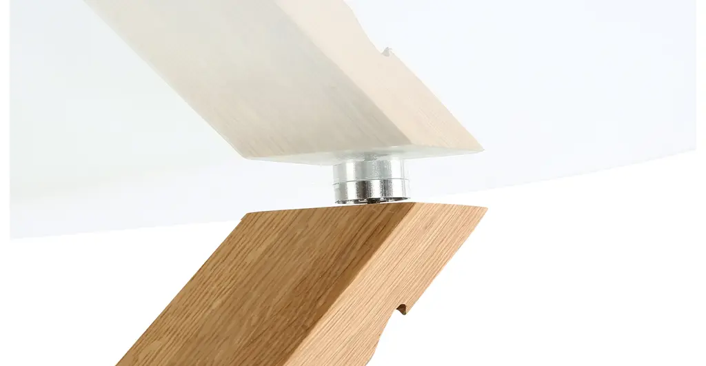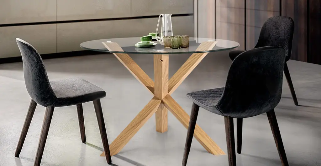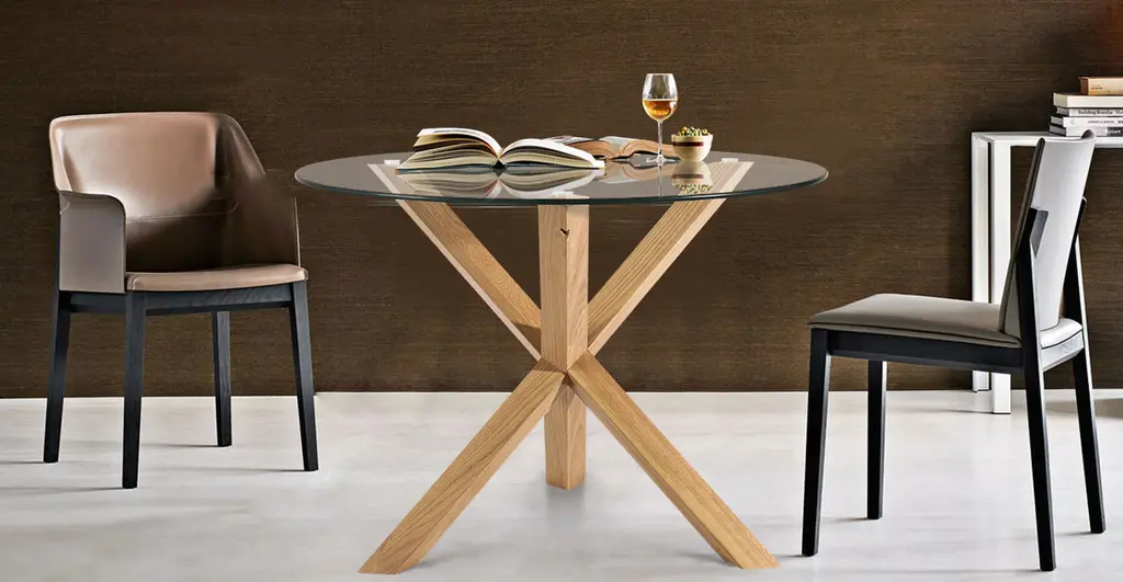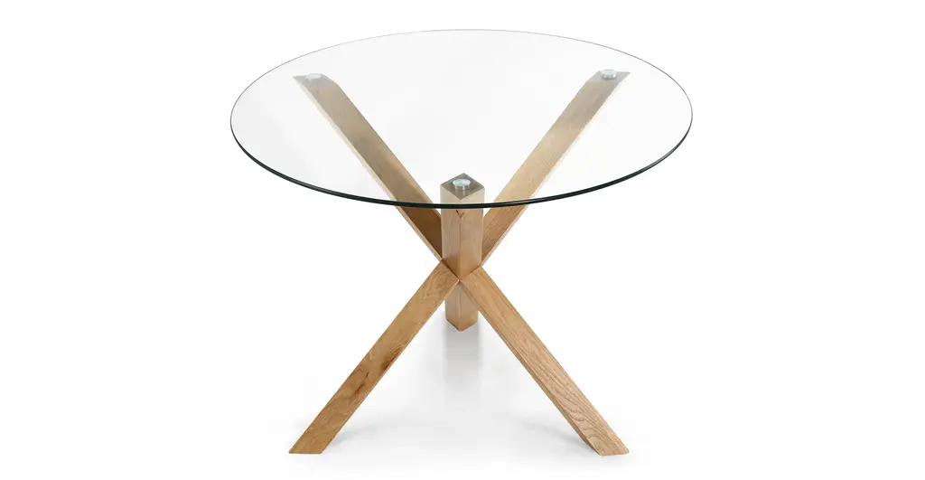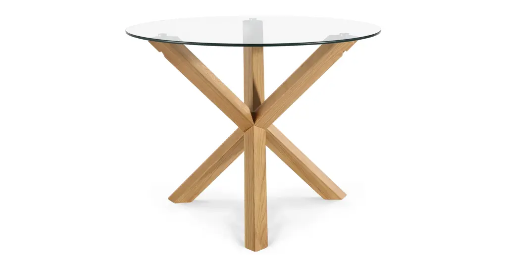 Introduce an element of exquisite style and inviting lightness with this stunning glass dining table. Boasting a wood base crafted in solid rubberwood with an American oak veneer, three angled posts intersect to create a star-inspired silhouette. A thick round of tempered glass rests on top, allowing an artful focal point to stand front-and-center. Enjoy an indulgent, intimate dinner or create a stylish spot for coffee and a croissant.