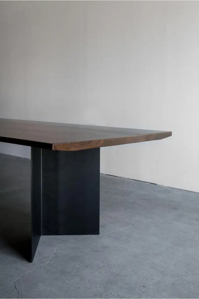 This dining table is custom made in Los Angeles. The walnut boards are cut to size and joined. The metal is bent to form. WALNUT + INDUSTRIAL STEELPOLY FINISHCUSTOMIZE THIS PIECEFor all furniture, protection from heat and moisture is crucial to the longevity of the piece. To help prevent scratches, use adhesive felt pads, coasters, placemats, and avoid sliding objects across the surface of the piece when possible.Lacquer + Paint + Metal Surfaces - Dry dust with a clean microfiber or feather duster. Wipe with a slightly damp microfiber towel and mild cleaner as needed. Wipe dry promptly.We recommend that you clean with ammonia-free Windex or a mild surface cleaner. Please stay away from bleach, alcohol, or petroleum based cleaners. You may use a general purpose wood cleaner.Avoid using furniture polish as over time it can accumulate and leave a residue.Wax + Oil Finish - Dry dust with a clean microfiber or feather duster. Wipe with a slightly damp microfiber towel. Wipe dry immediately. Clean with ammonia-free Windex or a mild surface cleaner. Stay away from bleach, alcohol, or petroleum based cleaners. Our natural wax and oil finishes will dull over time. Wax or teak oil may be reapplied as needed using a soft white cloth. Raw Wood - Dry dust with a clean microfiber or feather duster. Use a damp microfiber towel or soft brush as needed.Do not use any product containing wax or oil to clean.Outdoor Furniture - Outdoor furniture may require frequent oiling. A cover is strongly recommended for all outdoor furniture. Avoid prolonged exposure to moisture and/or direct sunlight.If exposed to rain, allow cushions to air dry completely before putting them back on the frame. Leather Care - Dry dust with a clean microfiber or feather duster. Wipe with a slightly damp microfiber towel. Do not use cleaning products on the leather. The recommended leather conditioner is Skidmore’s Original Leather Cream. Marble + Stone - Dry dust with a clean microfiber or feather duster. Wipe with a slightly damp microfiber towel. Wipe dry immediately. For daily cleaning we recommend using Orange Glo and/or Method Stone Cleaner on the marble. All marble and stone surfaces are protected with a sealer. To maintain the overall appearance and protection of the marble or stone, reseal with Miracle 511 Seal & Enhance. It is important to use coasters and clean up moisture immediately on marble and stone surfaces. Additional information:Dimensions: 96"L + 40"W + 30"H
