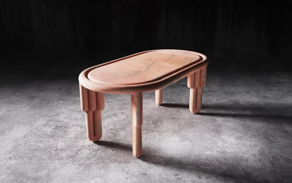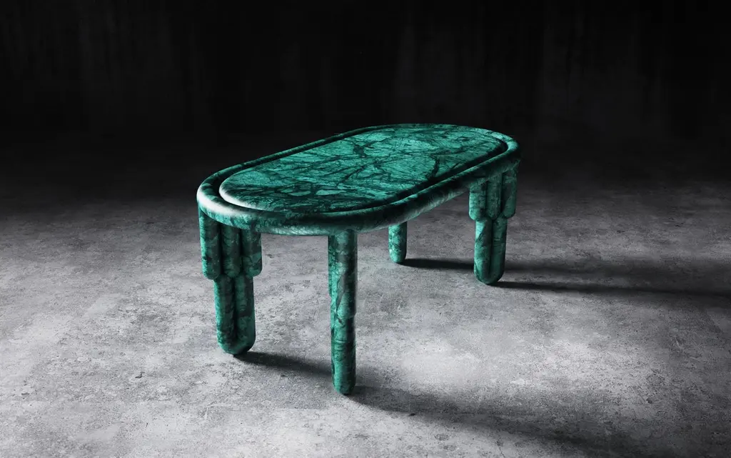 The Kipferl dining table features oblong top which is encased into circular round profile. It features sculptural legs of three batons which are supported at the bottom with curved ending of two batons. The table comes in 180 cm and 220 cm lengths, comfortably sitting six or eight people. It is available in Rosa Portugalo, Verde Alpi and Nero Marquina marbles.Each piece of furniture is individually numbered and comes with a signed Certificate of authenticity to prove that is Bohinc Studio original.Limited edition of 10 pieces.