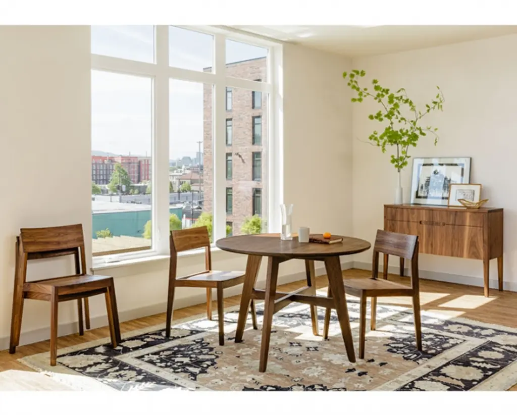 The Klamath Dining is a simple but elegant Modern Dining Table. This table features a radiused edge detail on the top, along with tapered legs, and a slight angle at the bottom of the supporting stretchers. The Klamath Dining Table is 42" round and 30" h, perfect for the smaller space dining experience. It pairs nicely with Klamath Stacking Chairs and Klamath Sideboard.