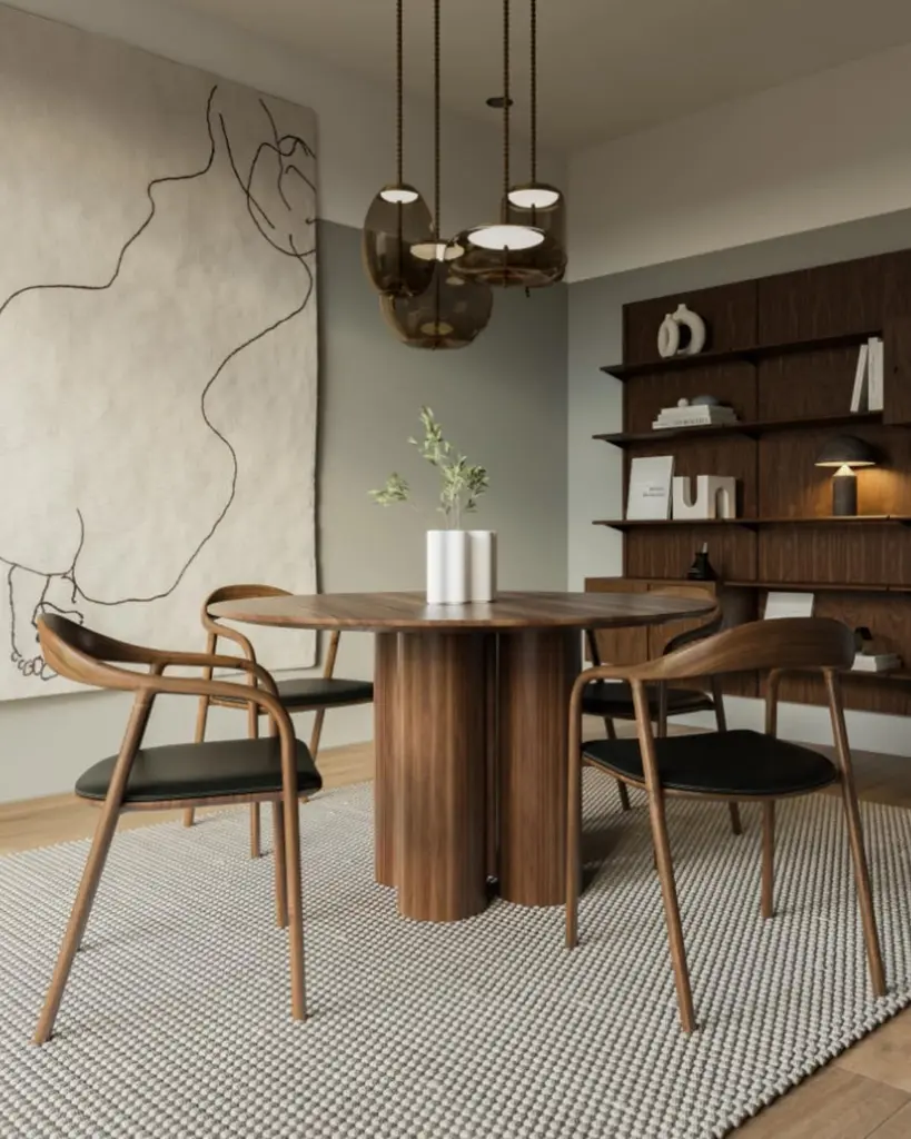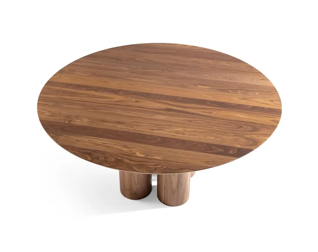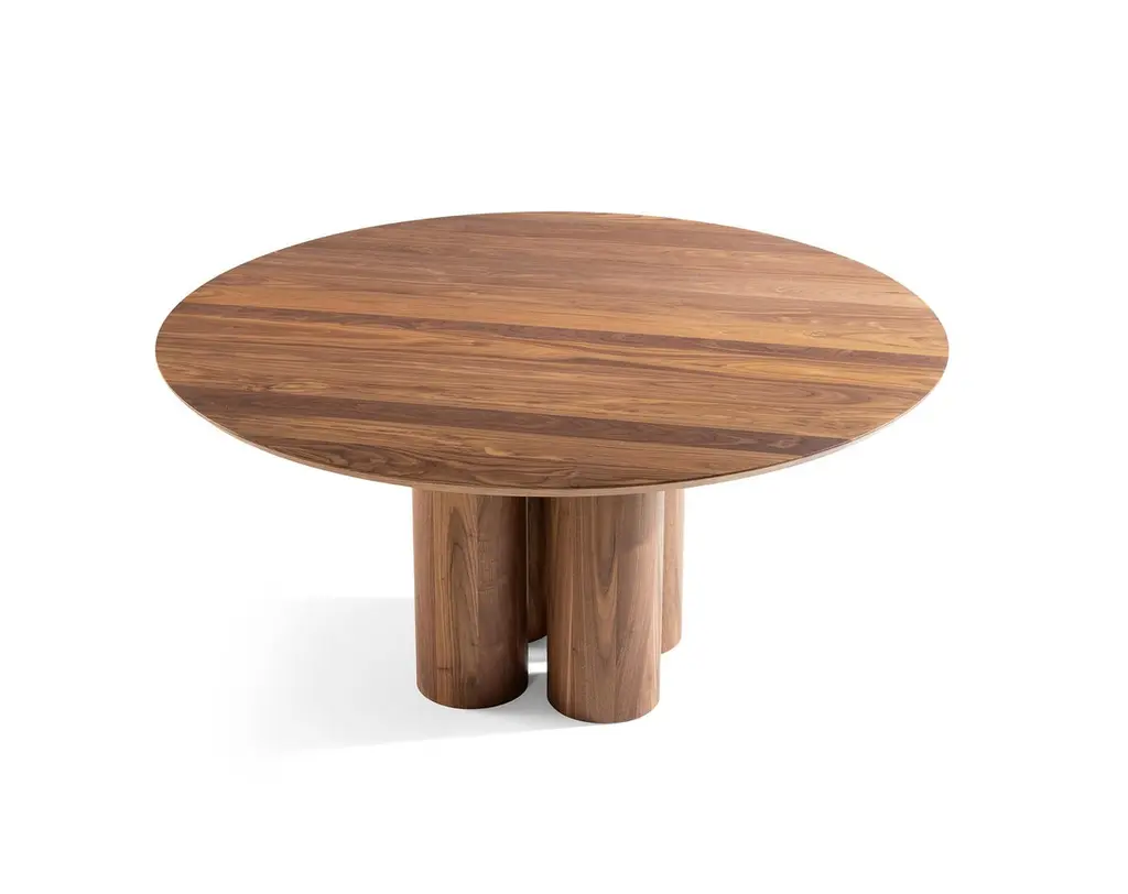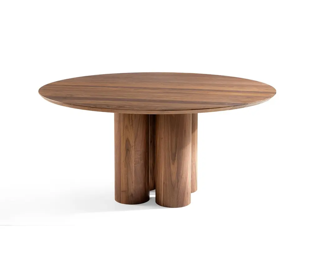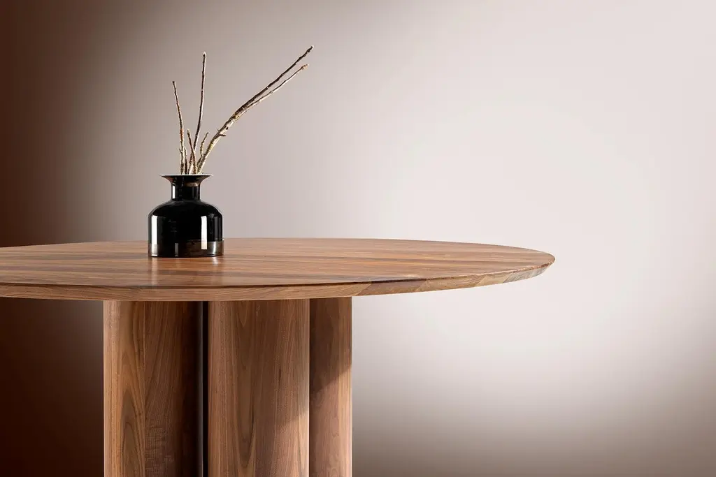 Large, round, tough and of course completely massive in solid American walnut. A beautiful round table with 3 or 4 heavy, round legs. In the 'small' size of 110cm diameter with 3 legs and in the large size of 220cm diameter with 4 legs. The tapered leaf edge gives the table just a touch of refinement.Handmade in The Netherlands, since 1974.
