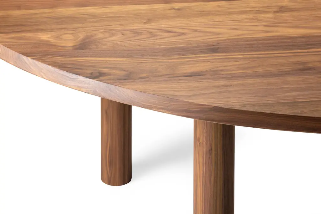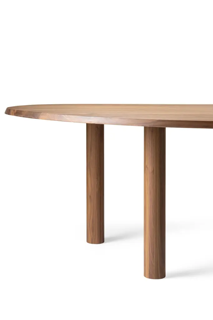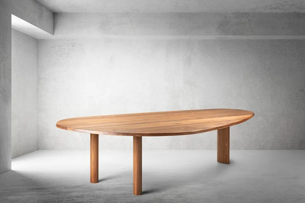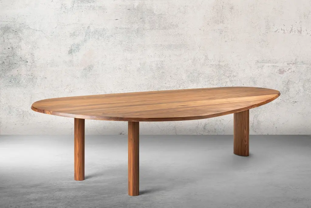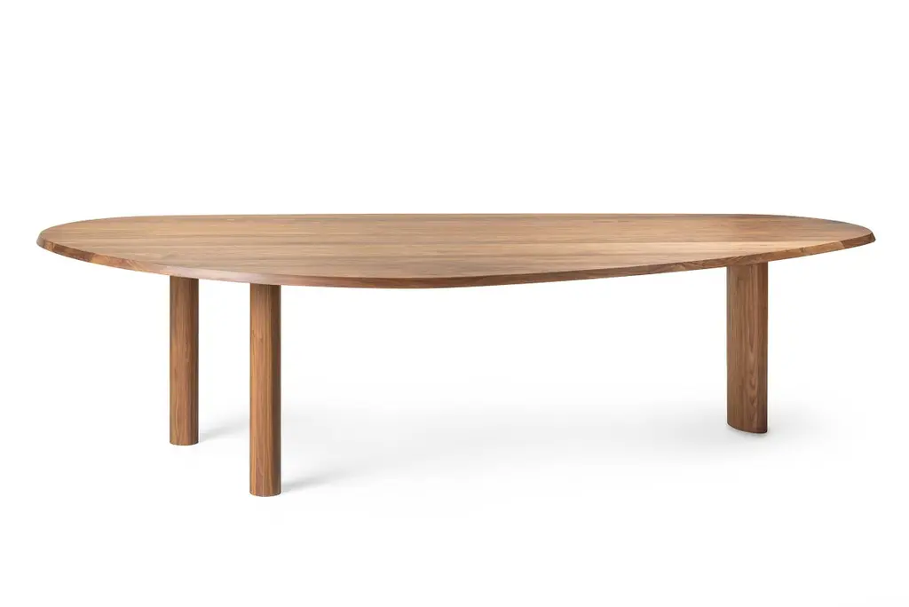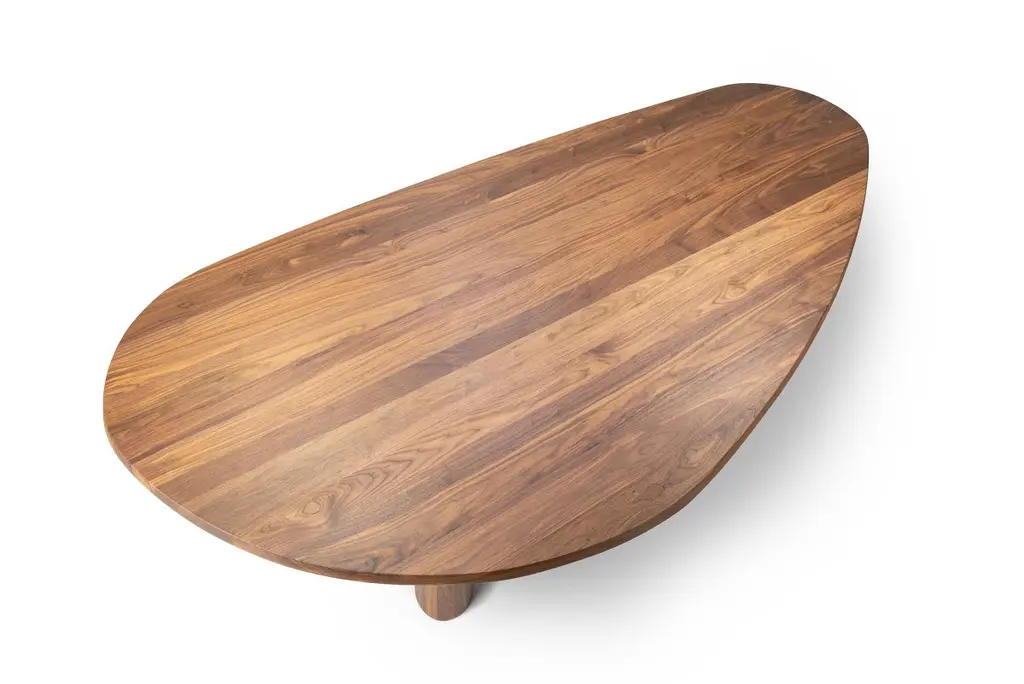 This 100% solid walnut table is not round, not oval, not rectangular but very beautifully organic. The top is a bit asymmetrical. The walnut can be finished natural oiled or Matt varnished. The legs, which are also solid, have different shapes, so that the table evokes a certain visual tension.The table is available in numerous sizes and is suitable for placing 6, 7, 8, 9 or 10 chairs, depending on the size and chair chosen. Thanks to the special shape and the 3 placed solid legs, you can easily add an extra chair. There is room for everyone, at home and in the office. You can change the thickness of the legs and table top but also the table top edge more rounded if desired. Work with quality, live with quality!