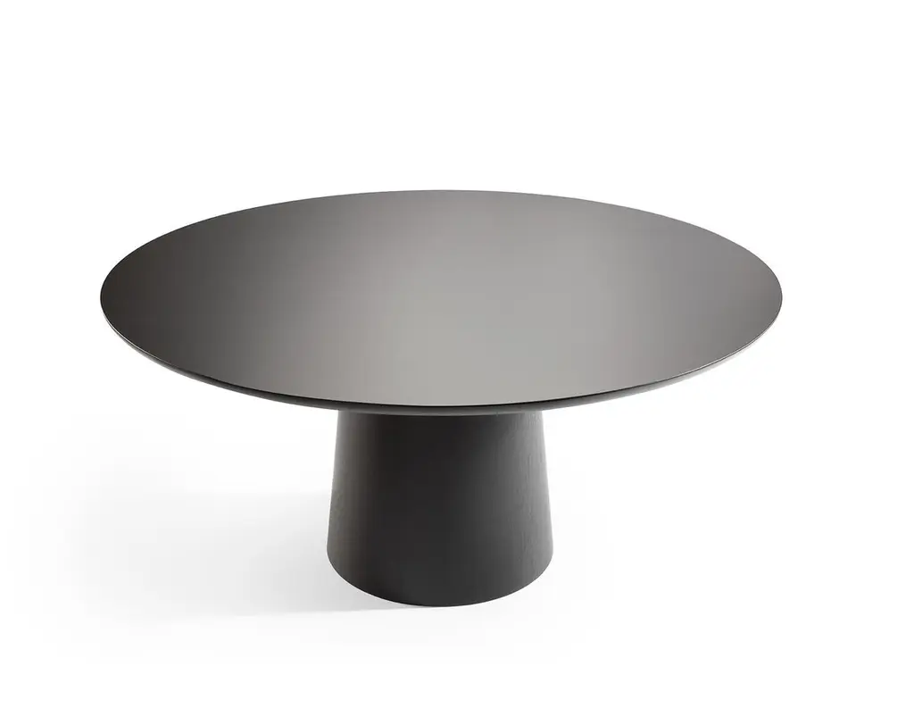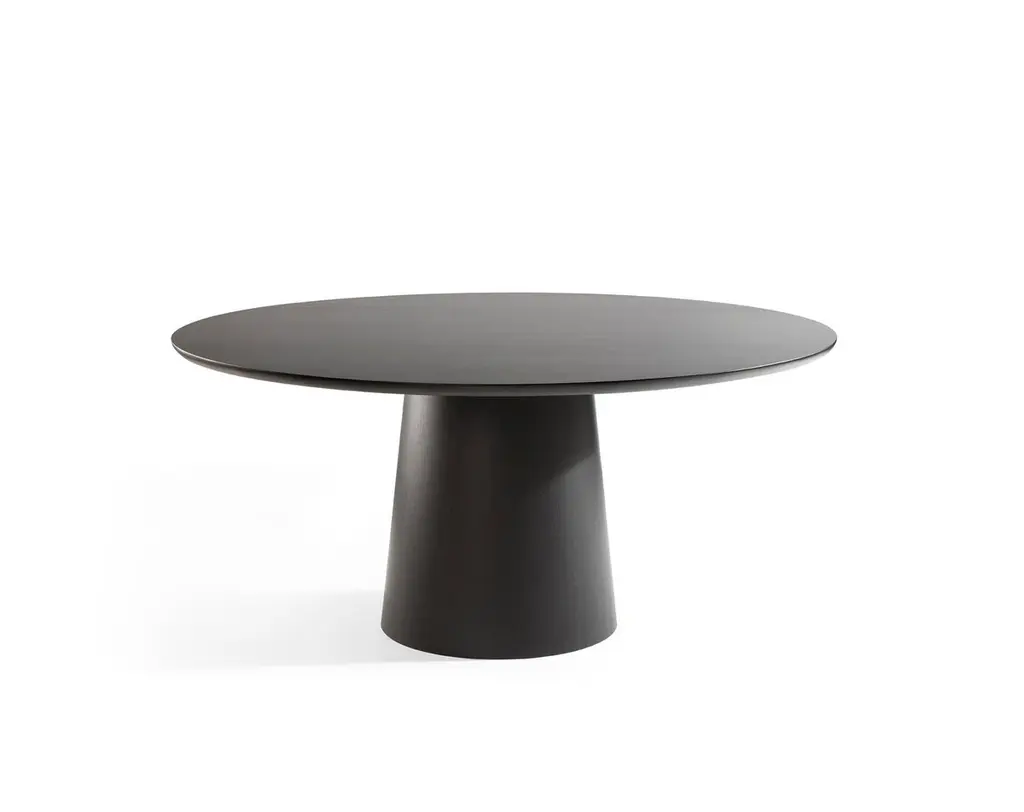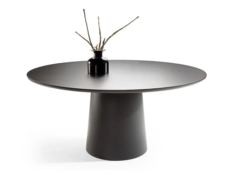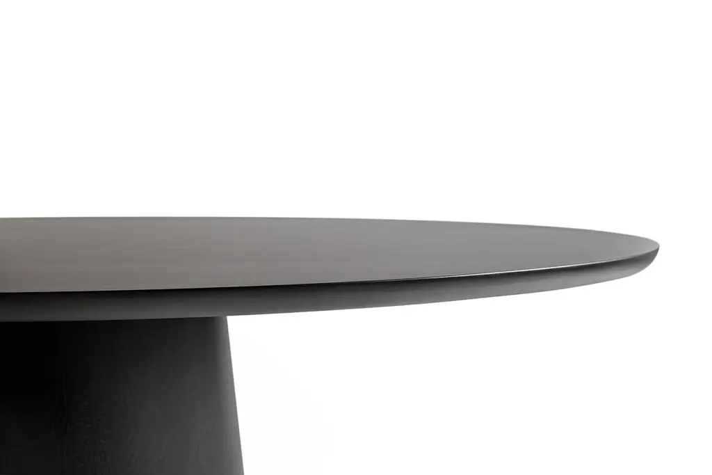 The round 'Wonderwood' dining table is a completely solid table in dark stained oak with a matt lacquered finish. The color is almost black, but in daylight a brown wenge shade is still visible. The color is therefore very deep and almost black. This gives the table a very high-quality appearance. This table fits in many interiors: from modern to classic. The equally solid, conical foot is weighted, which guarantees stability. The rejuvenated table top has a slightly rounded edge that slopes inwards. This round oak table is available from Ø100 cm to Ø200 cm in any desired size, where the cone-shaped foot subtly changes with the size of the table top, so that it remains nicely in proportion. This beautiful, timeless table is also available in oval version where the foot follows the same oval shape. Other woods are available on request: walnut, beech, cherry, ash, etc.