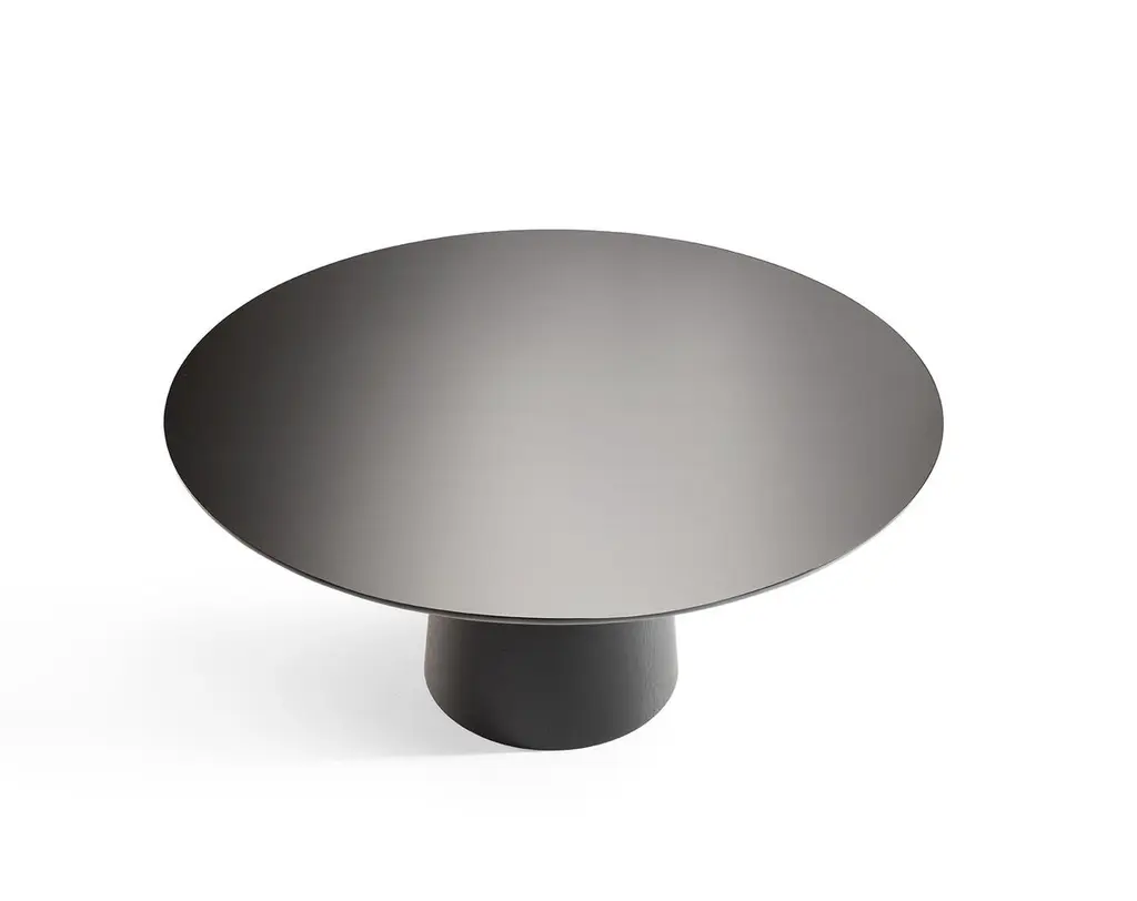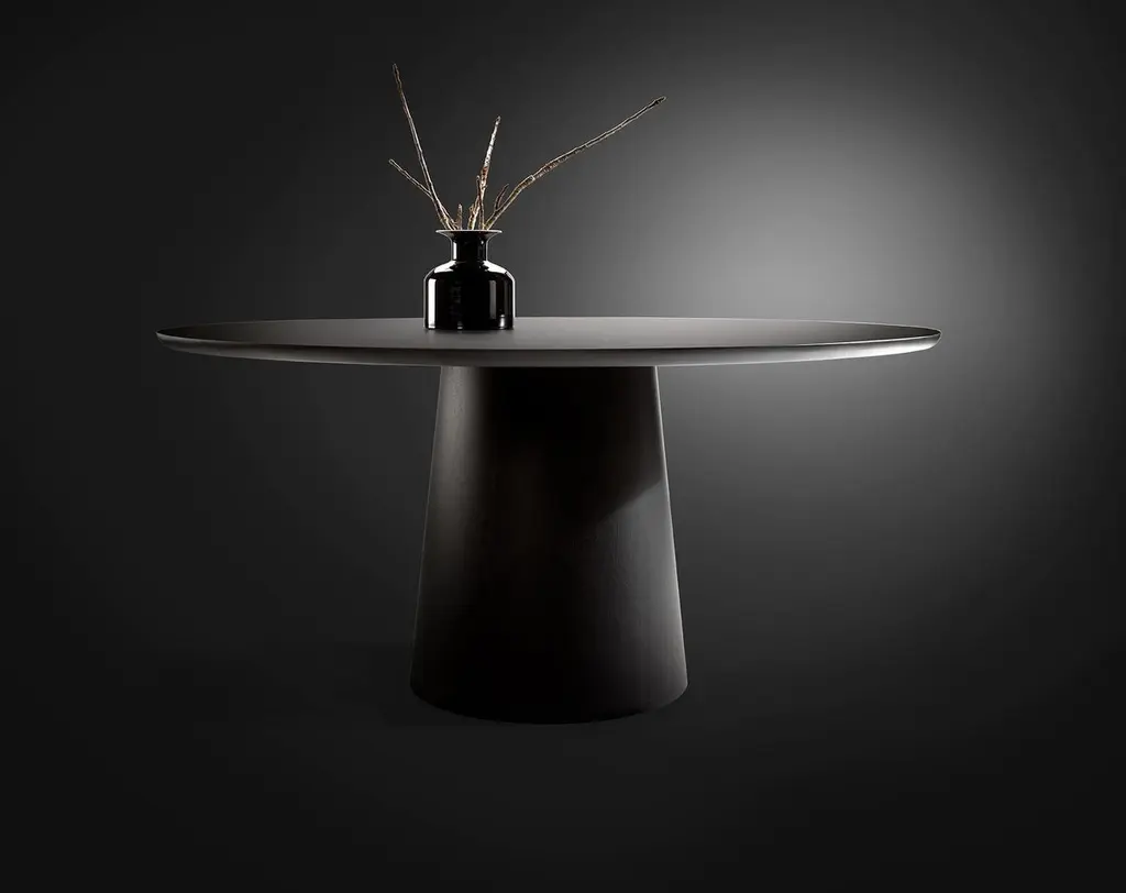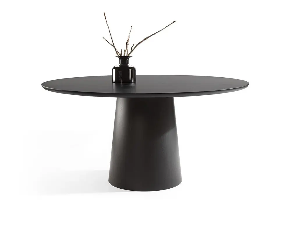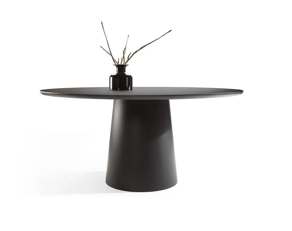 The round 'Wonderwood' dining table is a completely solid table in dark stained oak with a matt lacquered finish. The color is almost black, but in daylight a brown wenge shade is still visible. The color is therefore very deep and almost black. This gives the table a very high-quality appearance. This table fits in many interiors: from modern to classic. The equally solid, conical foot is weighted, which guarantees stability. The rejuvenated table top has a slightly rounded edge that slopes inwards. This round oak table is available from Ø100 cm to Ø200 cm in any desired size, where the cone-shaped foot subtly changes with the size of the table top, so that it remains nicely in proportion. This beautiful, timeless table is also available in oval version where the foot follows the same oval shape. Other woods are available on request: walnut, beech, cherry, ash, etc.