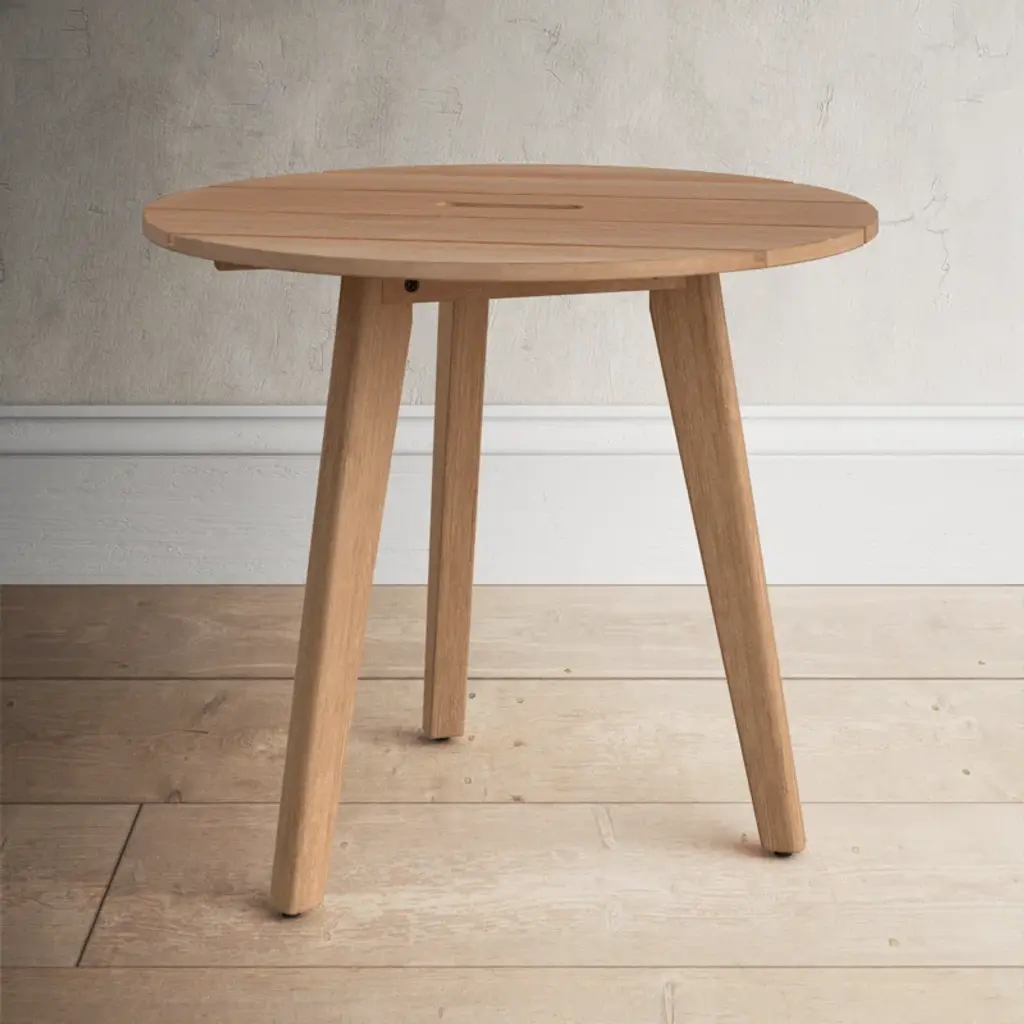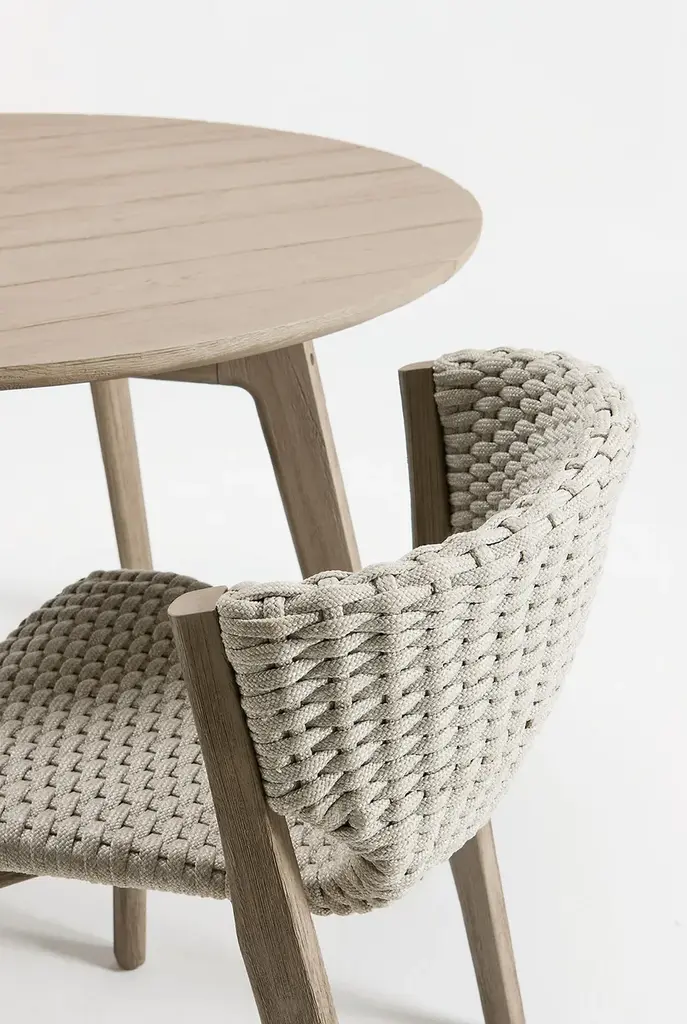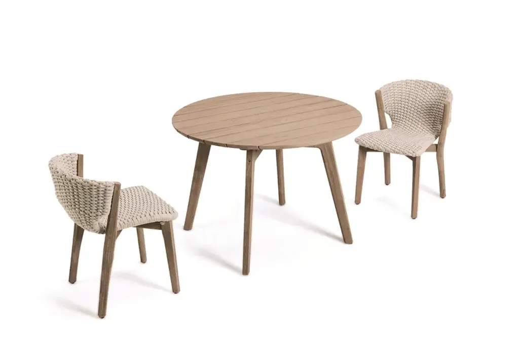 Ethimo and Patrick Norguet add another element to complete the family of furnishings specific for dining in company, whether on patios, gardens or other outdoor spaces: a round table in either natural or pickled teak. The new Knit table has the same contemporary, clean-cut, minimal lines of the other tables in the collection and has been designed to fit perfectly into any residential or contract context.Knit in fact satisfies the durability, quality and solidity requirements demanded by a widely diverse range of outdoor hospitality, delivering new experiences in comfort at the table. The warm texture of the wood becomes versatility, the no-frills design of Knit makes it ideal for ‘accompanying’ dining chairs and armchairs in different styles.KNIT dining table in teak or in Stromboli Black mahogany.Knit is a complete line of tables, chairs and lounge chairs in teak and woven rope that expresses with refinement a perfect synthesis of aesthetics, functionality and ergonomics. The iconic collection is enriched by the new version in pickled teak and light gray rope and the rocking version of the lounge chair with high back, thus offering a new and special interpretation of the classic bergère.