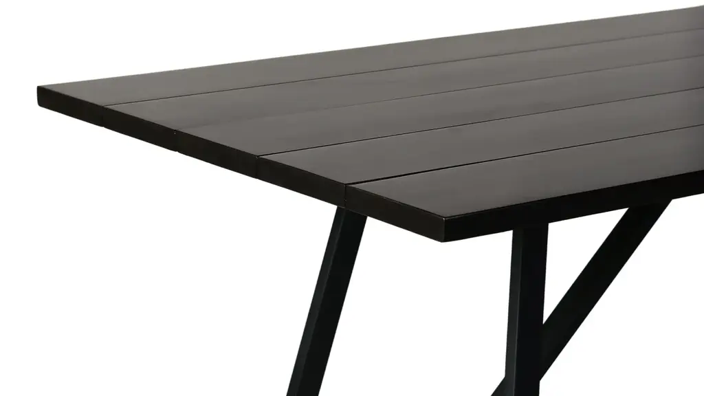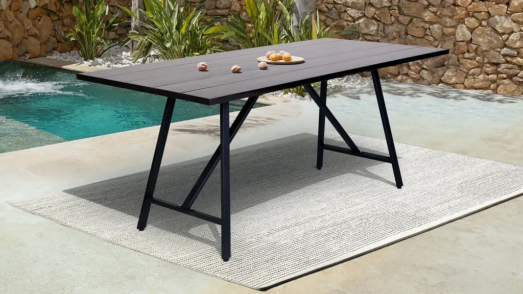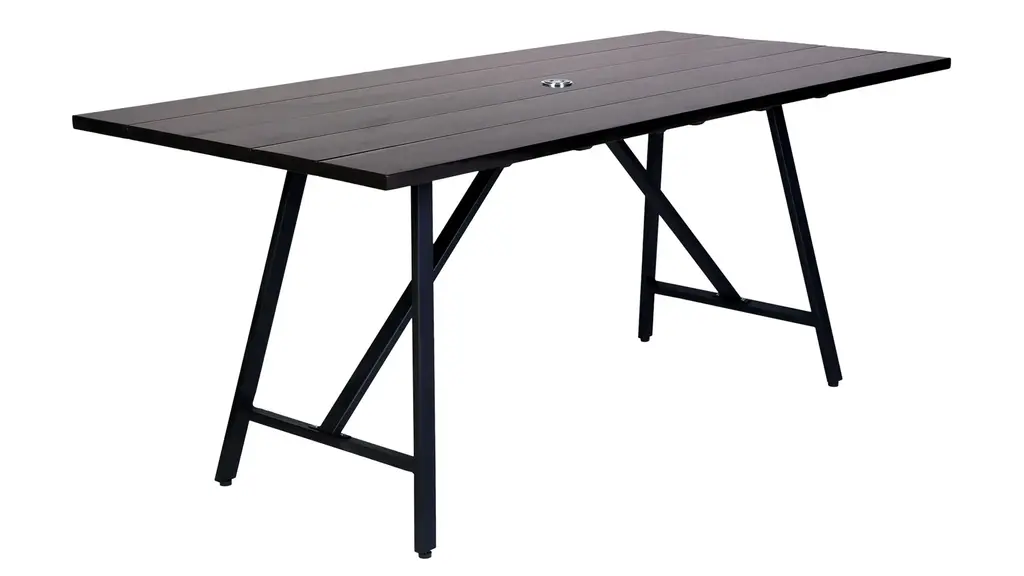 Create the perfect entertaining ambiance with our Koala Outdoor Dining Table. Modern and inviting, our patio dining table combines the warmth of wood with the hardiness of metal. The clean-lined and minimal profile of the table can effortlessly blend and compliment any outdoor space. One of the best reasons to choose Eucalyptus wood for your outdoor furniture or four-seasons porch is that it is exceptionally resistant to decay and rot. It naturally resists the influence of moisture because of the high oil content it naturally contains. That means it can get damp without you worrying about whether damage will occur. It can withstand several different outdoor elements while lasting for many years if it receives proper care. The Koala's trestle base allows for maximum seating space as it makes the table virtually legless and allows for the full surface of the table to be used and no corner legs that would limit dining chair space. Steel does not dent or get bent out of shape as easily as some aluminum furnishings can. Lighter than wrought iron but heavier than aluminum, steel provides strength, stability, and endurance in extreme temperatures. Comfortably seating up to 8 people, our rectangular dining table remains perfect for backyard BBQs and alfresco lunches in your patio and balcony. The Koala rectangle dining table is 71 inches long, features a convenient umbrella hole to keep you out of the sun.