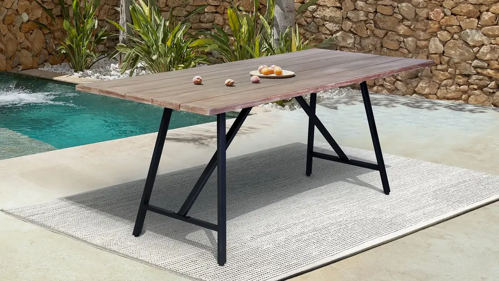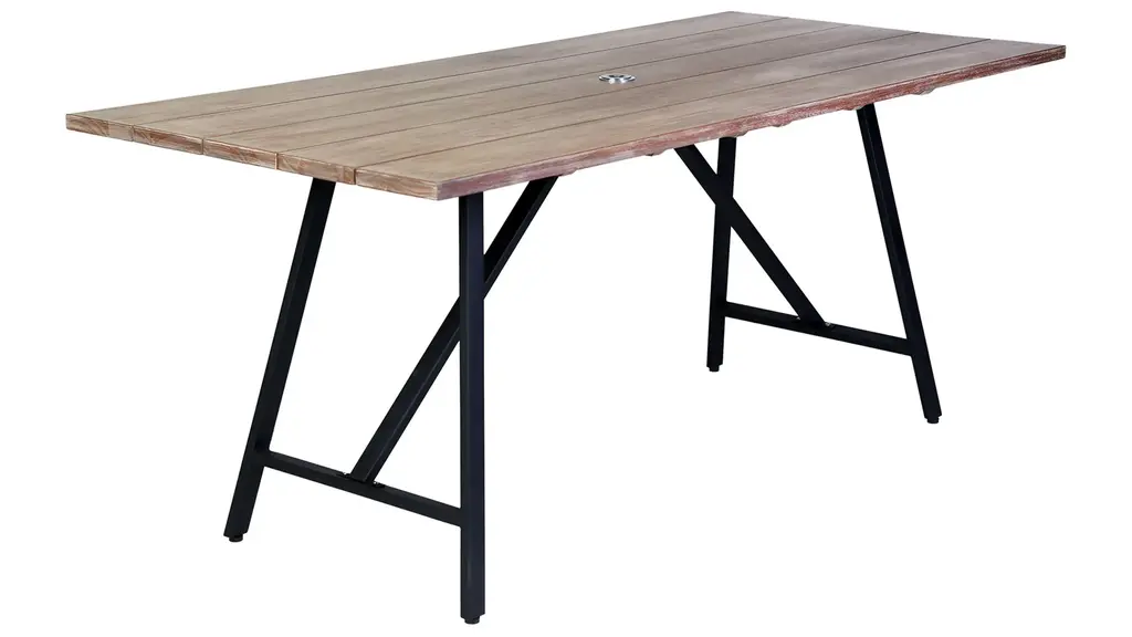 Create the perfect entertaining ambiance with our Koala Outdoor Dining Table. Modern and inviting, our patio dining table combines the warmth of wood with the hardiness of metal. The clean-lined and minimal profile of the table can effortlessly blend and compliment any outdoor space. One of the best reasons to choose Eucalyptus wood for your outdoor furniture or four-seasons porch is that it is exceptionally resistant to decay and rot. It naturally resists the influence of moisture because of the high oil content it naturally contains. That means it can get damp without you worrying about whether damage will occur. It can withstand several different outdoor elements while lasting for many years if it receives proper care. The Koala's trestle base allows for maximum seating space as it makes the table virtually legless and allows for the full surface of the table to be used and no corner legs that would limit dining chair space. Steel does not dent or get bent out of shape as easily as some aluminum furnishings can. Lighter than wrought iron but heavier than aluminum, steel provides strength, stability, and endurance in extreme temperatures. Comfortably seating up to 8 people, our rectangular dining table remains perfect for backyard BBQs and alfresco lunches in your patio and balcony. The Koala rectangle dining table is 71 inches long, features a convenient umbrella hole to keep you out of the sun.