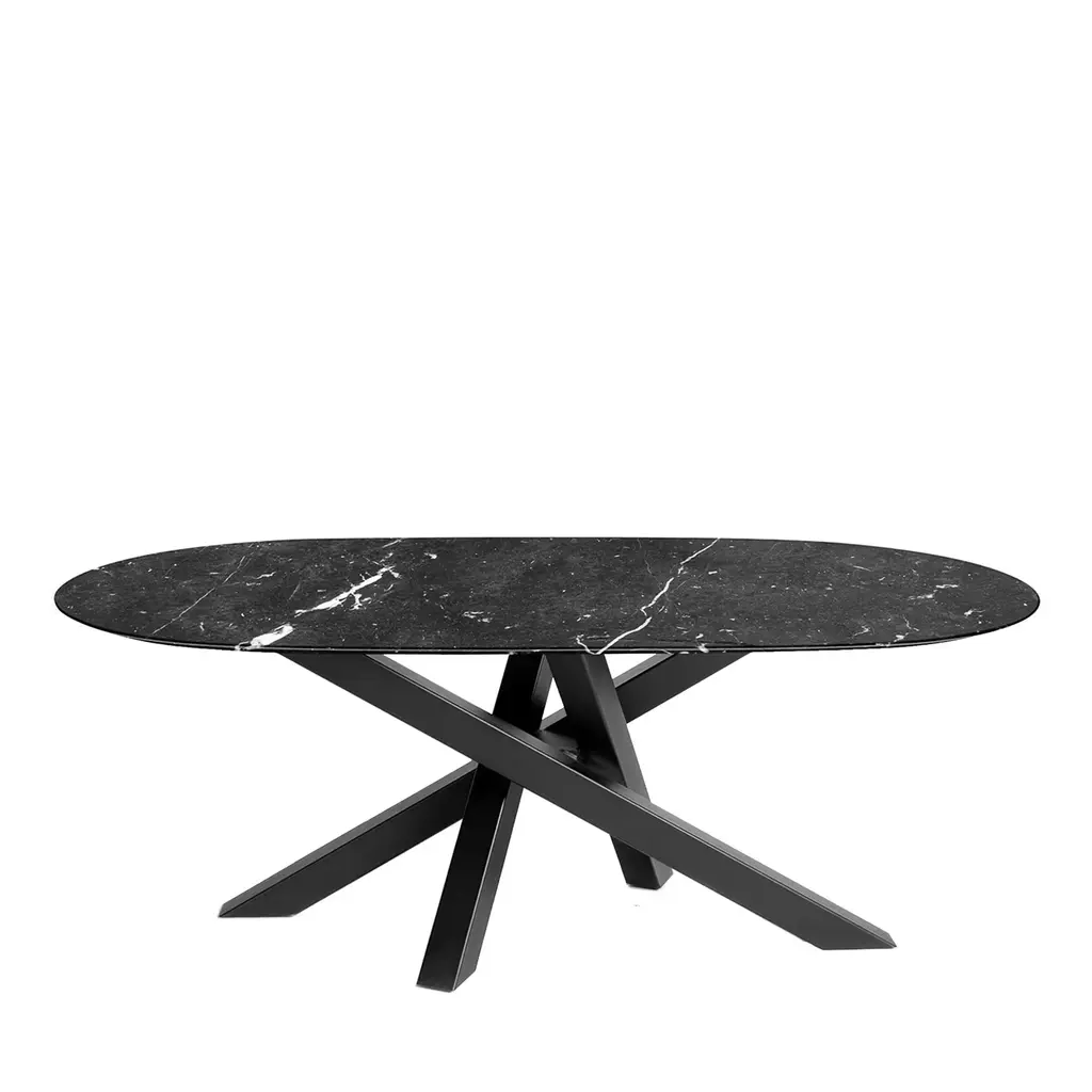 A bold and decorative accent to a contemporary interior where is sure to capture the eye, this classy dining table is a showcase of impeccable craftsmanship. A dynamic, hand-soldered base in black-lacquered iron with an array of slanted legs supports the oval top in black Marquina marble, distinguished by soft, luminous veining of subtle evocative power. Customizable in a wide range of other marble types and available in a gray or golden metal finish upon request to the Concierge.