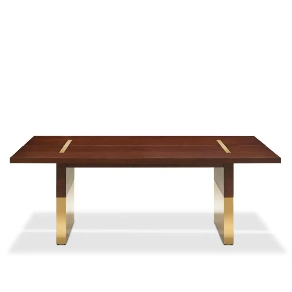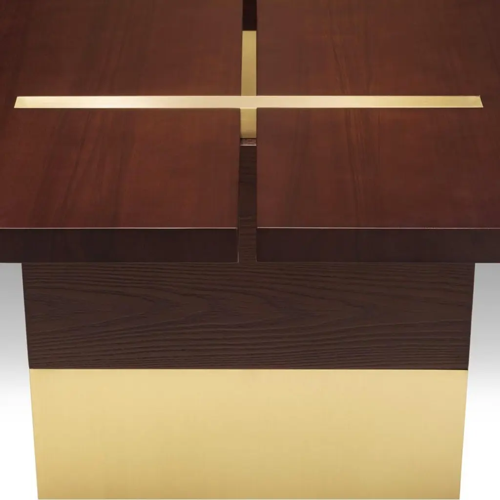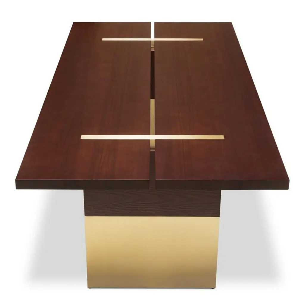 Dining Table Konran with solid ash structure in mahogany finish, with stainless steel parts in polished gold finish.