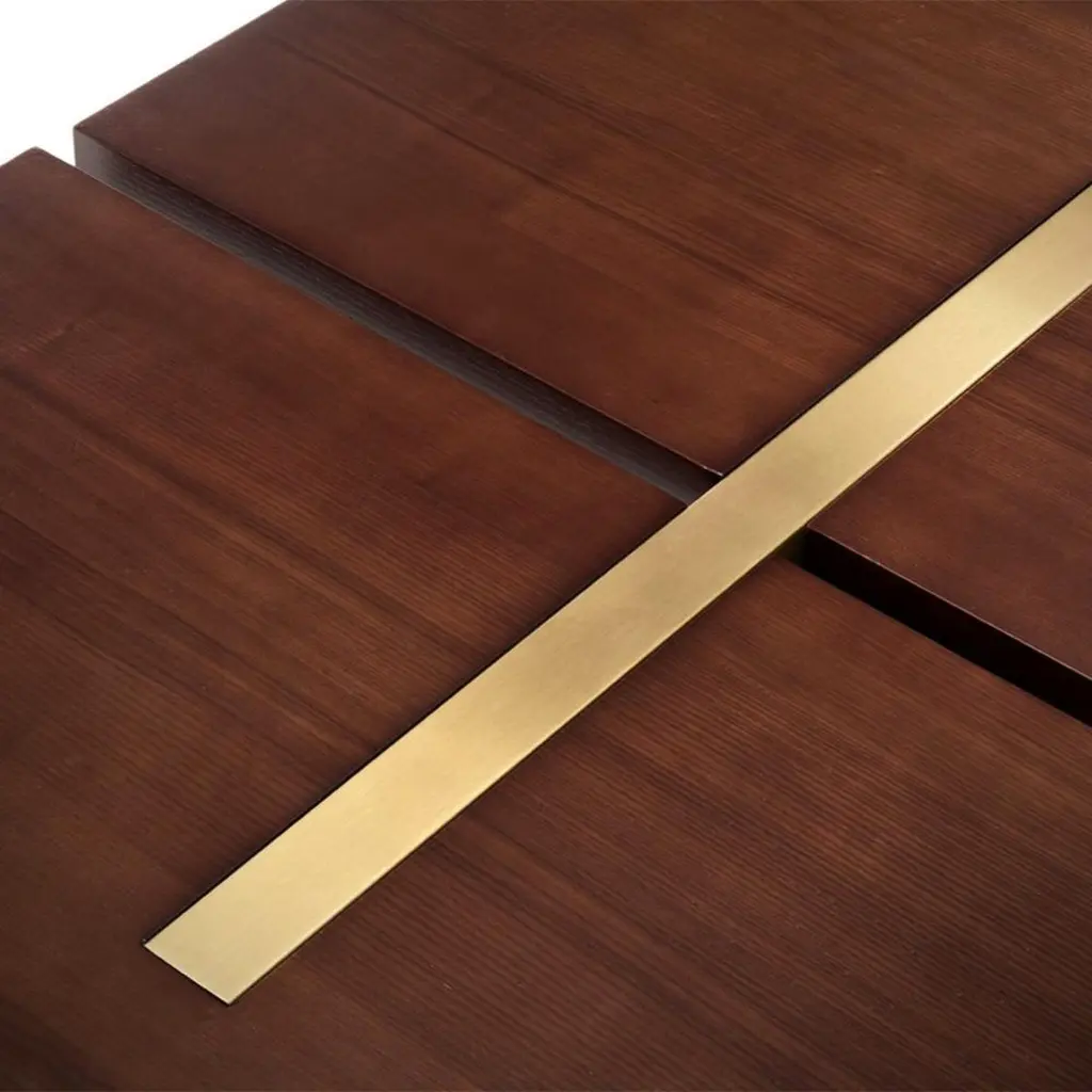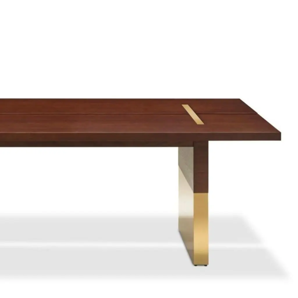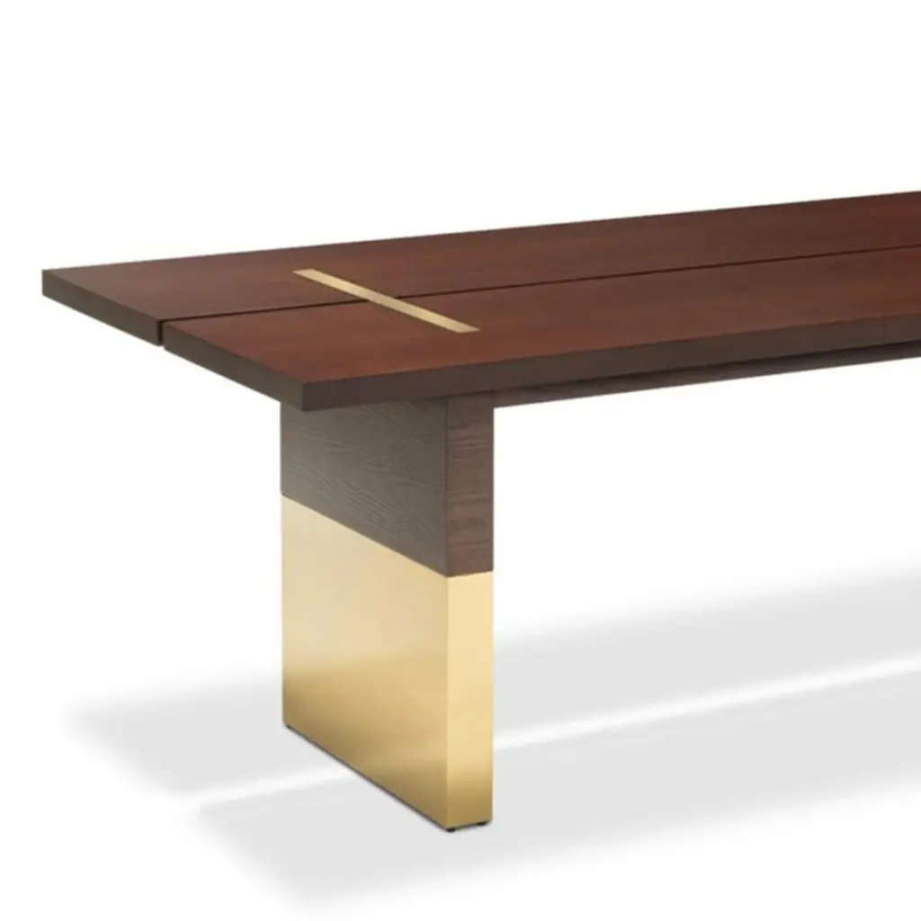 Dining Table Konran with solid ash structure in mahogany finish, with stainless steel parts in polished gold finish.