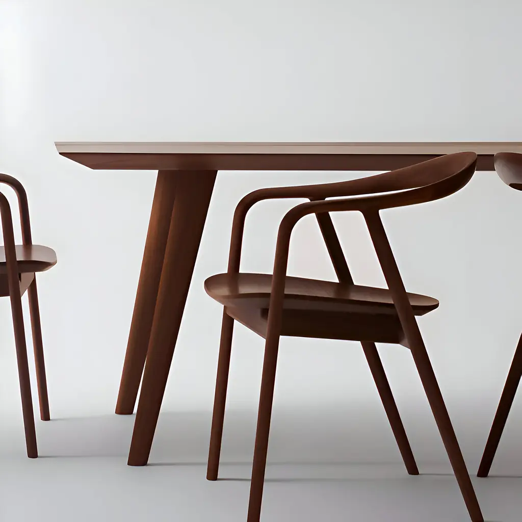 The Kumahida Dining Table features a tabletop with finely carved edges, tapering to a thin 4mm for light and refined look. The spindle-shaped legs are subtly angled, resembling the gentle movement of a forest creature. This design highlights Hida Sangyo's craftsmanship in bentwood and wood carving techniques. Kengo Kuma, known for his innovative approach to natural materials, focuses on creating harmony between structures and their surroundings.