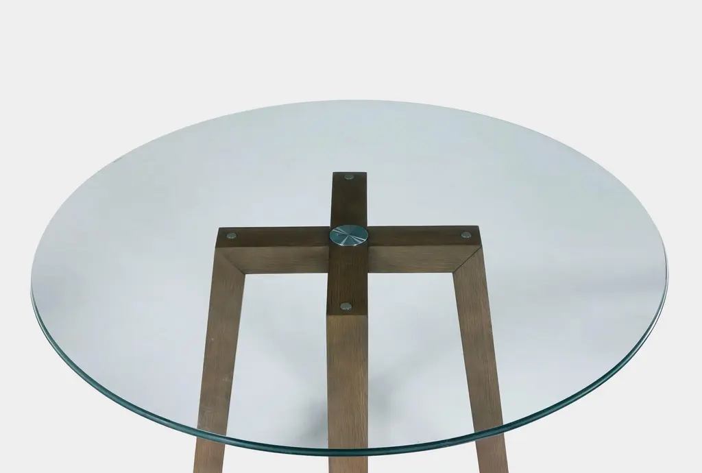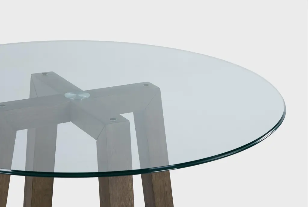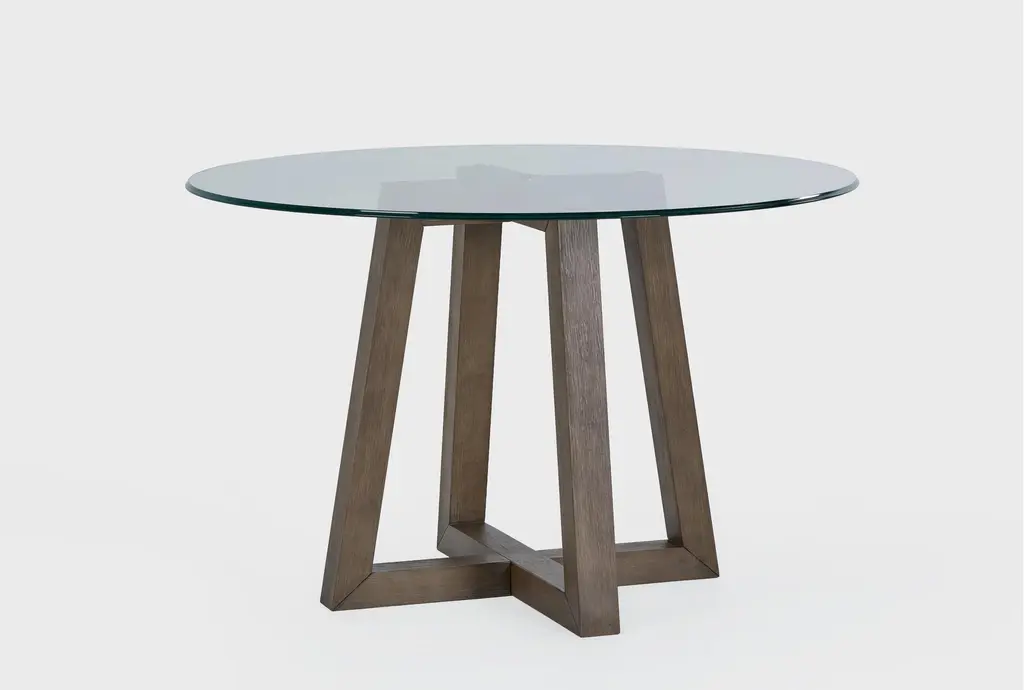 The Lakeland Natural Brown Wood Round 48" Pedestal Glass Dining Table is a stunning addition to any dining room or kitchen. Its contemporary design features a round glass top supported by a sturdy oak wood pedestal base. This table comfortably seats four, making it perfect for intimate gatherings and family meals.