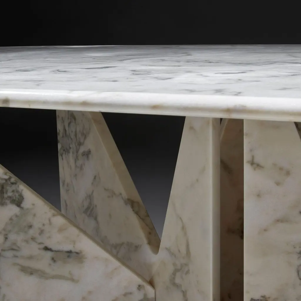 Lamina marble dining table, Hannes PeerDimensions: 110 W x 250 D x 76.5 H cmMaterials: Veined Estremoz MarbleLamina is a dinner table relying on the intersection of marble slabs. The interlocking triangle shaped legs give it both a sense of equilibrium and dynamism.Hannes Peer Architecture is an architecture and design studio that specializes in luxury retail, hospitality and residential spaces, founded in 2009 and based in Milan.The constant theme is the search for eclecticism as well as high quality in the design at all scales through the study of the close relationship between architecture, historical context and new technologies mediating between craftsmanship and industrial production. The language used in the design is stratified and eclectic, uniting poetic vision and rigorous design. The studio’s projects are recognizable by their strong iconographic identity, based upon continuous research on colours and materials and the contamination between the various contemporary languages.