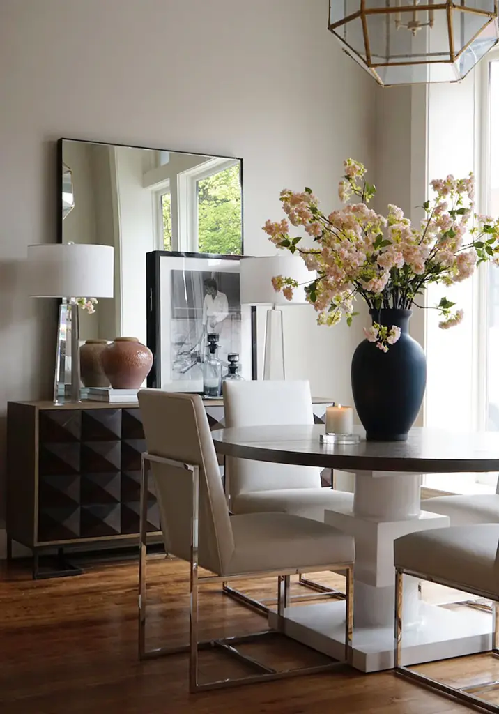 A contemporary pedestal base with geometric accents makes this table a perfect fit for a sleek kitchen or formal dining room. The color and shape of the table create a natural yet modern allure.