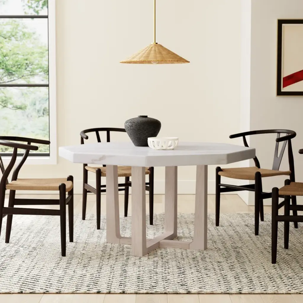 This dining table features a sleek, modern mixed-material design. The octagonal top is crafted from white marble with classic gray veining, perfect for a standout centerpiece. The solid ash wood base has a natural finish and sturdy X-shaped construction, offering plenty of legroom for six. Pair it with matching pieces for a cohesive look in your space.