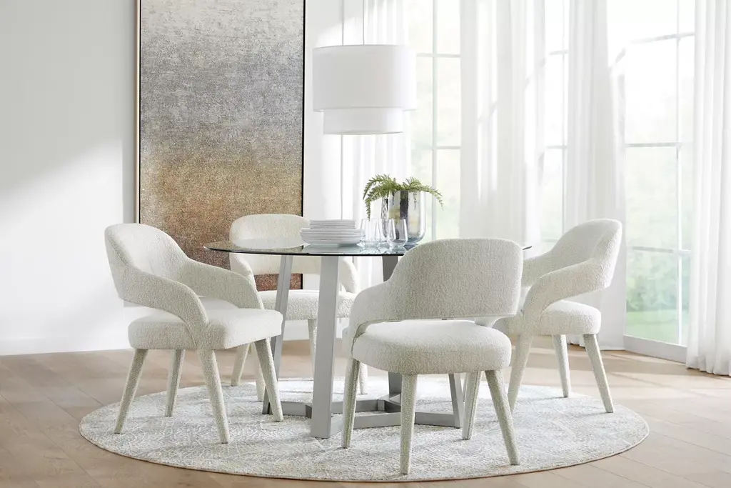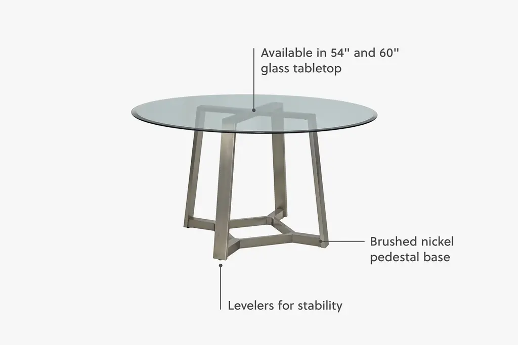 Our Landry glass top dining table with square base boasts chic and contemporary style. With its brushed nickel finished pedestal base and durable glass top, this piece adds modern design to any dining space. The glass top comes in either a 54" or 60". Choose the tabletop size that best suits your space.