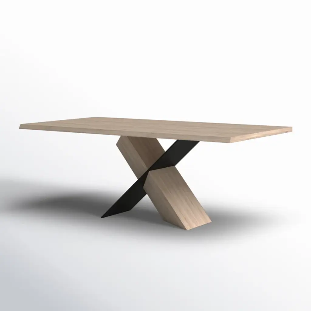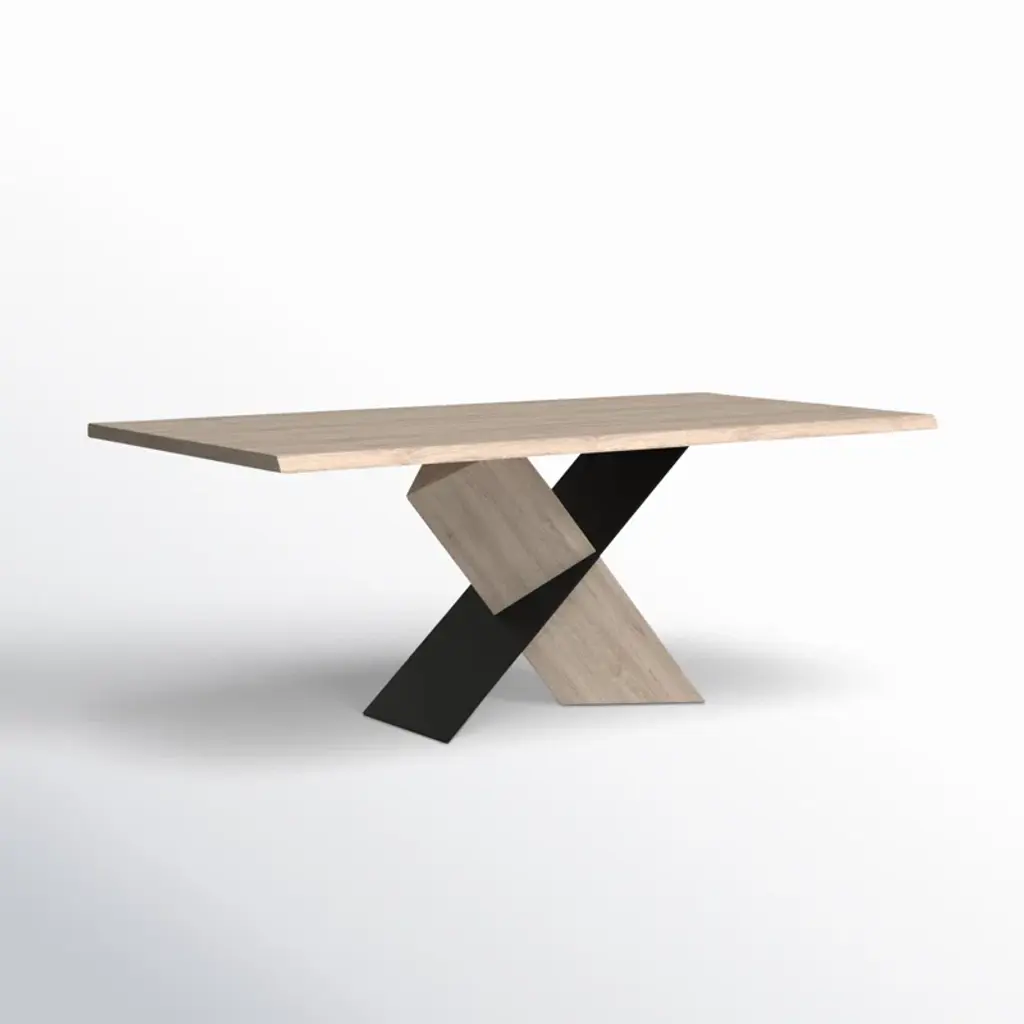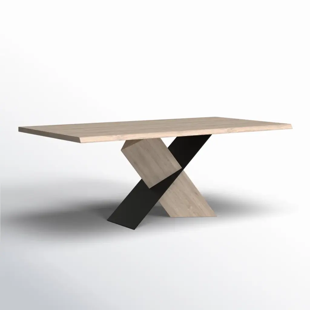 This dining table plays with shadow, structure, and materials, creating a sculptural look in your dining room. It's made from a blend of solid and engineered wood, with a rectangular surface set on an X-shaped pedestal base. The base has an angular design, where one leg in a matching oak finish to the table top supports the surface at an angle, while the other in a black finish intersects it. This gives it the illusion that the table is floating, and being partially supported by its shadow. We're all about that high-contrast design. Measuring 79'' wide, this table comfortably seats six.