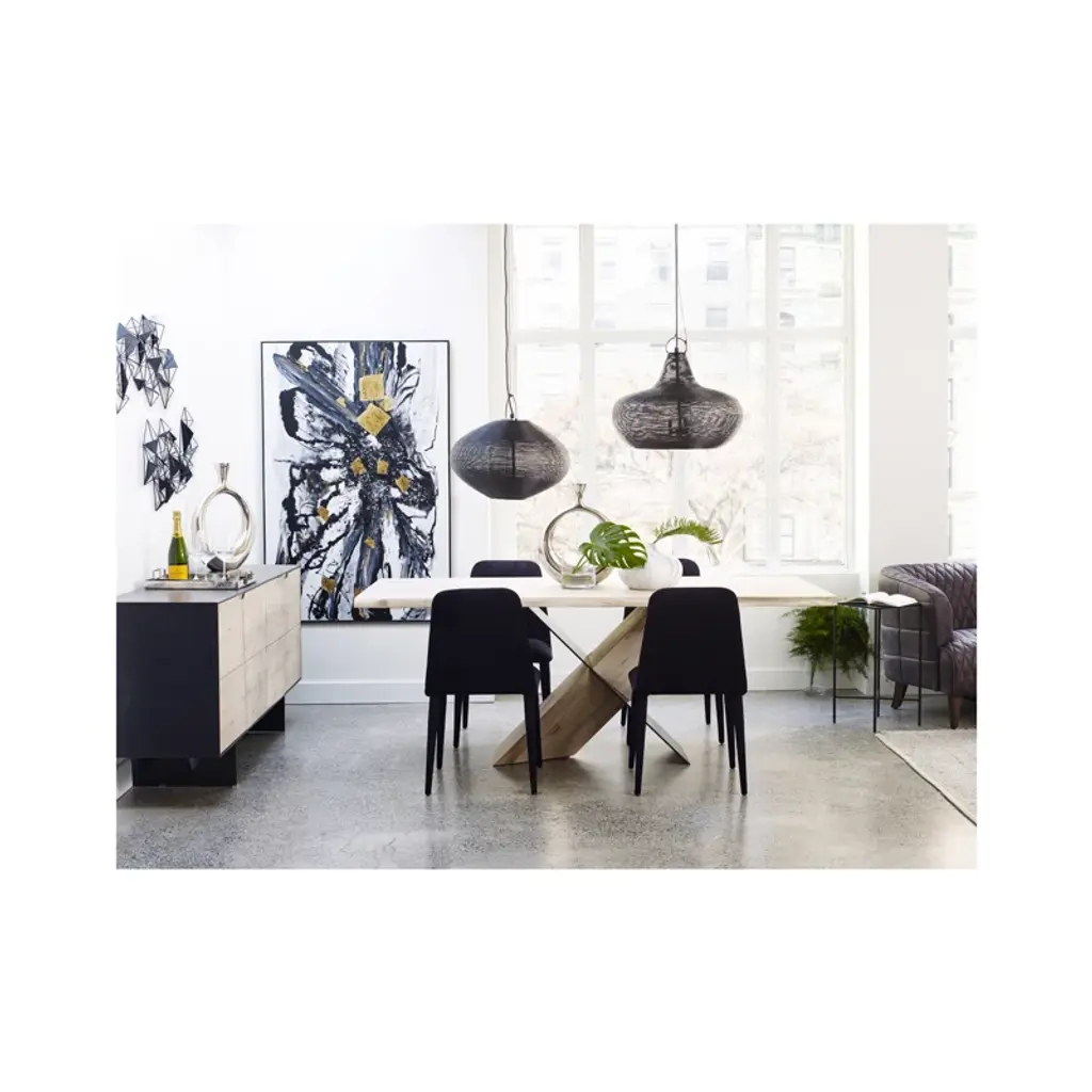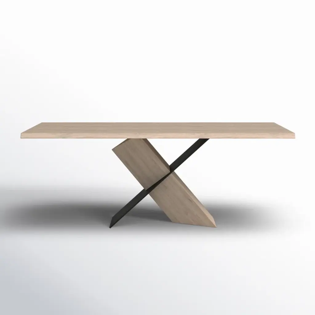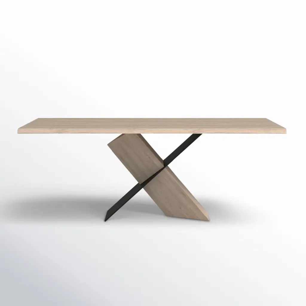 This dining table plays with shadow, structure, and materials, creating a sculptural look in your dining room. It's made from a blend of solid and engineered wood, with a rectangular surface set on an X-shaped pedestal base. The base has an angular design, where one leg in a matching oak finish to the table top supports the surface at an angle, while the other in a black finish intersects it. This gives it the illusion that the table is floating, and being partially supported by its shadow. We're all about that high-contrast design. Measuring 79'' wide, this table comfortably seats six.