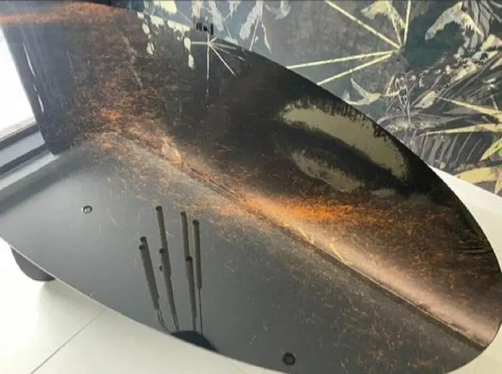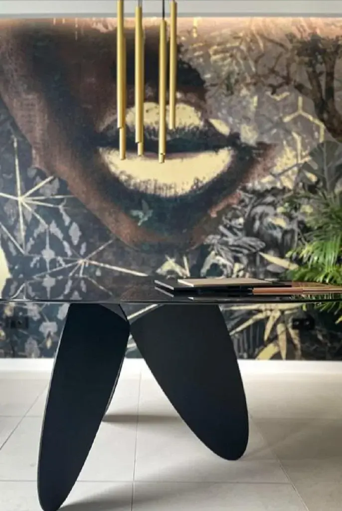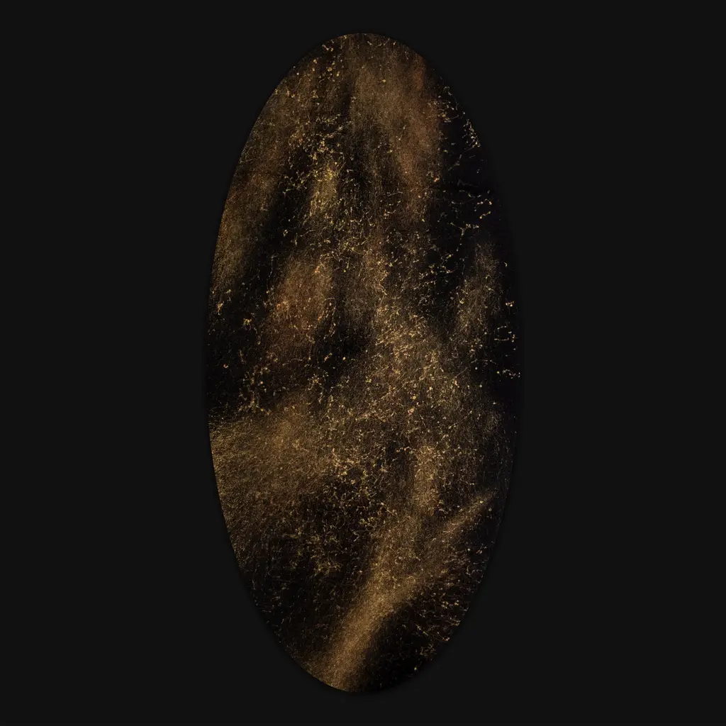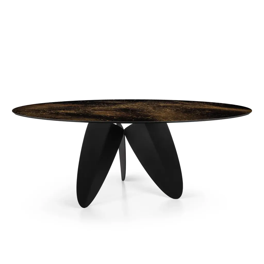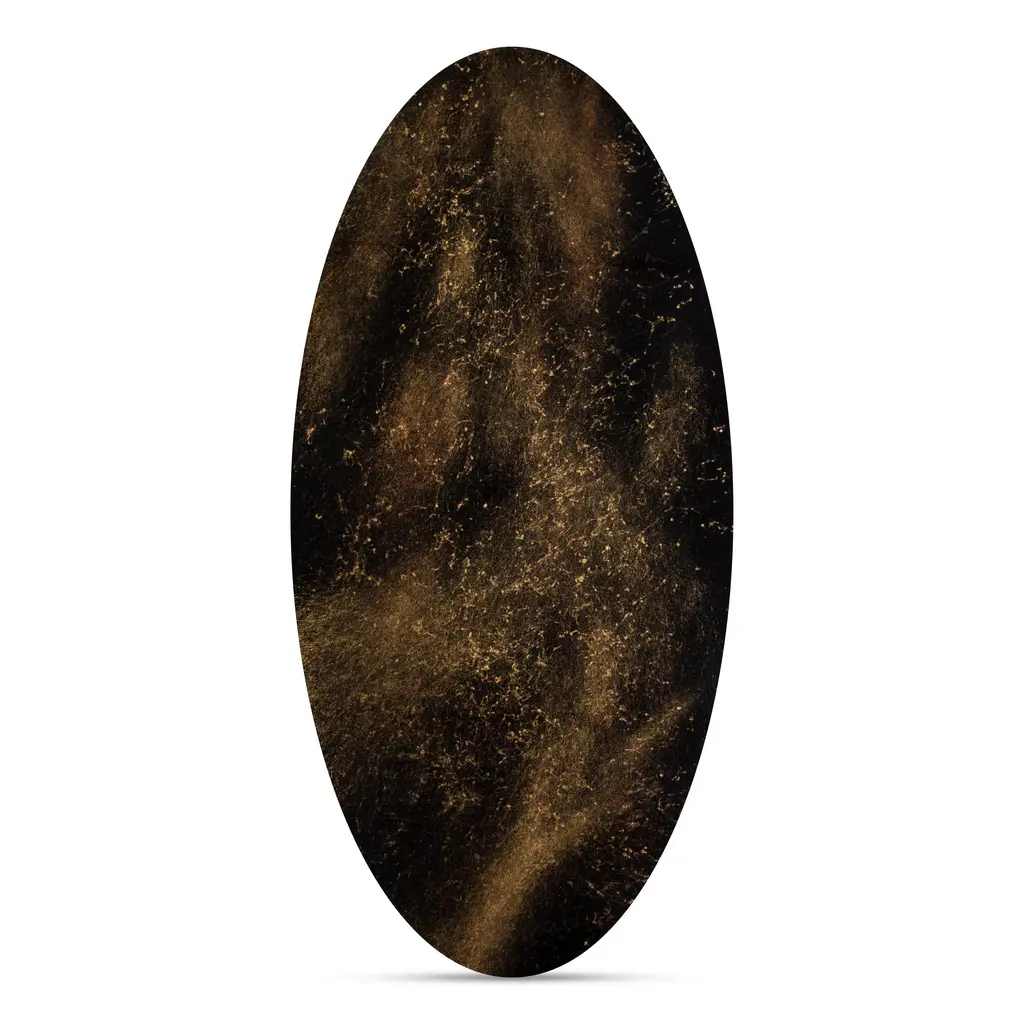 Unique, oval shaped dining table. The table top contains metal particles under the varnished top coat, which gives amazing visual effects depending on the position and light exposure. The top is painted in a very high gloss, several layers provide visual depth and very high resistance to damage. Solid, metal table base ensures proper stability. Black matte powder coat ensures very high scratch resistance. Stamped by Maker