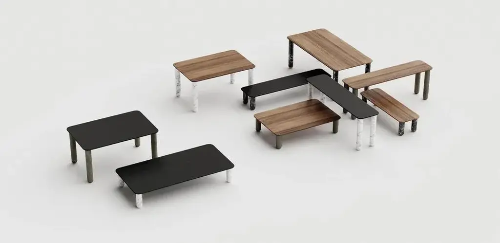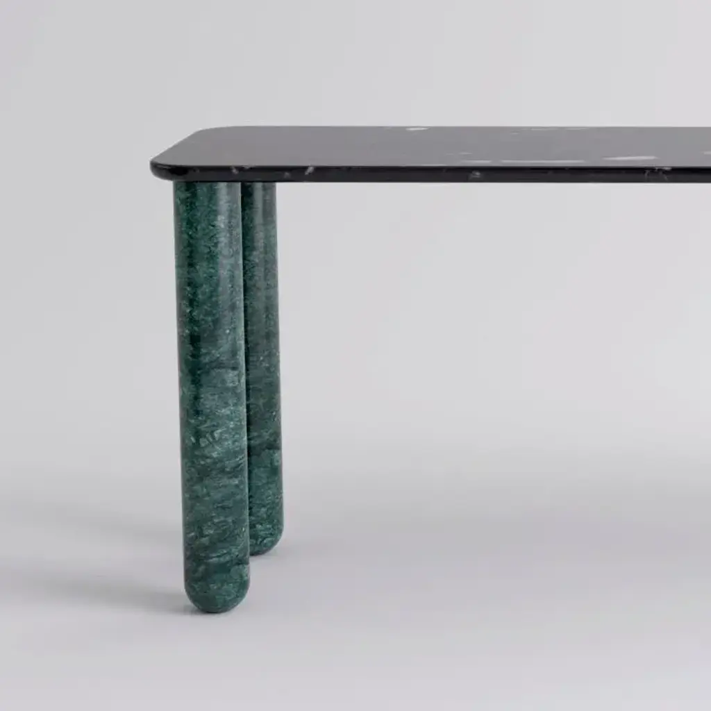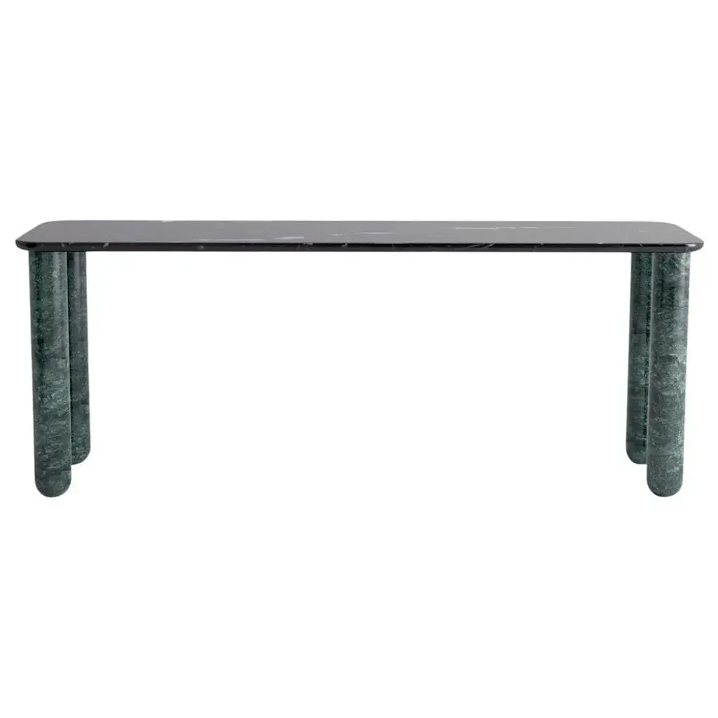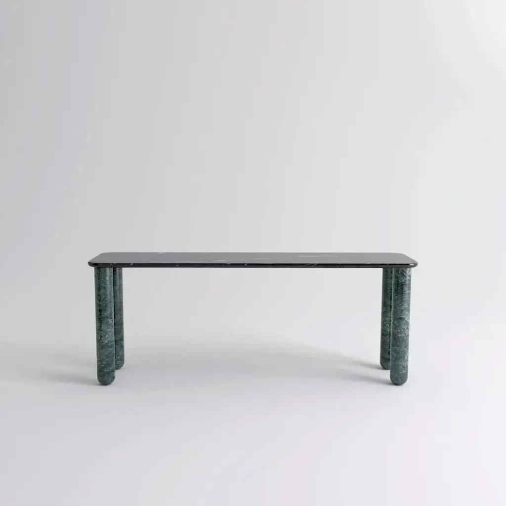 Large black and green marble "Sunday" dining table - Jean-Baptiste Souletie Dimensions: 200 W x 50 D x 74.5 H cm Materials: Indian Green marble legs, Black Marquina marble top. Different finishes and sizes are available. Sunday is a family of dinner tables, coffee tables and consoles with a simple and sculptural design. The mix of heavy marble legs and a thin solid wood top creates an interesting contrast while the rounded edges and generous proportions provide a comforting feeling. Sunday is all about the materials: 3 marbles and 2 woods are available in the collection. Sunday comes in a wide variety of dimensions and 2 different marble legs heights to perfectly fit your interior whether you need a small coffee table, a large one, a console, or even a dinner table that will seat 10 guests on a friendly Sunday lunch.