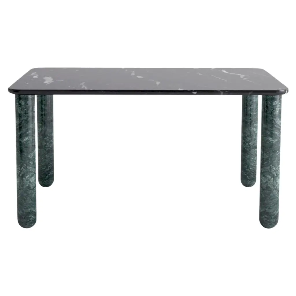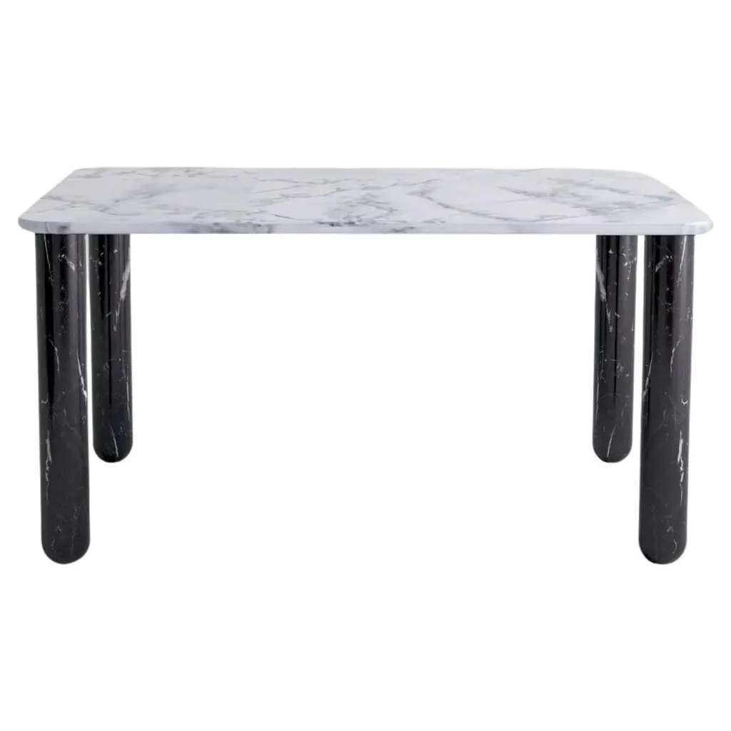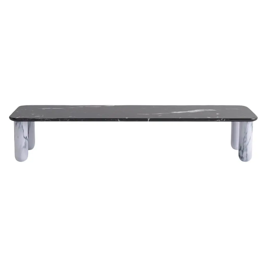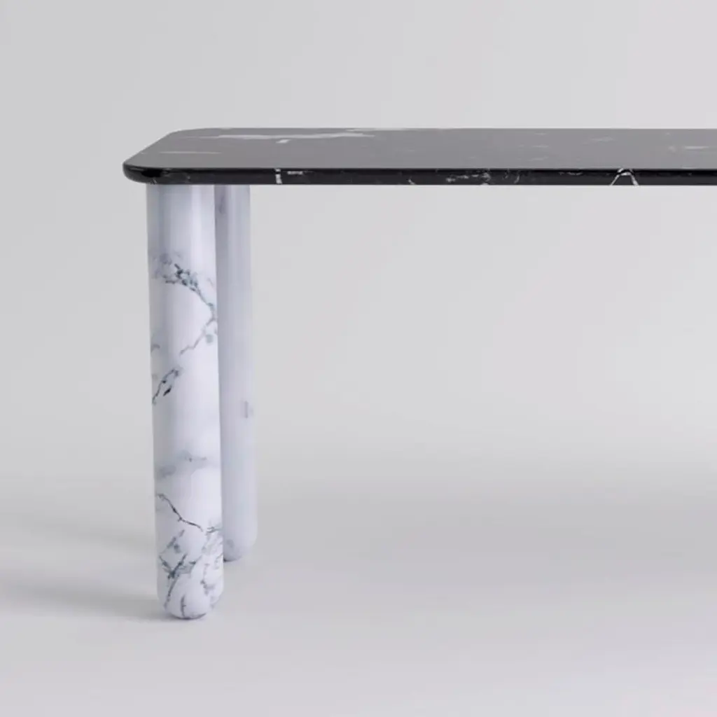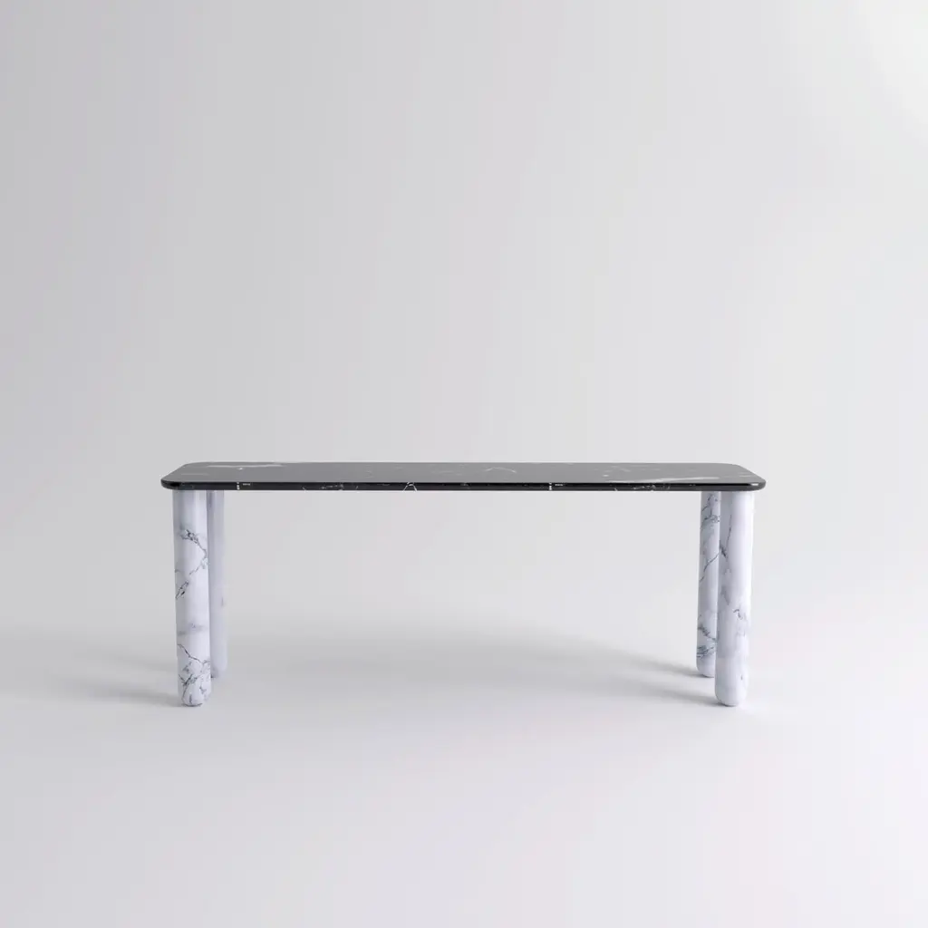 Large black and white marble "Sunday" dining table - Jean-Baptiste SouletieDimensions: 200 W x 50 D x 74.5 H cmMaterials: white Pele de Tigre marble legs, Black Marquina marble top.Different finishes and sizes are available.Sunday is a family of dinner tables, coffee tables and consoles with a simple and sculptural design. The mix of heavy marble legs and a thin solid wood top creates an interesting contrast while the rounded edges and generous proportions provide a comforting feeling.Sunday is all about the materials: 3 marbles and 2 woods are available in the collection.Sunday comes in a wide variety of dimensions and 2 different marble legs heights to perfectly fit your interior whether you need a small coffee table, a large one, a console, or even a dinner table that will seat 10 guests on a friendly Sunday lunch.Jean-Baptiste Souletie is the Co-founder of the furniture editor La Chance with Louise Breguet. He studied in India, worked for a merchant bank in London (where he designed their new offices), before working for an investment fund (where he redevised the graphic chart), and in the strategic department of a luxury goods company in Paris. He returned to his first loves, architecture and furniture, when he founded La Chance in 2012.