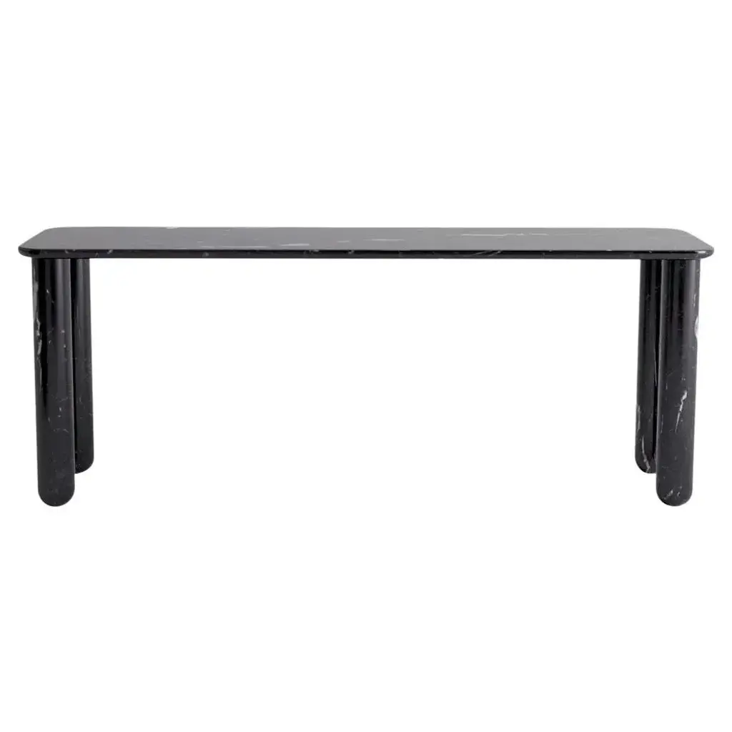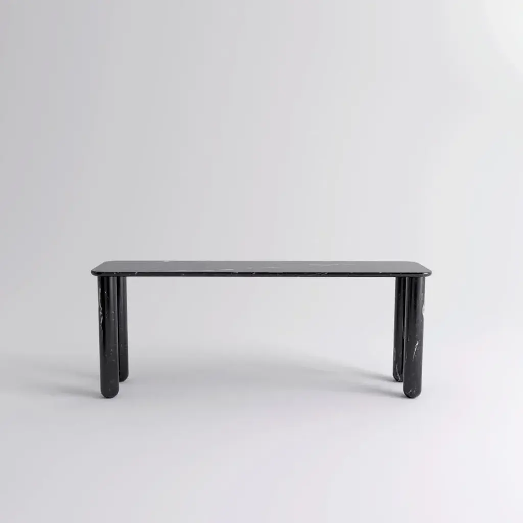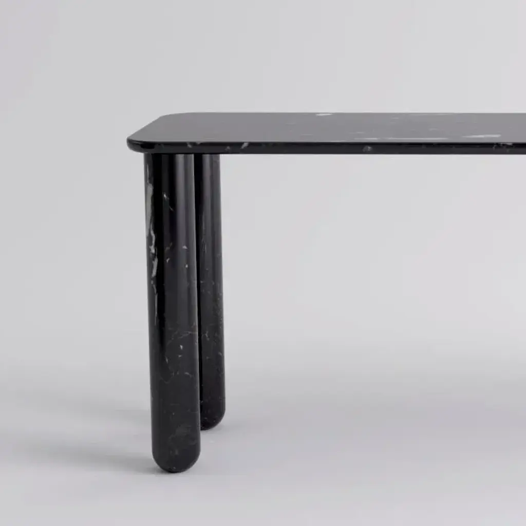 Large Black Marble "Sunday" dining table - Jean-Baptiste Souletie Dimensions: 200 W x 50 D x 74.5 H cm Materials: Black Marquina marble. Different finishes and sizes are available. Sunday is a family of dinner tables, coffee tables and consoles with a simple and sculptural design. The mix of heavy marble legs and a thin solid wood top creates an interesting contrast while the rounded edges and generous proportions provide a comforting feeling. Sunday is all about the materials: 3 marbles and 2 woods are available in the collection. Sunday comes in a wide variety of dimensions and 2 different marble legs heights to perfectly fit your interior whether you need a small coffee table, a large one, a console, or even a dinner table that will seat 10 guests on a friendly Sunday lunch.