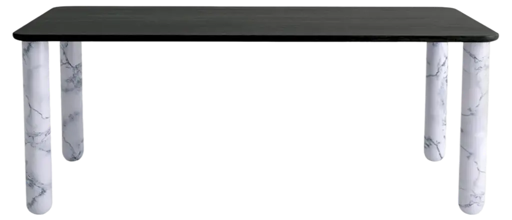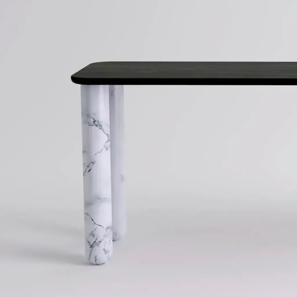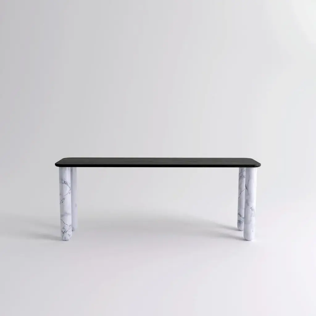 Large black wood and white marble "Sunday" dining table - Jean-Baptiste Souletie Dimensions: 200 W x 50 D x 74.5 H cm Materials: white Pele de Tigre marble legs, black stained wood top. Different finishes and sizes are available. Sunday is a family of dinner tables, coffee tables and consoles with a simple and sculptural design. The mix of heavy marble legs and a thin solid wood top creates an interesting contrast while the rounded edges and generous proportions provide a comforting feeling. Sunday is all about the materials: 3 marbles and 2 woods are available in the collection. Sunday comes in a wide variety of dimensions and 2 different marble legs heights to perfectly fit your interior whether you need a small coffee table, a large one, a console, or even a dinner table that will seat 10 guests on a friendly Sunday lunch.