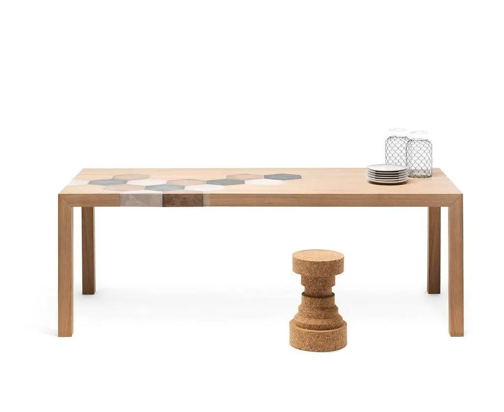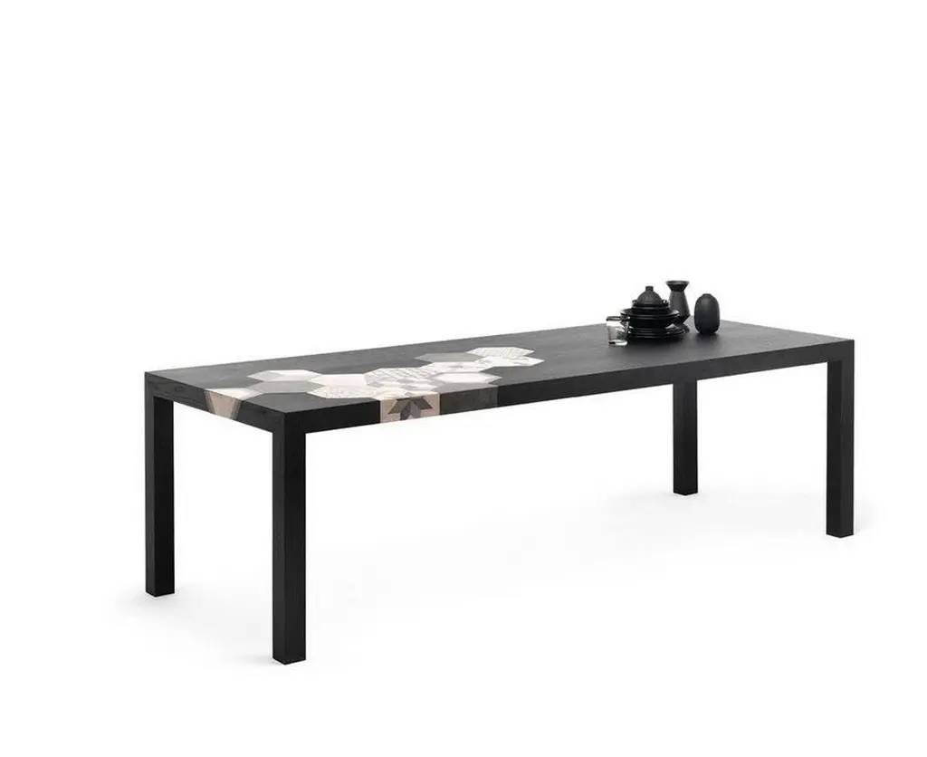 "Cementino is a beautiful table, designed by Uto Balmoral for Mogg. An elegant table made in elmwood, detailed with decorated concrete tiles, available in three sizes and two finishes, natural or black elm.Cementino is a refined table, thought for those who love a decorated style. Cementino reproposes the old but gold architectural style, with the concrete rhomboidal tiles that decorate the top. The combination of the top finish and the tiles decoration is fixed. An elegant table, which becomes the protagonist of your living".