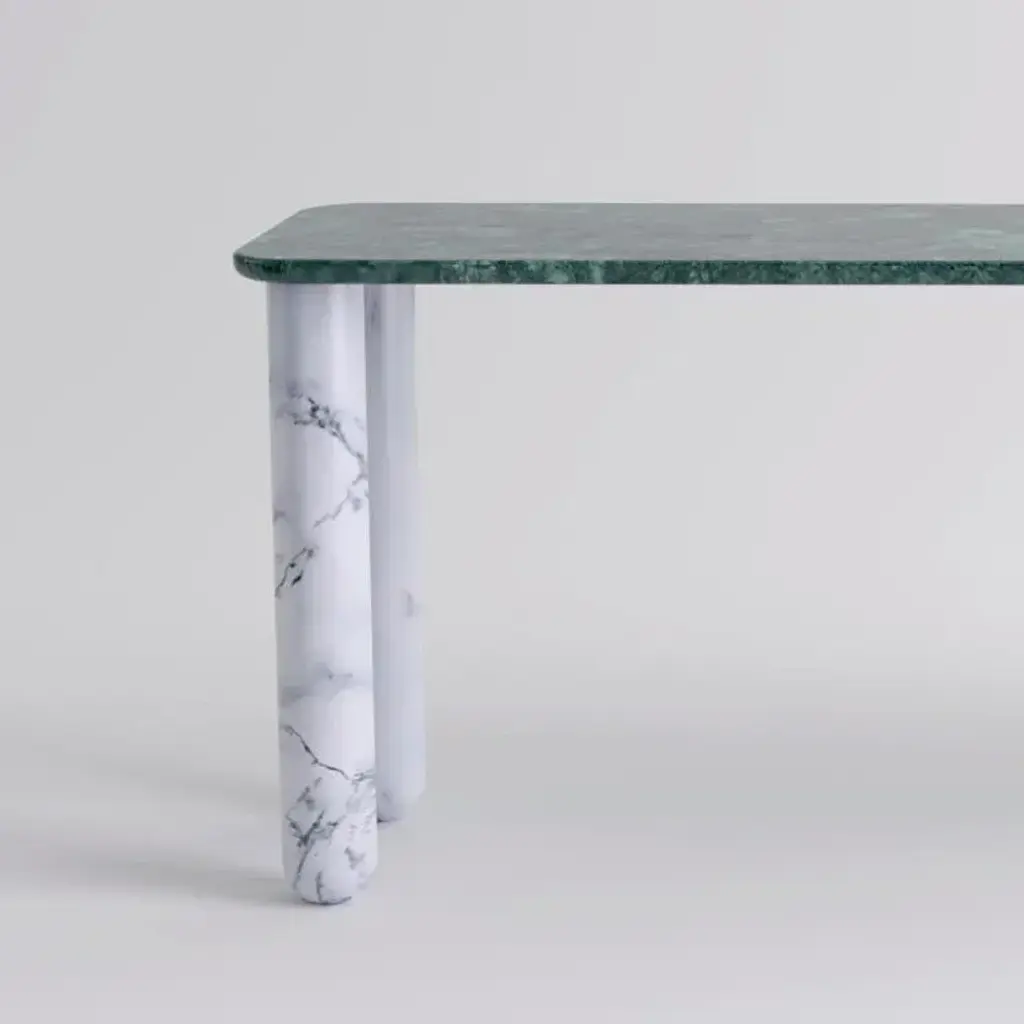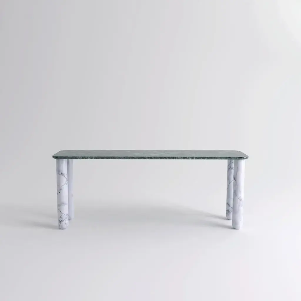 Large Green and White Marble "Sunday" dining table - Jean-Baptiste Souletie Dimensions: 200 W x 50 D x 74.5 H cm Materials: white Pele de Tigre marble legs, Indian Green marble top. Different finishes and sizes are available. Sunday is a family of dinner tables, coffee tables and consoles with a simple and sculptural design. The mix of heavy marble legs and a thin solid wood top creates an interesting contrast while the rounded edges and generous proportions provide a comforting feeling. Sunday is all about the materials: 3 marbles and 2 woods are available in the collection. Sunday comes in a wide variety of dimensions and 2 different marble legs heights to perfectly fit your interior whether you need a small coffee table, a large one, a console, or even a dinner table that will seat 10 guests on a friendly Sunday lunch.