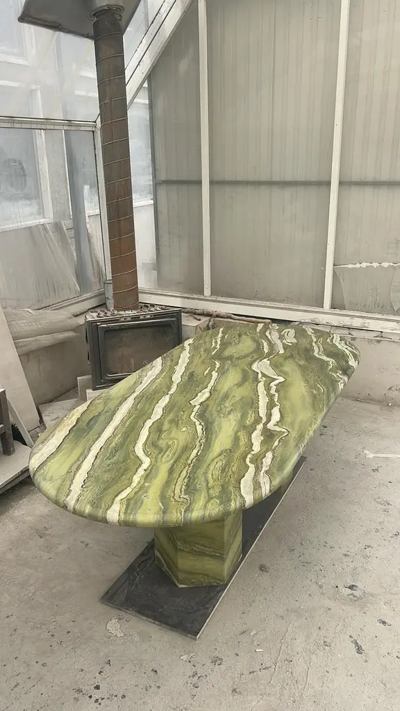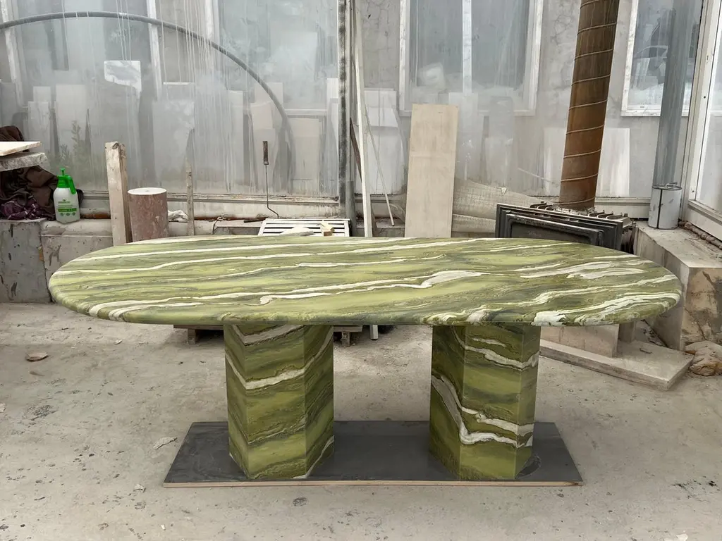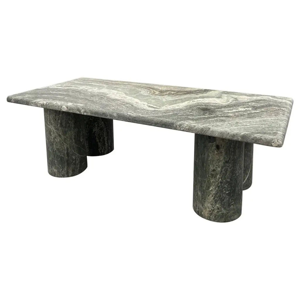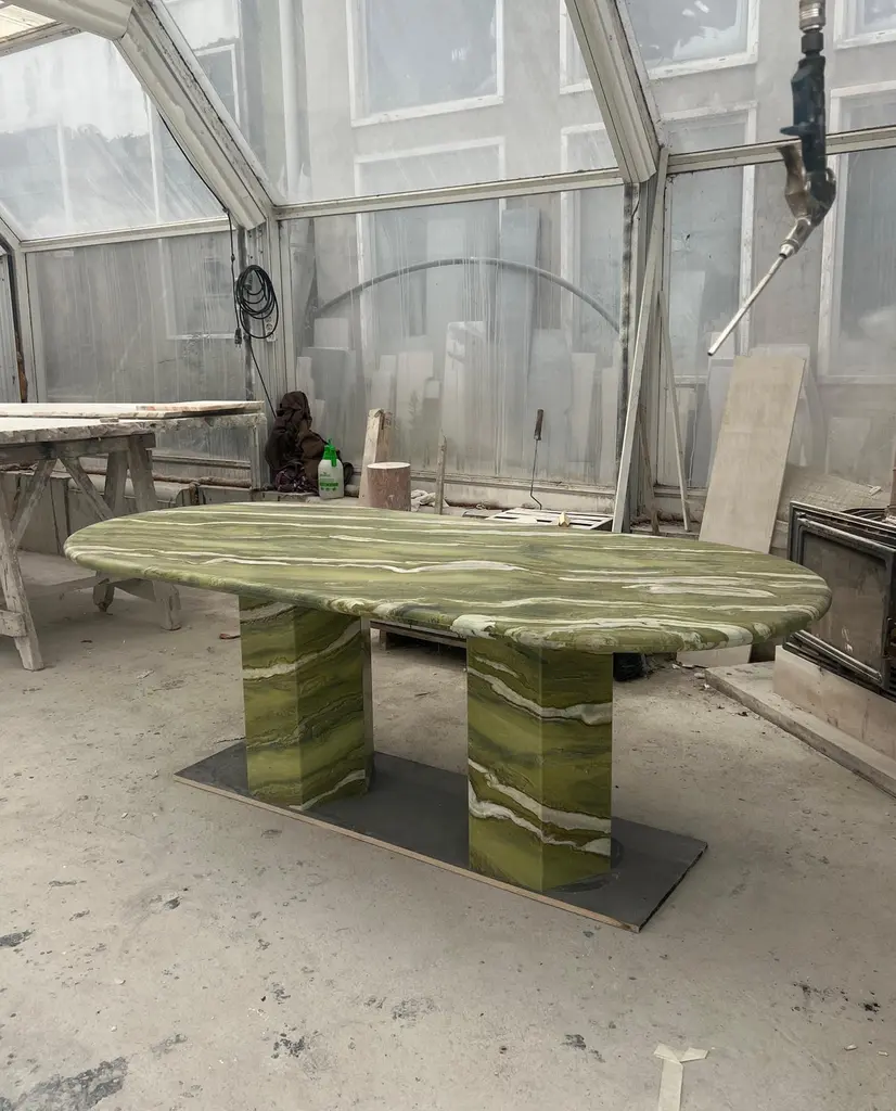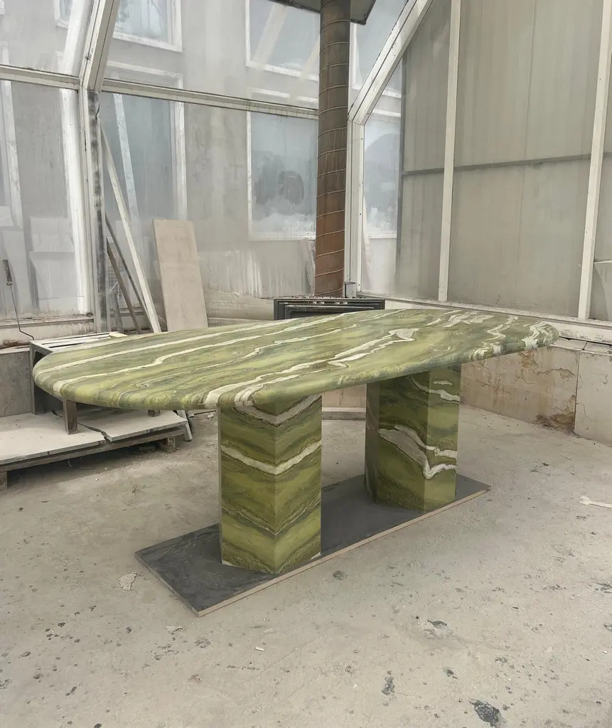 This minimalist table is made from one material, featuring a thick 4cm curved edge top in a beautiful green marble with unique veining that elegantly sits on two hexagon legs, practically positioned to comfortably seat 6 at the table. The honed matt finish is durable and enhances the richness of the beautiful natural colour and vibrant veining. Table Listed: 220x100xH75cmThis item is also available made-to-order in custom dimensions and various natural stones. MY HABITAT DESIGN is a design studio based in Europe. This table collection came to life after interior designer/founder found that sourcing the perfect size/finish/style vintage pieces for her clients and projects was becoming increasingly tricky so she set out to create a collection of tables that still upheld the solid forms and sculptural shapes she was always hunting for. MY HABITAT DESIGN works closely with stone artisans to create a collection of stone tables combining traditional techniques and a rare way of working with solid stone.