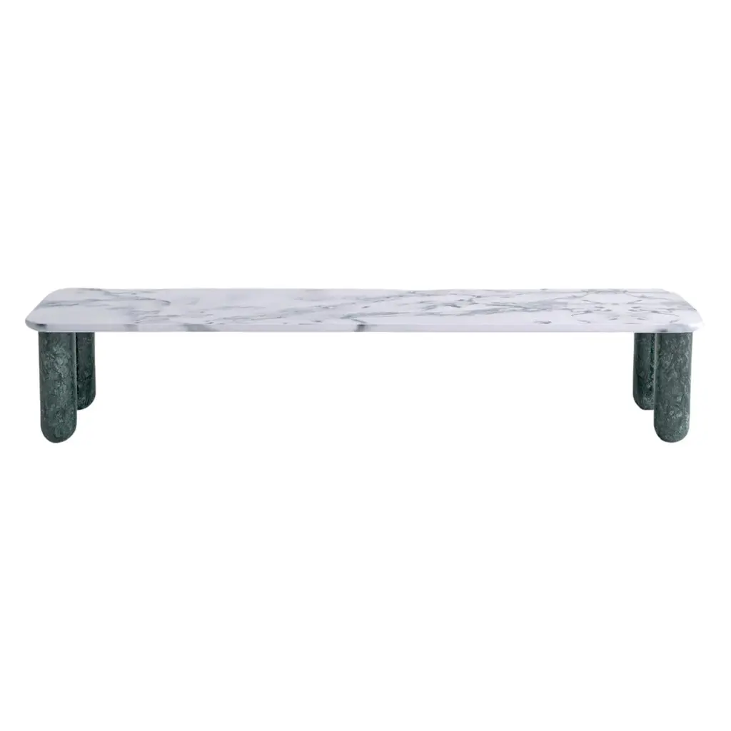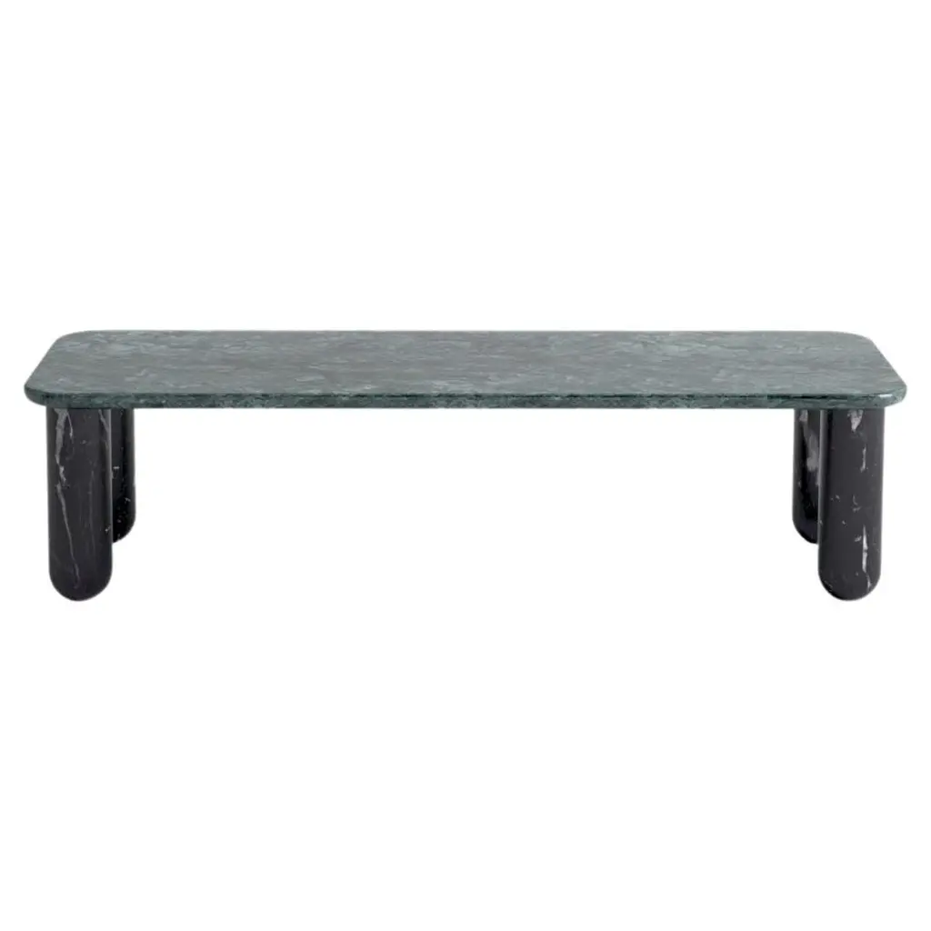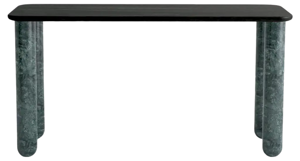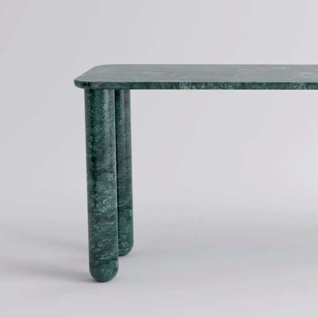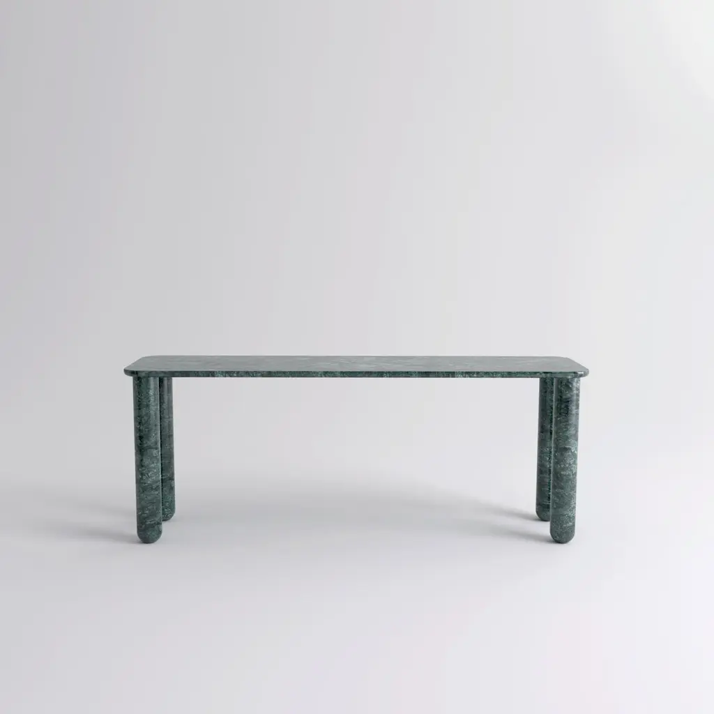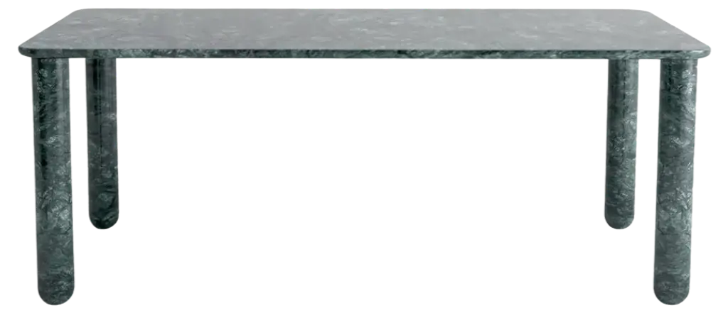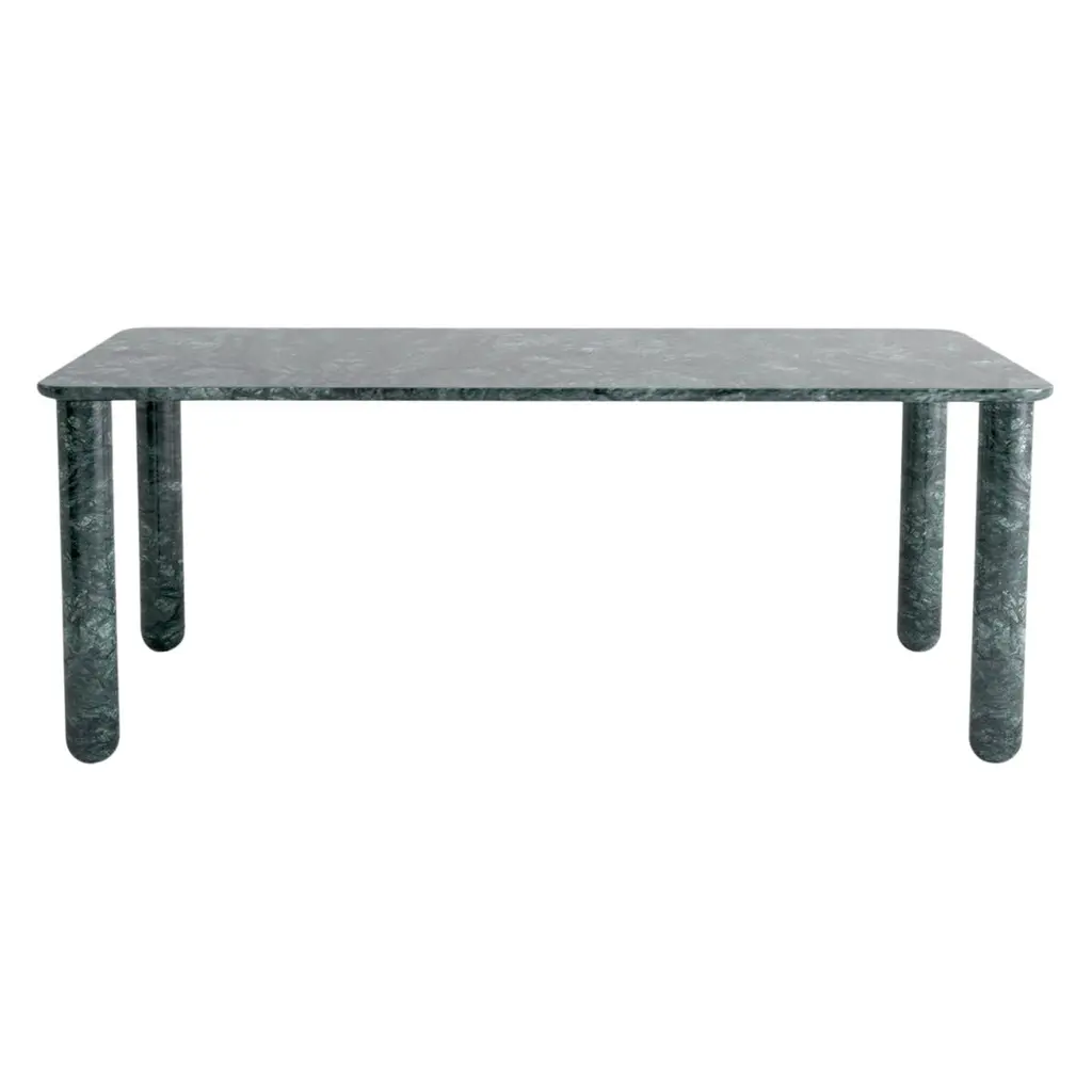 Large green marble "Sunday" dining table - Jean-Baptiste SouletieDimensions: 200 W x 50 D x 74.5 H cmMaterials: Indian Green marble.Different finishes and sizes are available.Sunday is a family of dinner tables, coffee tables and consoles with a simple and sculptural design. The mix of heavy marble legs and a thin solid wood top creates an interesting contrast while the rounded edges and generous proportions provide a comforting feeling.Sunday is all about the materials: 3 marbles and 2 woods are available in the collection.Sunday comes in a wide variety of dimensions and 2 different marble legs heights to perfectly fit your interior whether you need a small coffee table, a large one, a console, or even a dinner table that will seat 10 guests on a friendly Sunday lunch.Jean-Baptiste Souletie is the Co-founder of the furniture editor La Chance with Louise Breguet. He studied in India, worked for a merchant bank in London (where he designed their new offices), before working for an investment fund (where he redevised the graphic chart), and in the strategic department of a luxury goods company in Paris. He returned to his first loves, architecture and furniture, when he founded La Chance in 2012.