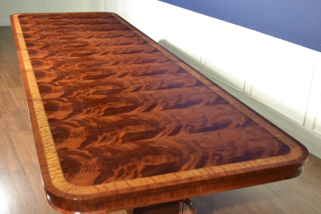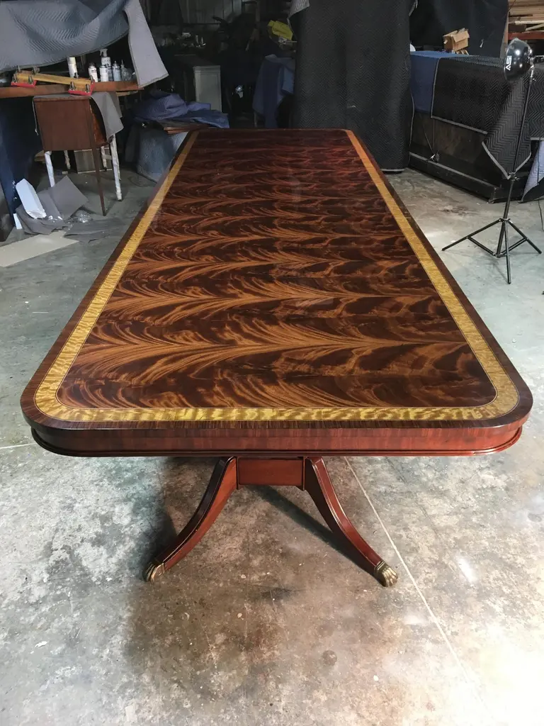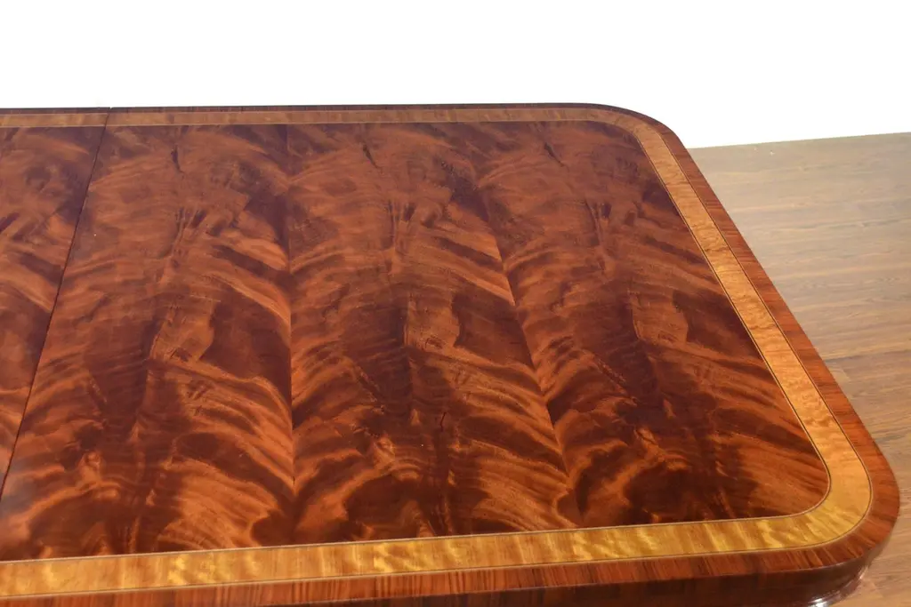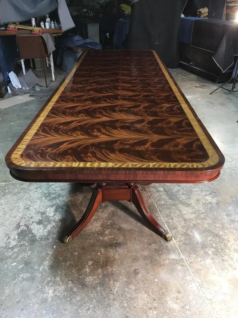 This is a made-to-order Large Traditional mahogany banquet/dining table made in the Leighton Hall shop. It features a field of slip-matched swirly crotch mahogany from west Africa and satinwood and santos rosewood borders from South America. It has a hand rubbed and polished semigloss finish. The birdcage style pedestal has four columns with fluted legs which terminate with antique brass lions paw feet. Dimensions: 52 in. x 88 in. With three 24 in. Leaves (total length with leaves inserted is 160 in..) This table can be purchased as shown, or it can be customized to you desired size and design. We can make you a bench-made, one-of-a-kind table in our shop to your specifications. Various lengths and widths available. Optional borders include: burled walnut, straight grain mahogany, movingi, and more. Other options available. Price will vary depending upon options. Estimated production time is 60-90 days.
