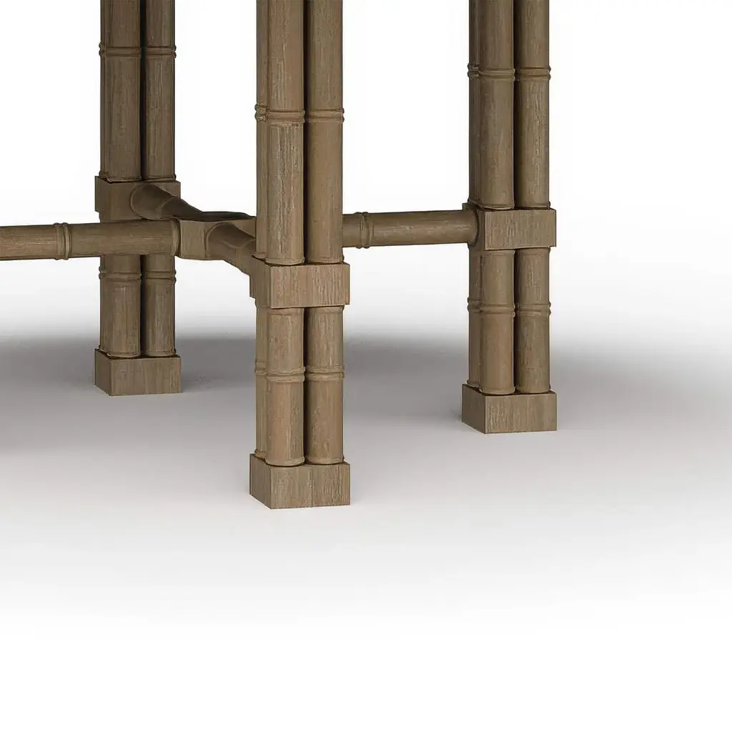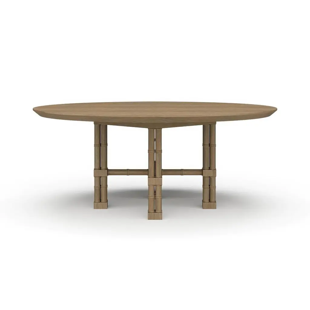 Hand-carved from mahogany and shown in our natural sandbar finish, this statement table features faux bamboo legs in the form of classic English cluster columns, joined by an X-form stretcher that adds both stability and architectural flair.The round top rests on a beautifully sculpted base that evokes the graceful tropical luxury of vintage Palm Beach interiors. Designed to bring charm and character to coastal, regency, or transitional spaces, it serves as an inviting centerpiece for casual meals and formal gatherings alike. This piece reflects elevated craftsmanship while exuding warmth, ease, and historic detail.Dimensions: 72" W x 72" D x 30" HThis finish requires bleaching, which often leads to variation in wood color.Custom finish options are also available. Contact us to learn more.Lead time 20 - 24 weeks.