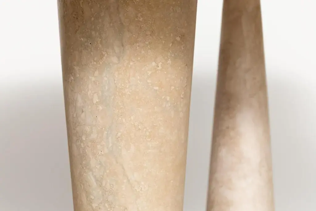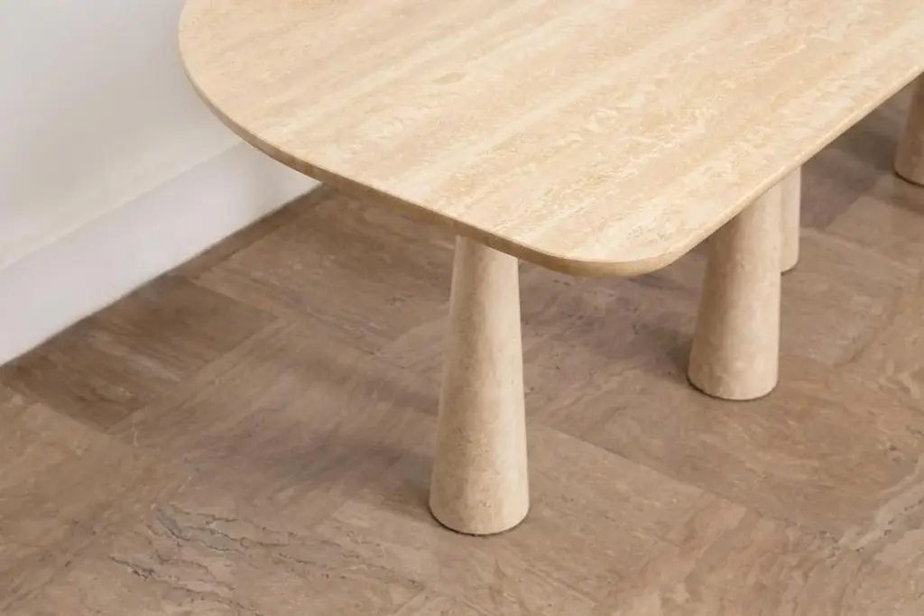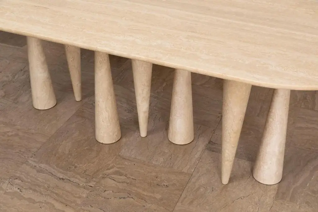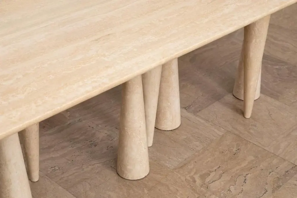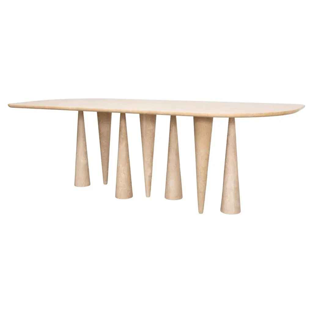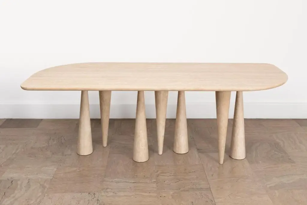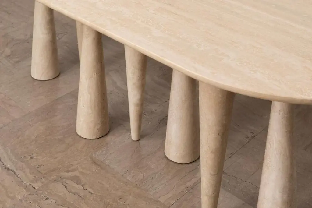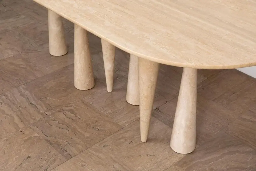 Silvia large dining table by Moure Studio Dimensions: D220 x W85 x H80 cm Materials: Travertine Also available in different dimensions. Dining table made of travertine. Silvia translates its mineral inspiration into abstract shapes which leaves a great space to imagination : some will see a snowy forest, others will see an animal wandering or even maybe stalactites\. Moure / Studio is a Parisian interdisciplinary design studio founded in 2015 and specialised in interior design and furniture design. At Moure / Studio, we believe that emotion and confort arise from color and material, with sober design. This style is inspired by painting and artistics movements such as as the Bauhaus, De Stijl & the Memphis movement. We like to create sensitive atmospheres through exclusive sleek design which respects the architectural volumes and spotlights the vibration of color. Our ethics lead us to collaborate with craftsmen and women who share with us their know-how. We are convinced that enrichment requires the pooling of several talents. Our passion for sharing and being open to the world pushes us towards working on worldwide projects.