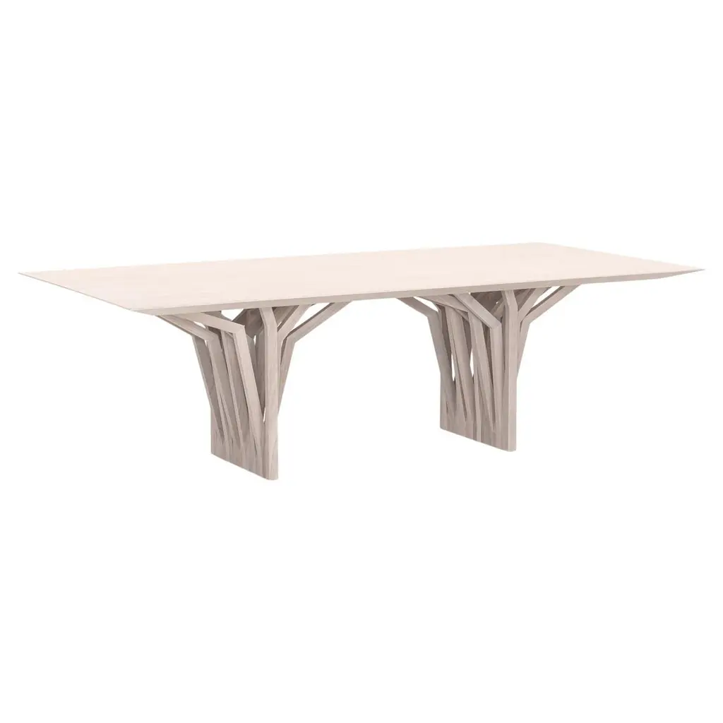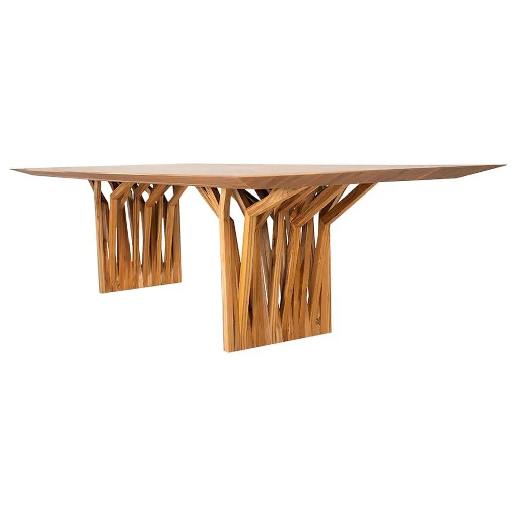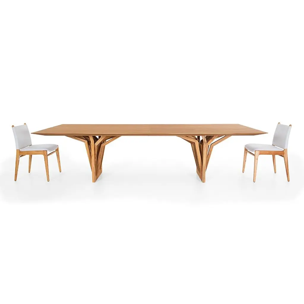 Architectural modern style Rad dining room table with 118-inch wide teak wood veneered top and solid wood roof and cascading root trees inspired base. The Radi dining table by Uultis is a captivating blend of modern design and sustainable craftsmanship, embodying the perfect harmony between form and function. The table's top, crafted from teak wood veneer, radiates warmth and natural beauty, while the base, inspired by the structure of original roofing anchors, adds a unique, architectural flair. This thoughtful combination of materials and design elements ensures that the table not only stands out aesthetically but also aligns with environmentally responsible practices, making it a conscious choice for the modern home.The Radi dining table's simplicity is its greatest strength, effortlessly enhancing any dining space with personality and sophistication. Its clean lines and contemporary silhouette make it a versatile centerpiece, suitable for a range of interior styles. Whether you are hosting an intimate dinner with family or entertaining guests, the table provides an inviting and stylish setting that encourages memorable gatherings.Available in multiple sizes (please have a look at the variations described), the Radi table can be customized to suit your specific needs, ensuring that it fits perfectly into your dining area. Pair it with Uultis chairs to complete the look, creating a cohesive and elegant dining environment. While assembly is required, the process is made easy with clear, step-by-step instructions included. Transform your dining space into a haven of elegance and sustainable living with the Radi dining table, a piece that promises not just functionality but a timeless appeal that will elevate your dining experience for years to come.