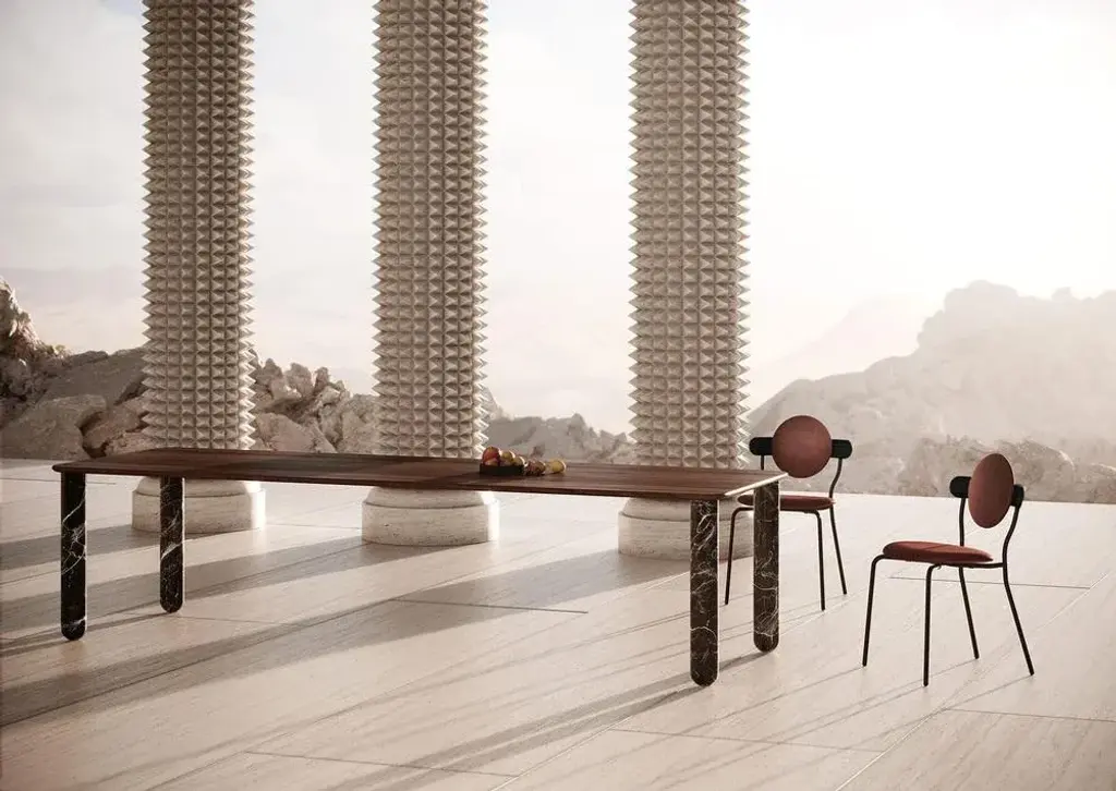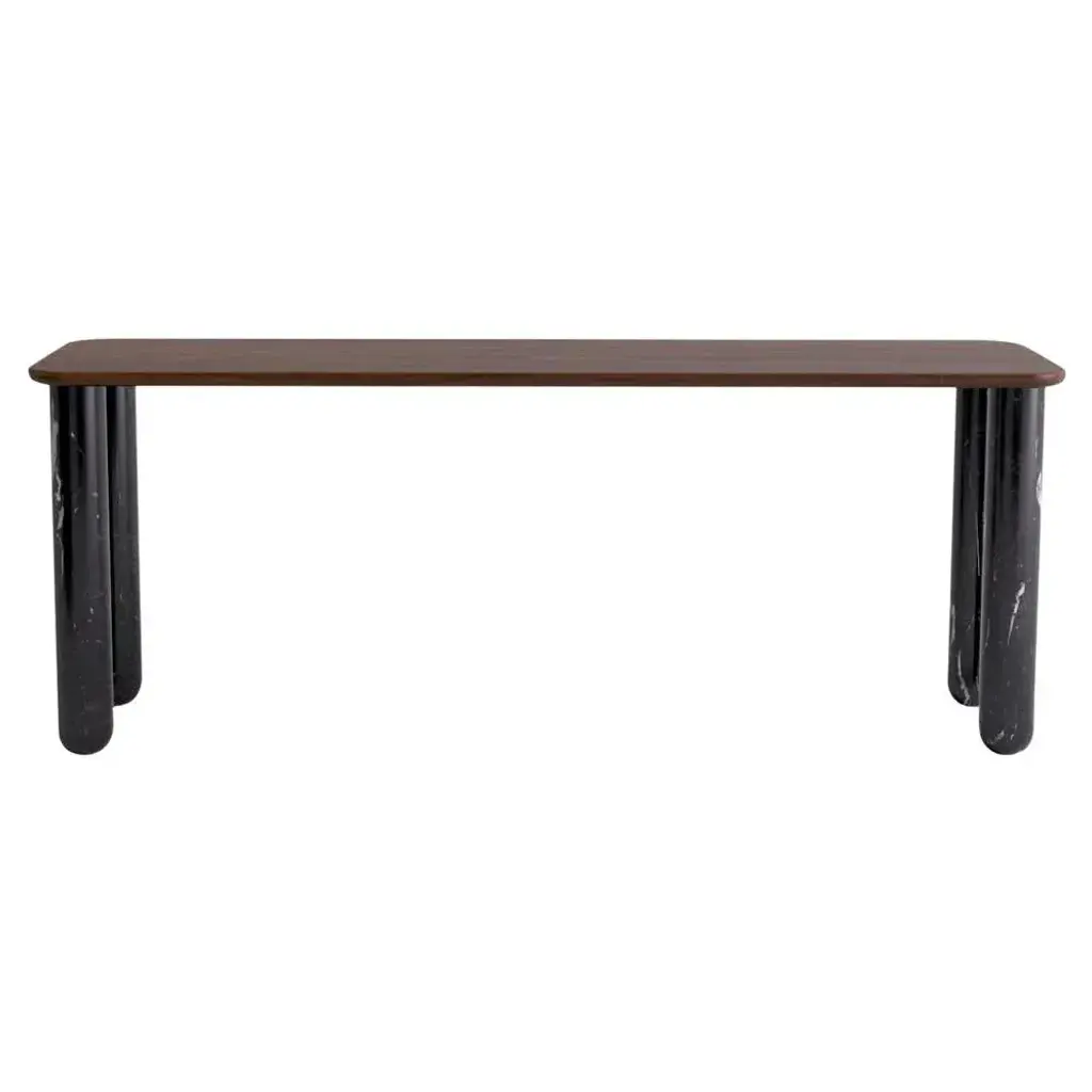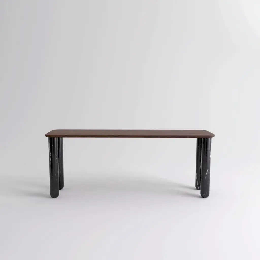 Large Walnut and Black Marble "Sunday" dining table - Jean-Baptiste Souletie Dimensions: 200 W x 50 D x 74.5 H cm Materials: Black Marquina marble legs, walnut wood top. Different finishes and sizes are available. Sunday is a family of dinner tables, coffee tables and consoles with a simple and sculptural design. The mix of heavy marble legs and a thin solid wood top creates an interesting contrast while the rounded edges and generous proportions provide a comforting feeling. Sunday is all about the materials: 3 marbles and 2 woods are available in the collection. Sunday comes in a wide variety of dimensions and 2 different marble legs heights to perfectly fit your interior whether you need a small coffee table, a large one, a console, or even a dinner table that will seat 10 guests on a friendly Sunday lunch.