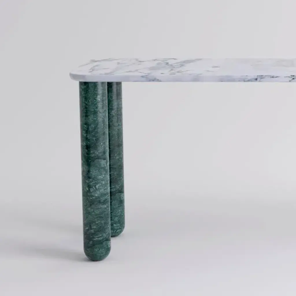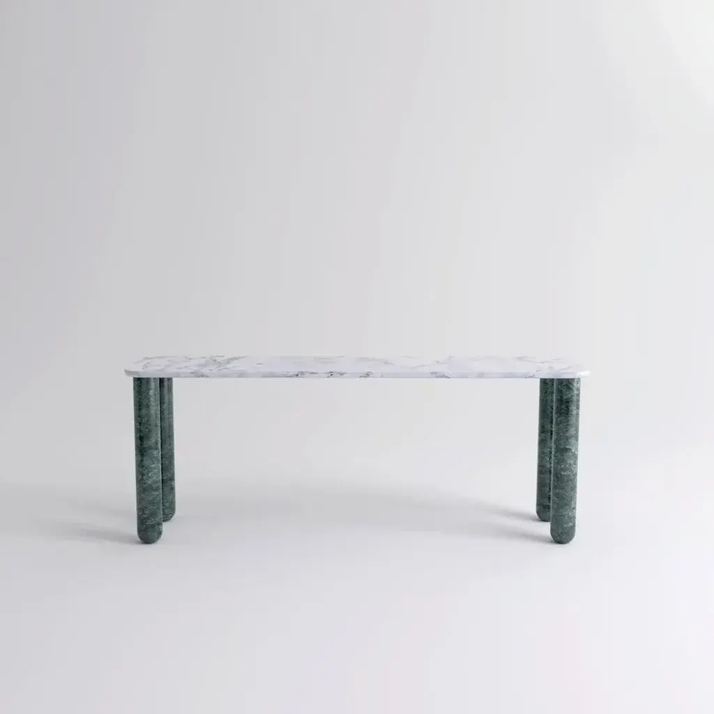Large white and green marble "Sunday" dining table - Jean-Baptiste Souletie Dimensions: 200 W x 50 D x 74.5 H cm Materials: Indian Green marble legs, white Pele de Tigre marble top. Different finishes and sizes are available. Sunday is a family of dinner tables, coffee tables and consoles with a simple and sculptural design. The mix of heavy marble legs and a thin solid wood top creates an interesting contrast while the rounded edges and generous proportions provide a comforting feeling. Sunday is all about the materials: 3 marbles and 2 woods are available in the collection. Sunday comes in a wide variety of dimensions and 2 different marble legs heights to perfectly fit your interior whether you need a small coffee table, a large one, a console, or even a dinner table that will seat 10 guests on a friendly Sunday lunch.