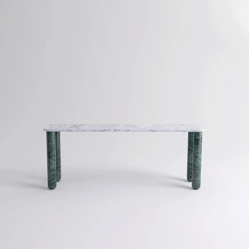 Large white and green marble "Sunday" dining table - Jean-Baptiste SouletieDimensions: 200 W x 50 D x 74.5 H cmMaterials: Indian Green marble legs, white Pele de Tigre marble top.Different finishes and sizes are available.Sunday is a family of dinner tables, coffee tables and consoles with a simple and sculptural design. The mix of heavy marble legs and a thin solid wood top creates an interesting contrast while the rounded edges and generous proportions provide a comforting feeling.Sunday is all about the materials: 3 marbles and 2 woods are available in the collection.Sunday comes in a wide variety of dimensions and 2 different marble legs heights to perfectly fit your interior whether you need a small coffee table, a large one, a console, or even a dinner table that will seat 10 guests on a friendly Sunday lunch.Jean-Baptiste Souletie is the Co-founder of the furniture editor La Chance with Louise Breguet. He studied in India, worked for a merchant bank in London (where he designed their new offices), before working for an investment fund (where he redevised the graphic chart), and in the strategic department of a luxury goods company in Paris. He returned to his first loves, architecture and furniture, when he founded La Chance in 2012.