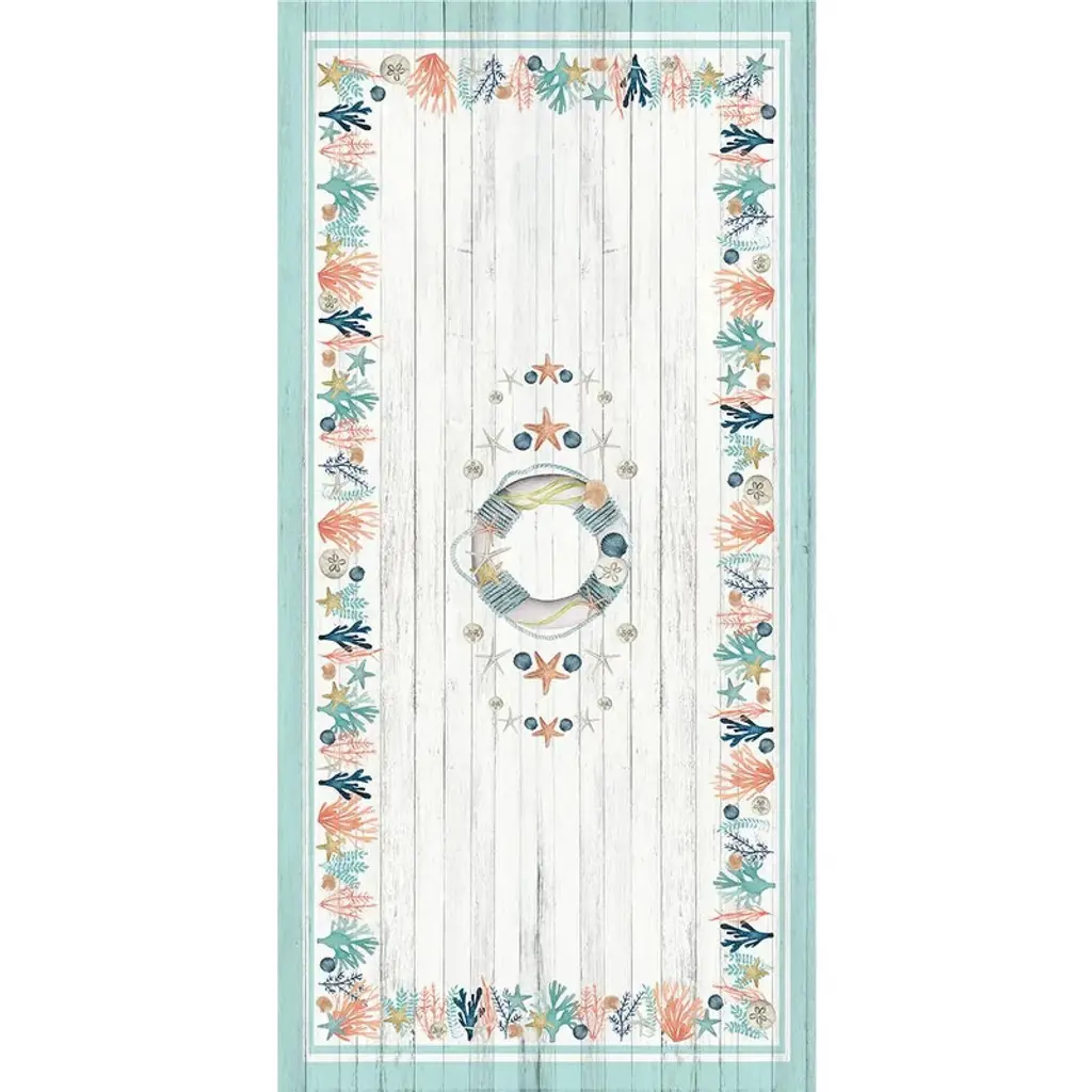 Enhance your dining experience with a beautiful display of deep sea colors, shells, and seaweed. The layout displays coral, turquoise and blue reef life on an off-white shiplap background anchored by a life preserver in the center. The Laural Home Coastal Reef Tablecloth is a great addition for anyone with a sophisticated taste for coastal decor.