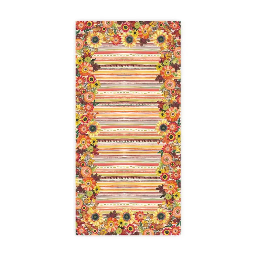 The watercolor collage design of the "Harvest Snippets" tablecloth is sure to bring autumn cheer to your kitchen. This design features a border of autumn foliage, flowers. Stripes in cheery colors of red, green, and yellow create a brilliant centerpiece. You'll love the boho vibes this tablecloth brings to your dining room!